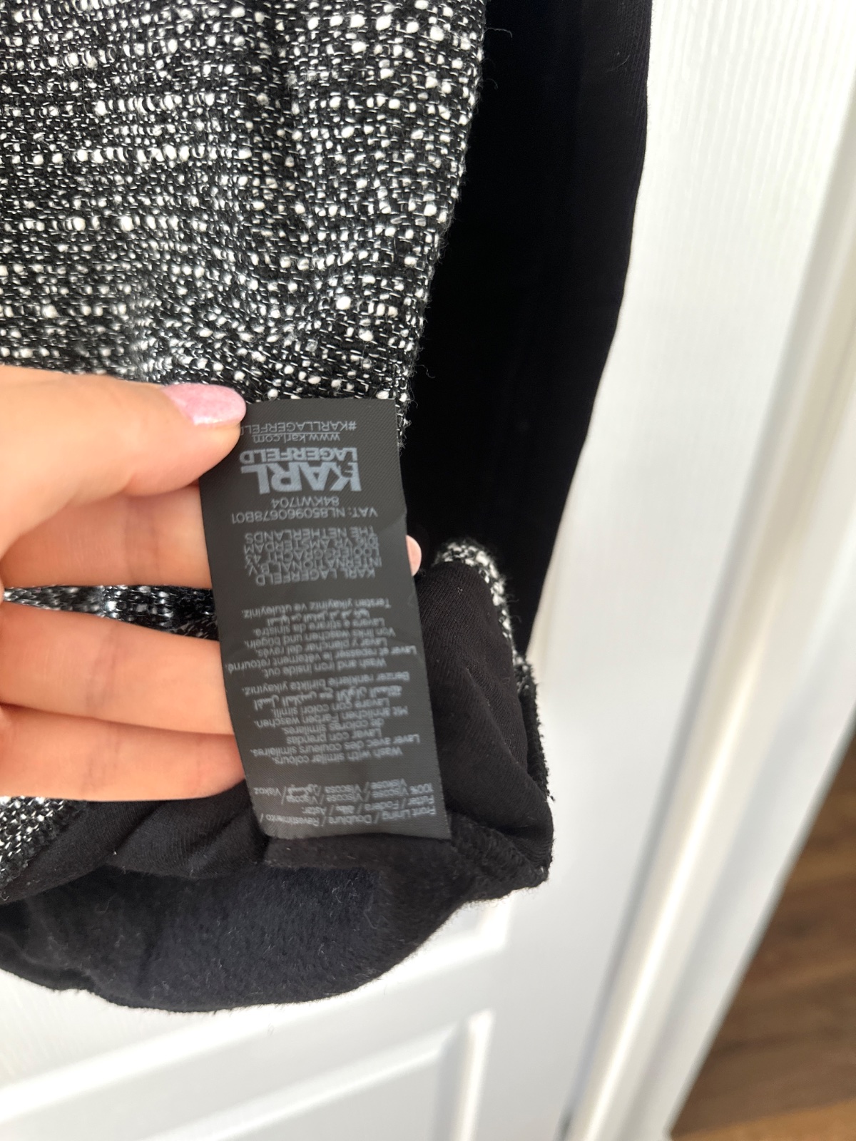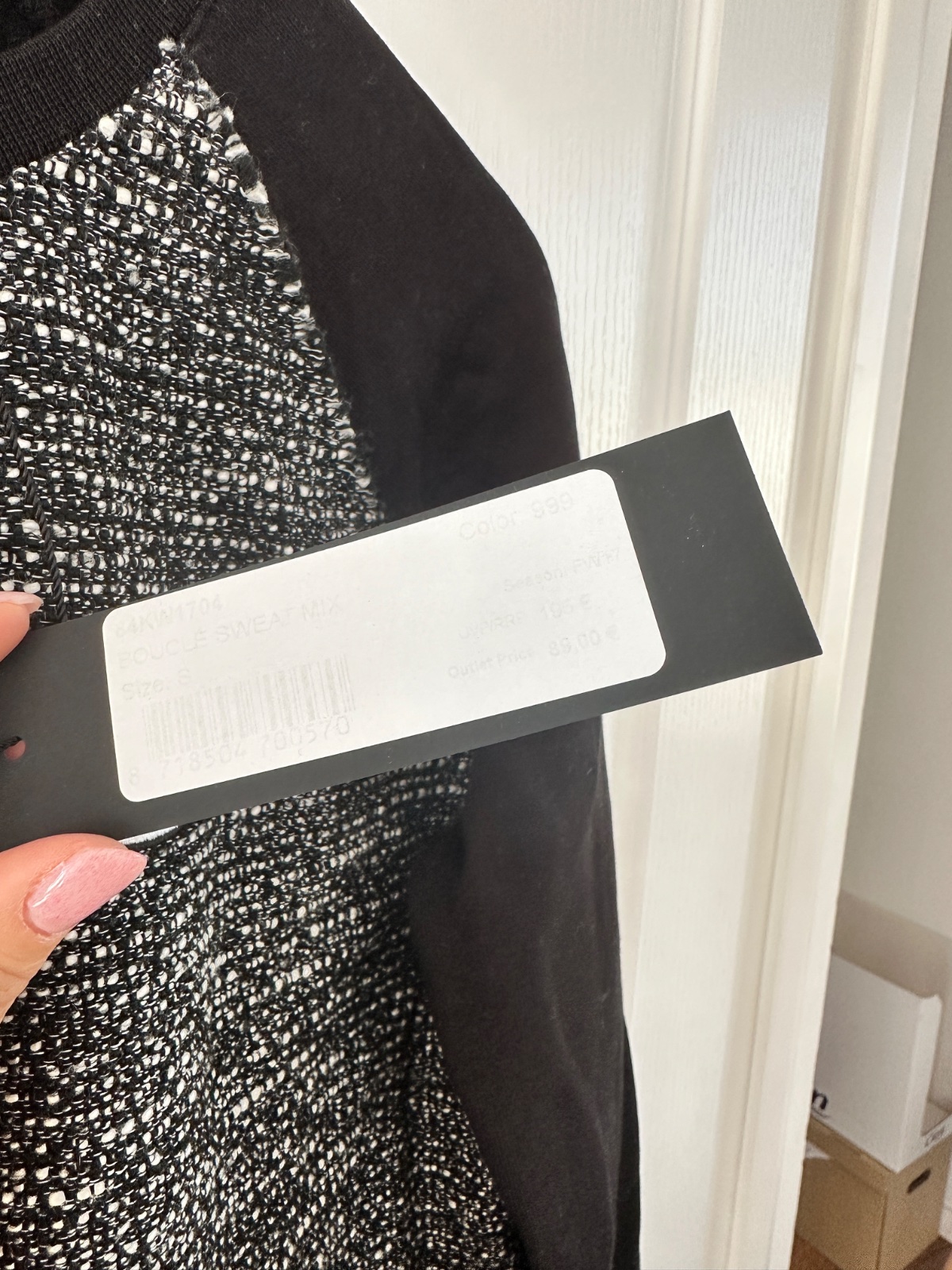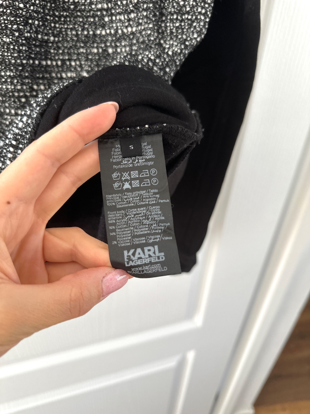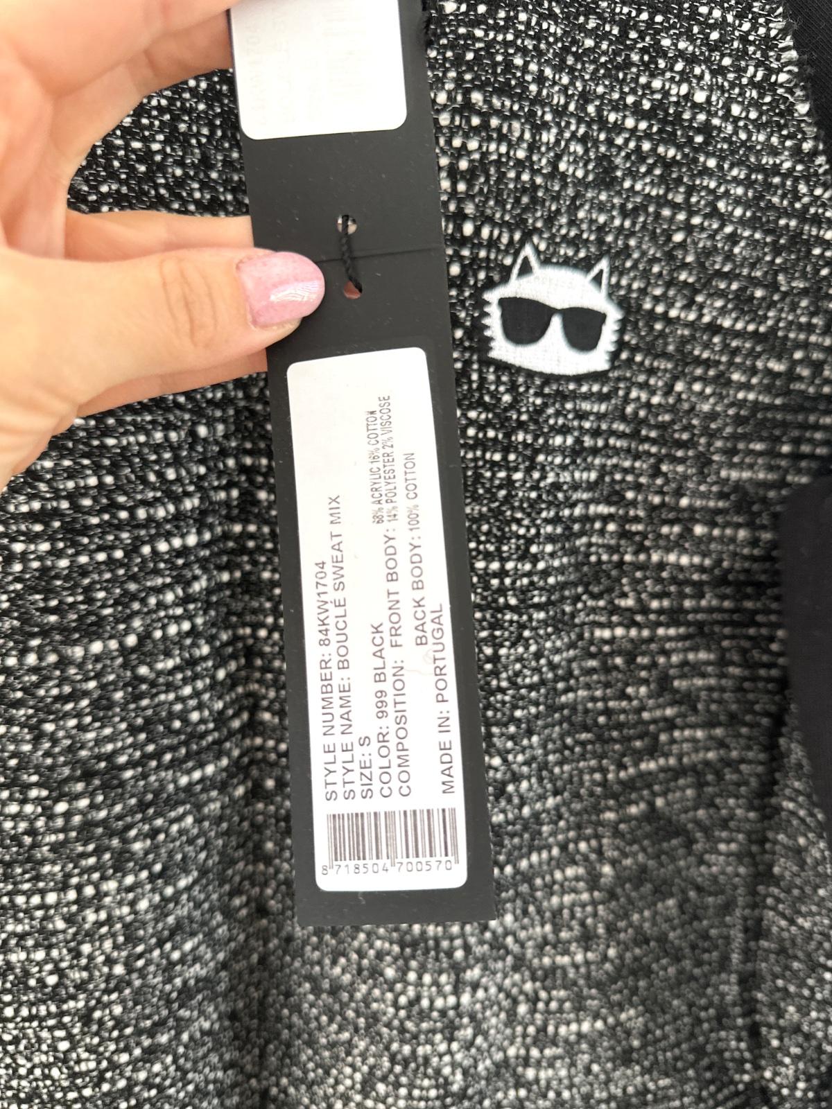 Nová mikina Karl Lagerfeld. Predná strana svetra je v štýle Chanel, to znamená, že je vyrobená z tkaného materiálu v čiernej a bielej farbe. Navyše na pravej strane je charakteristická náplasť v podobe hlavy bielej mačky. Rukávy a chrbát sú z čiernej bavlny. Navyše na zadnej strane pri krku je logo značky v bielej farbe. Mikina má rovný strih. Je veľmi univerzálna, čo znamená, že môže byť stylizovana elegantne alebo športovo. Veľkosť na visačke je S, ale sedí aj na M. Mikina je nová s visačkami. Bola kúpená v predajni Pandorf za 89€.