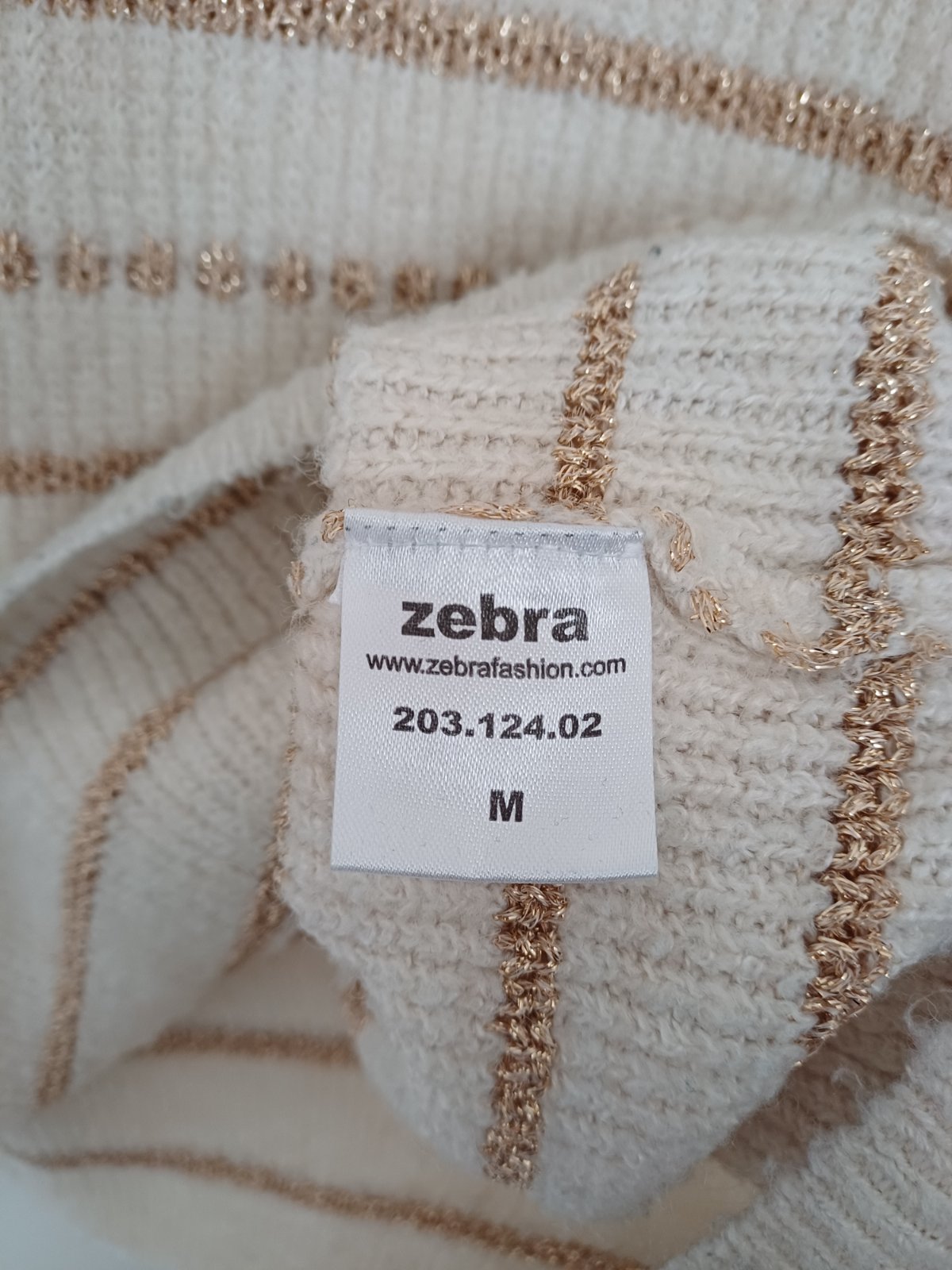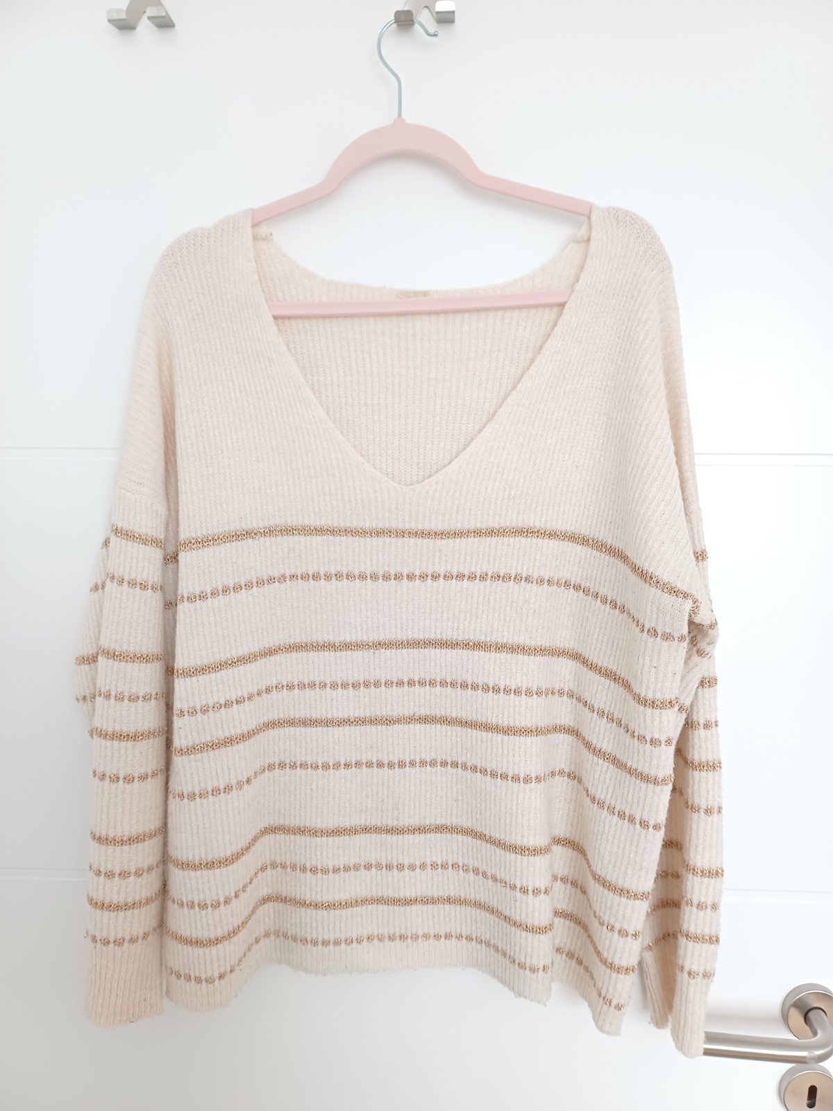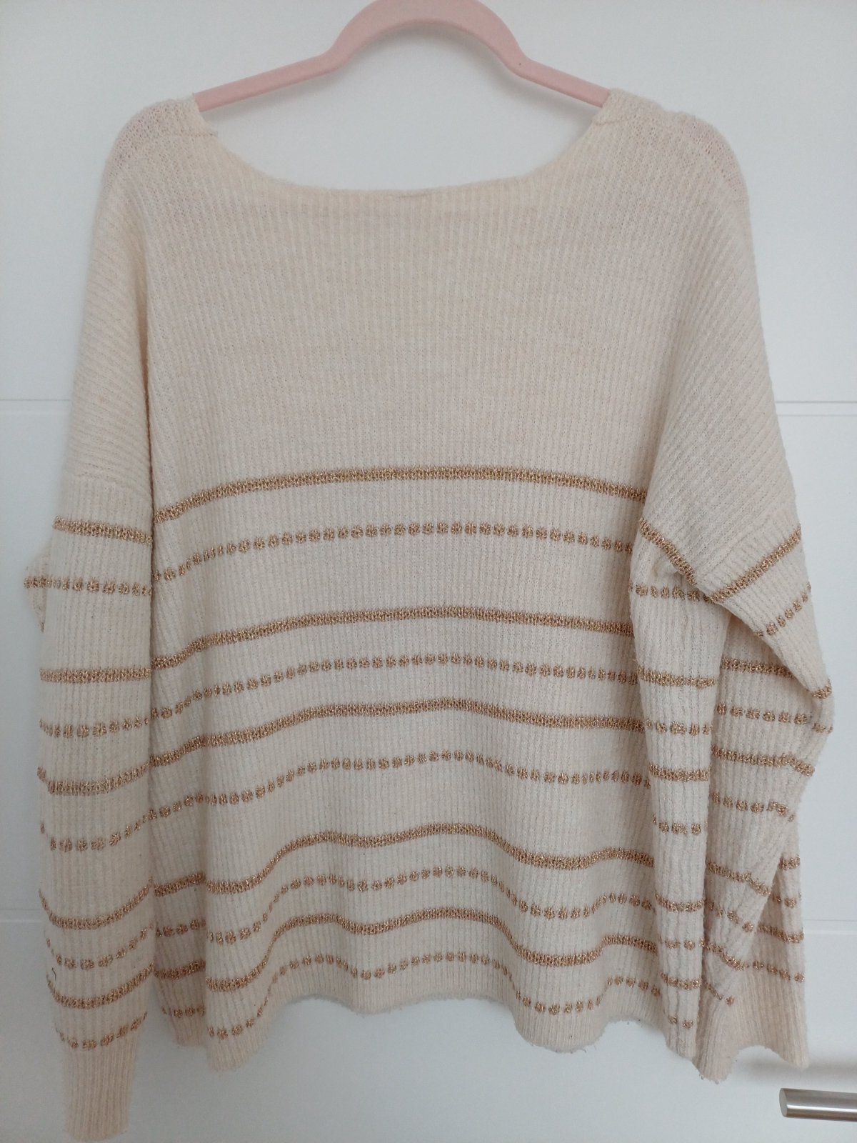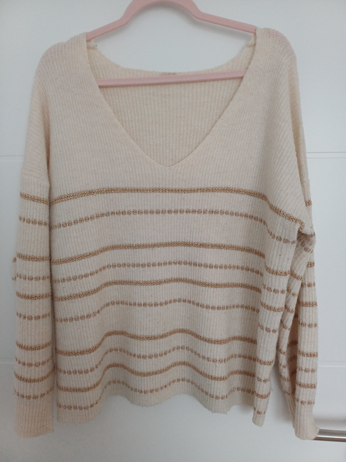 Predám dámsky sveter svetlej, béžovej farby. Sveter má jemné prúžky prepletané zlatou niťou.