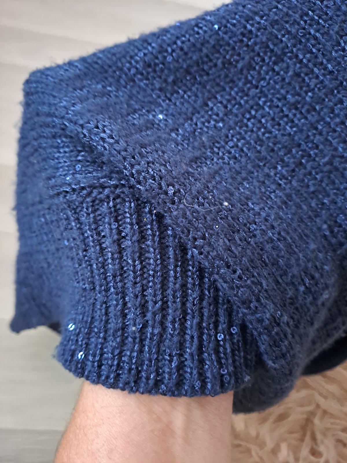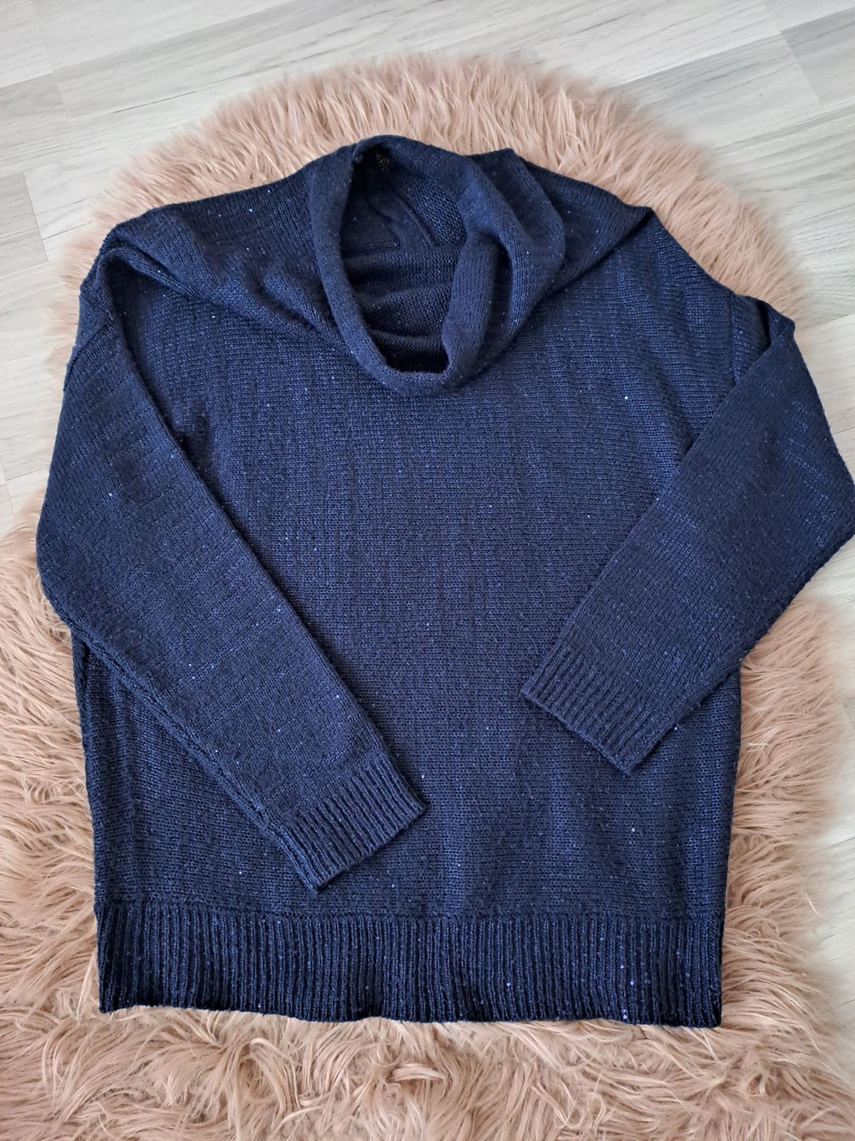 Pekný dámsky sveter vo výbormom stave s veľkým padavým golierom. Všité trblietky, čo vyzerá veľmi pekne (akoby sa menil). Veľ. písaná M, sadne skôr na L. alebo viac voľnejší na M.