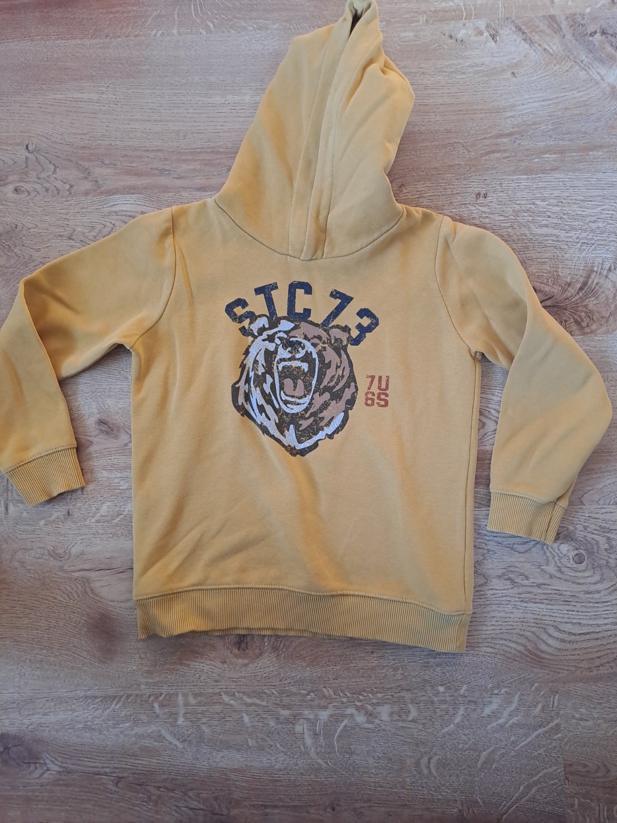 Nosená mikina na zips. Farba bledohorčicová. Veľkosť 128. Pri vreckách bolo jemne zašité a bledočervený mini fliačik, na chrbáte kúsok prasknutá niť (viď. foto). Cena 3,10€ + pošt.