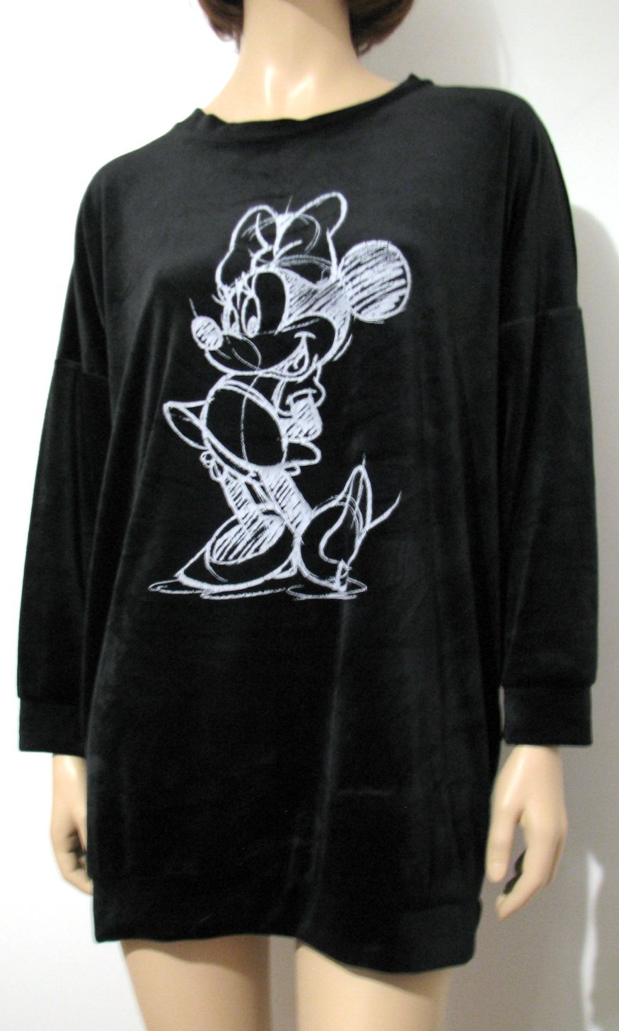 Čierna tenká mikina z elastického, jemného a mäkkého zamatu s potlačou kreslenej myšky Minnie. Potlač má sem-tam prasklinky, no vzhľadom k tomu, že sa jedná o motív akoby len načrtnutý kriedou tak to je v podstate nebadané. Inak je bez poškodení, minimálne použitá. Veľkosť univerzálna, najlepšie asi na L, ale aj pre menšie XL, či na S-M ako oversized. V prípade záujmu premeriam.