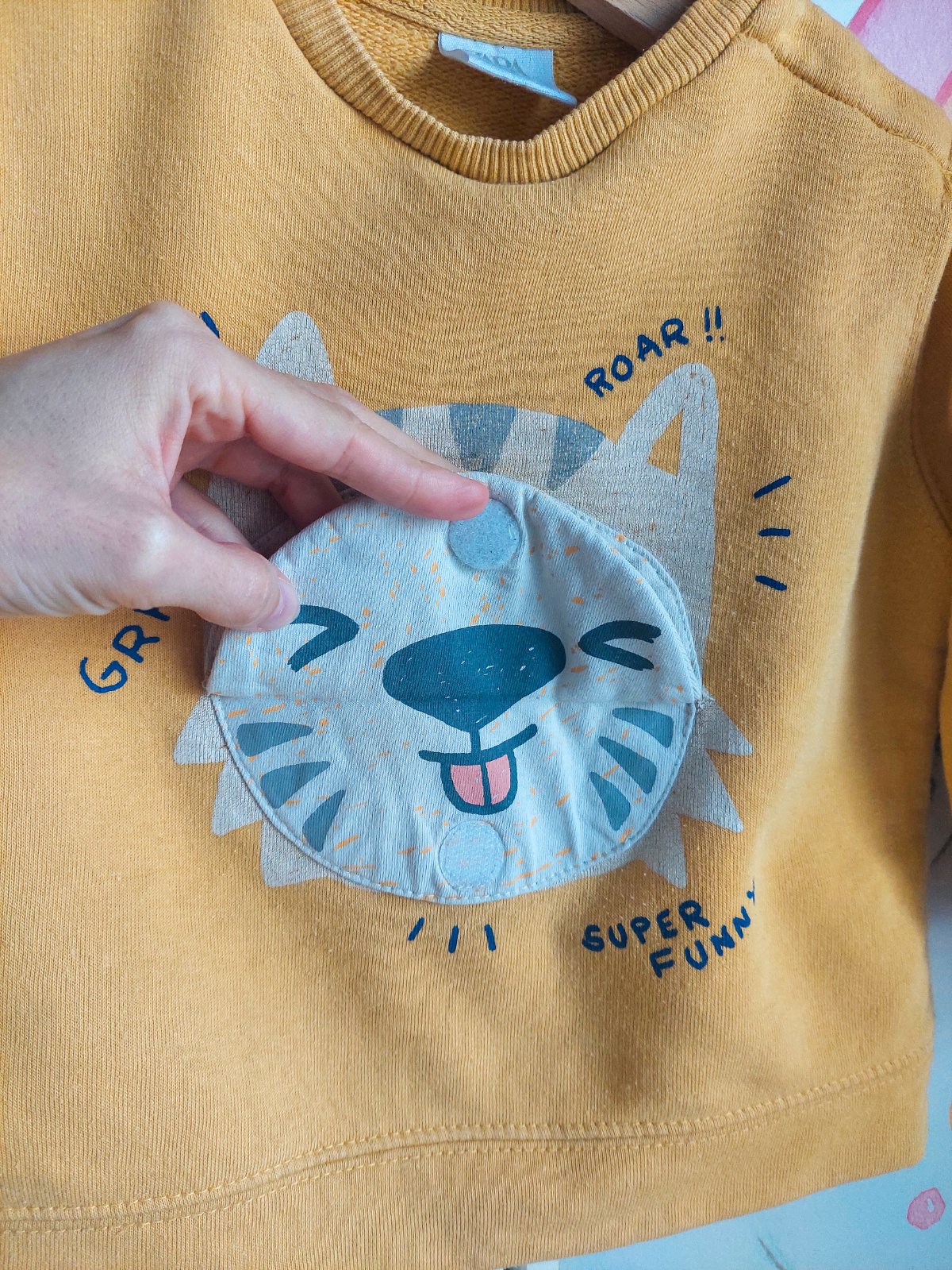 Horčicová tepláková mikina značky ZARA. Mäkký a príjemný materiál, pohodlný strih. Roztomilý obrázok tigra s nápismi, ideálna na každodenné nosenie.