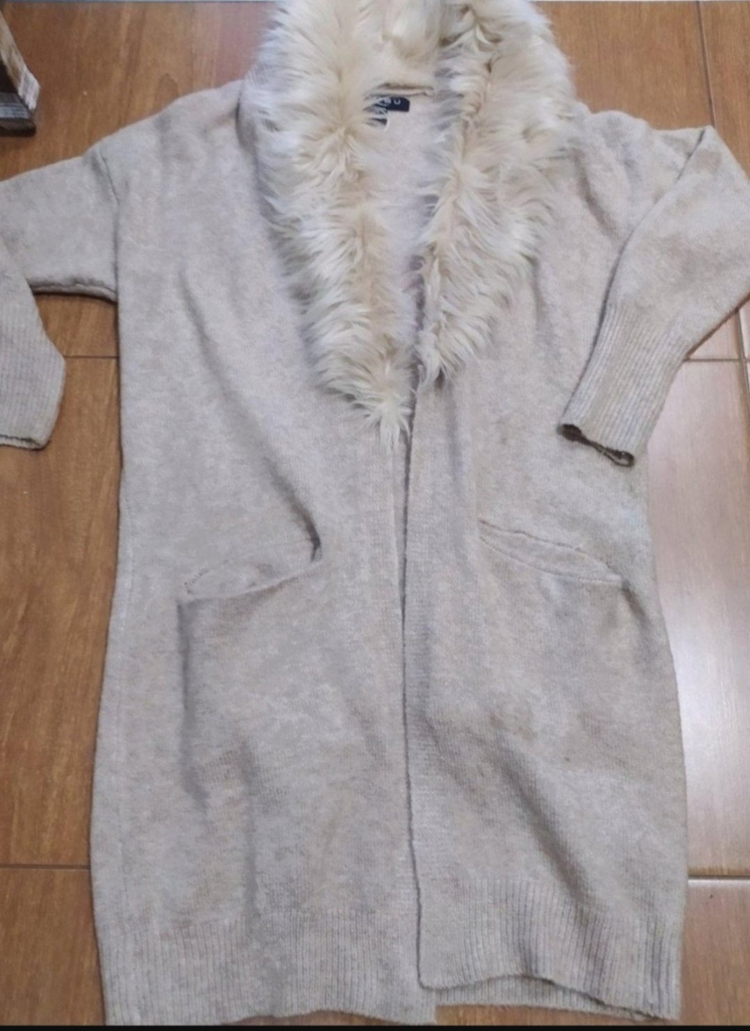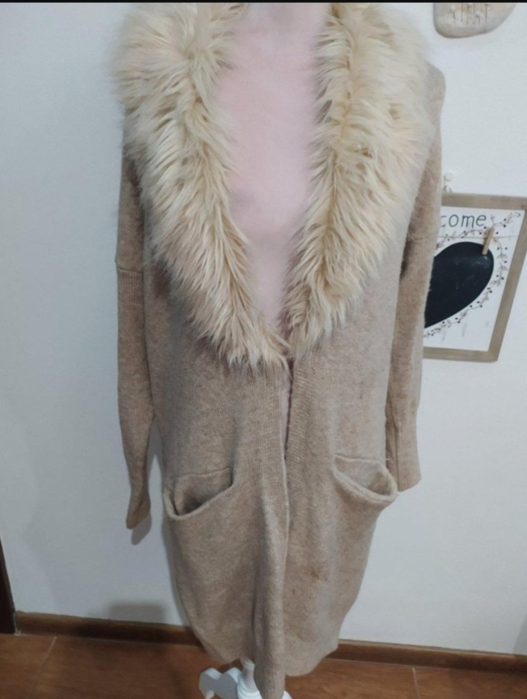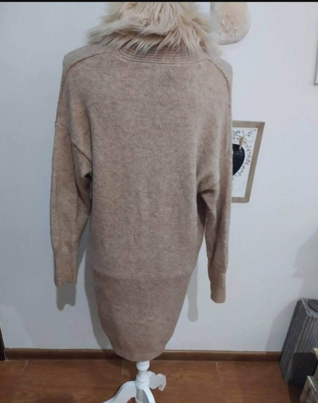 Predĺžený sveter bledo hnedej farby s dierkovou štruktúrou. Možno upravovať dĺžku rukávov.
