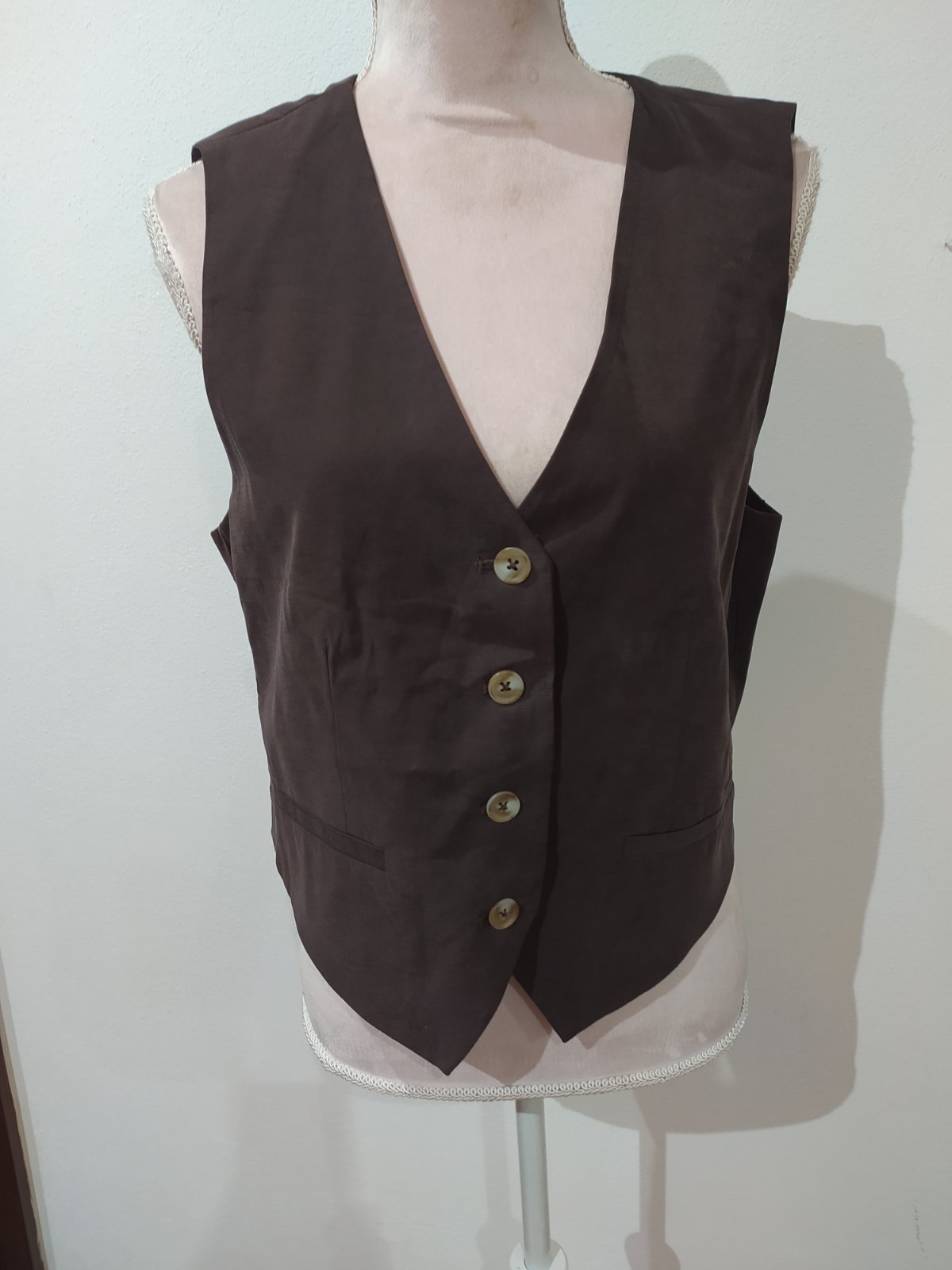 Vesta rovného strihu z viskozovej tkaniny,véčkovy výstrih,tvárujúce záševky,,zapínanie na gombíky ,ozdobené vrecká, nenosená
