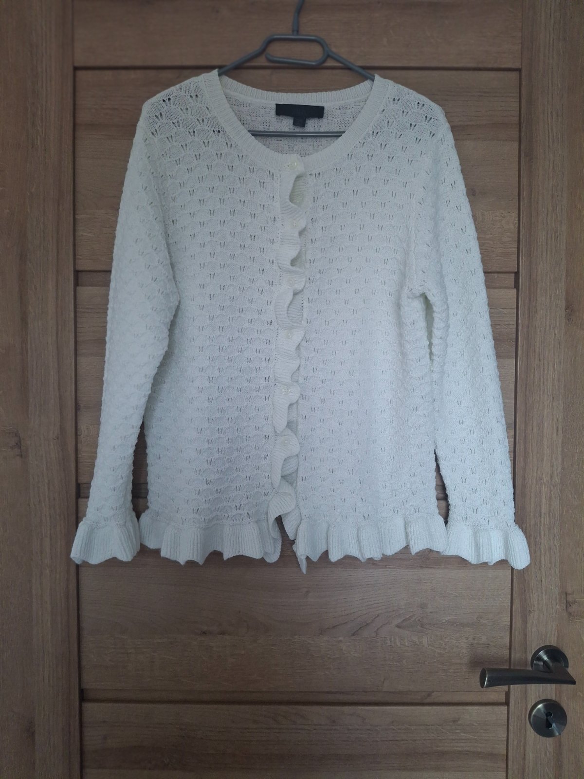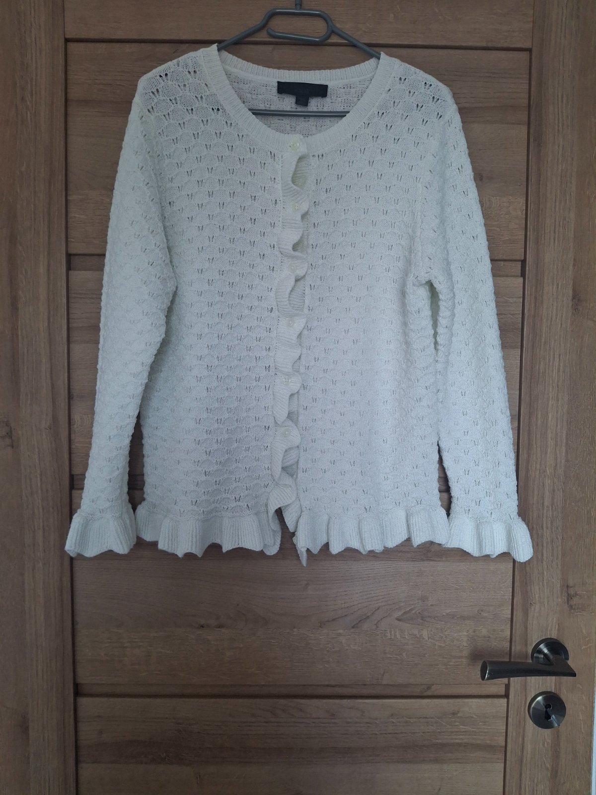 Biely kardigan zn. Zara velkost je pisana S ale sedi na L dlzka 74 cm prsia 58-60x2 B180 dd