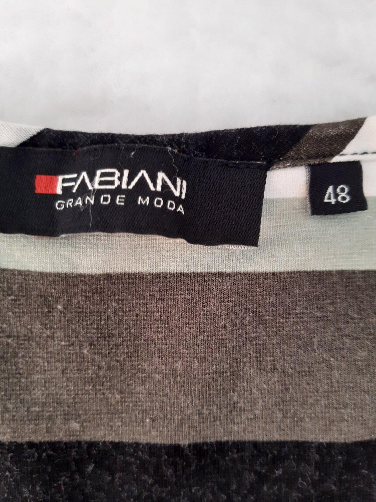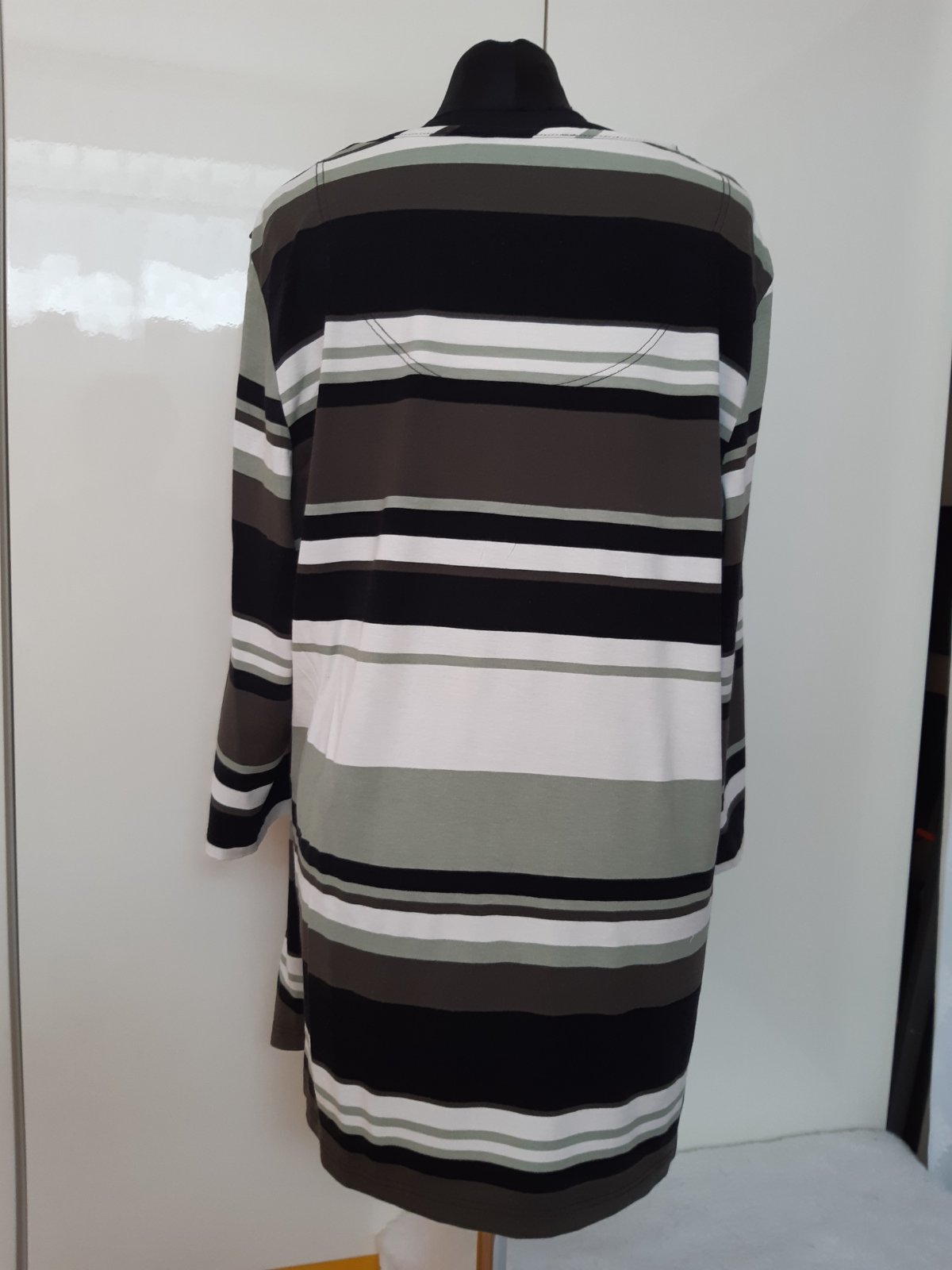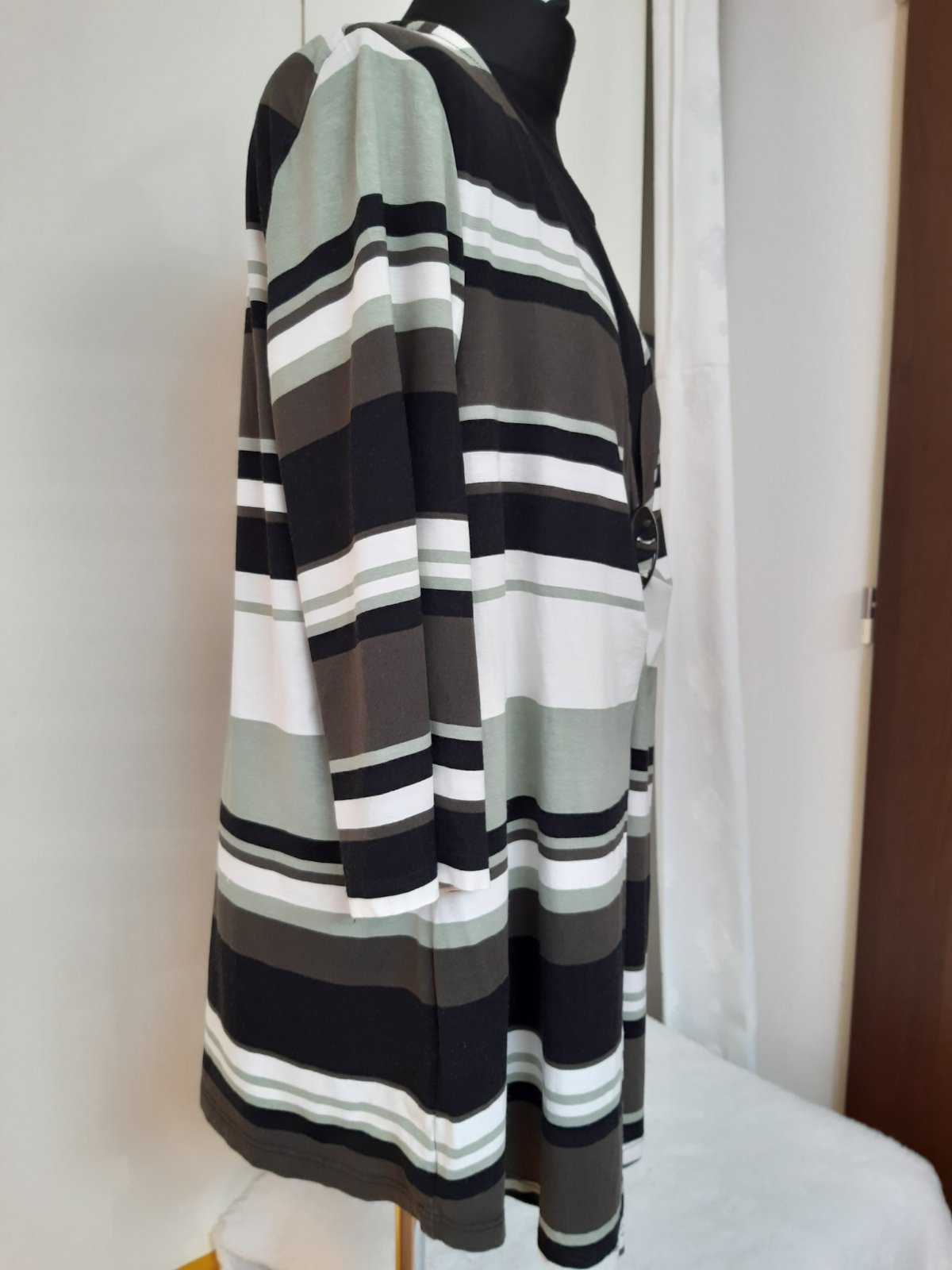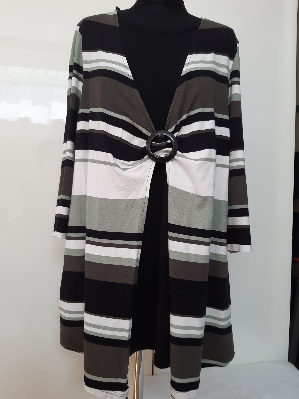 Kardigan a top len predná časť v jednom. Dl. 77 cm, šírka cez prsia 61x2cm, dl. rukáva 49 cm. Materiál 95% viskóza, 5% elastan. Kardigan je v dobrom stave, bez poškodenia.