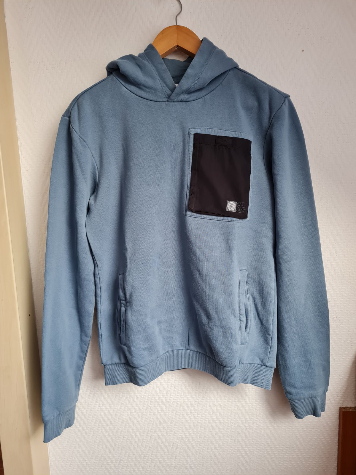 Mikina je mäkká, pohodlná a teplá, v peknej svetlomodrej farbe. Na prednej strane má praktické čierne náprsné vrecko, ktoré dodáva moderný, športový vzhľad.