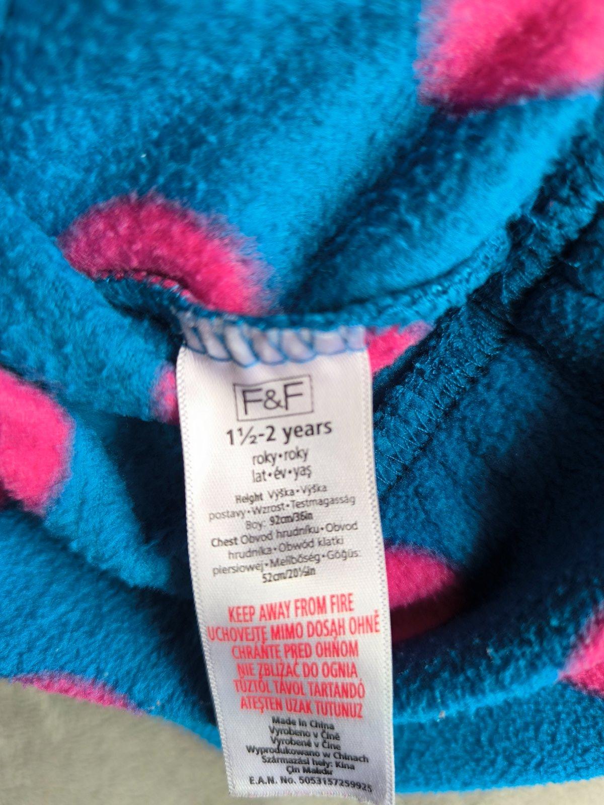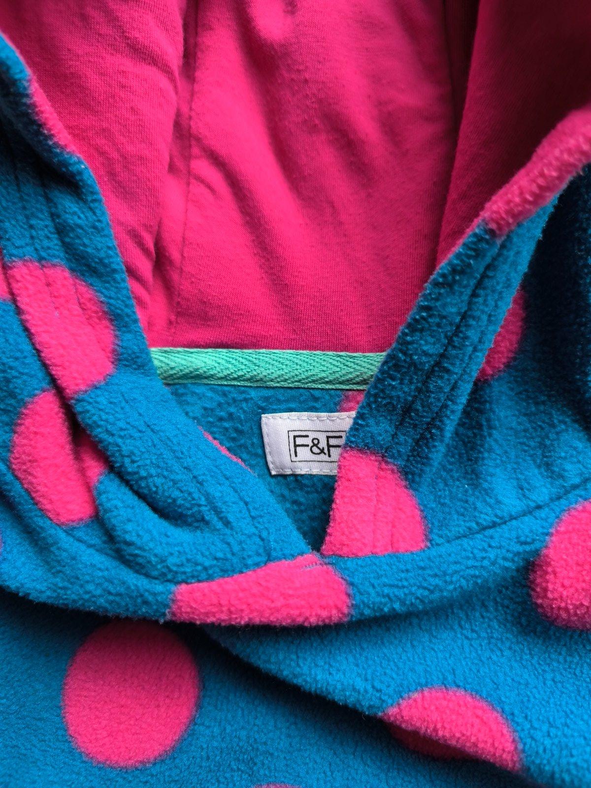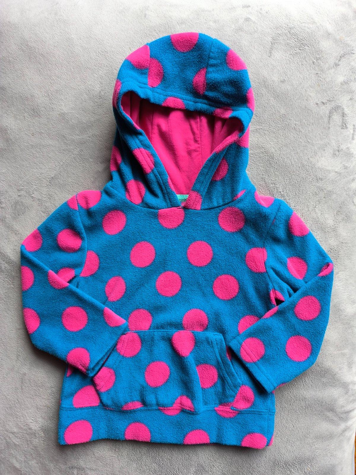 Mäkká teplá mikinka z jemného flisu. Obliekanie cez hlavu, s kapucňou a veľkou prednou kapsou. Veľkosť 2-3 roky. Vo veľmi dobrom stave.