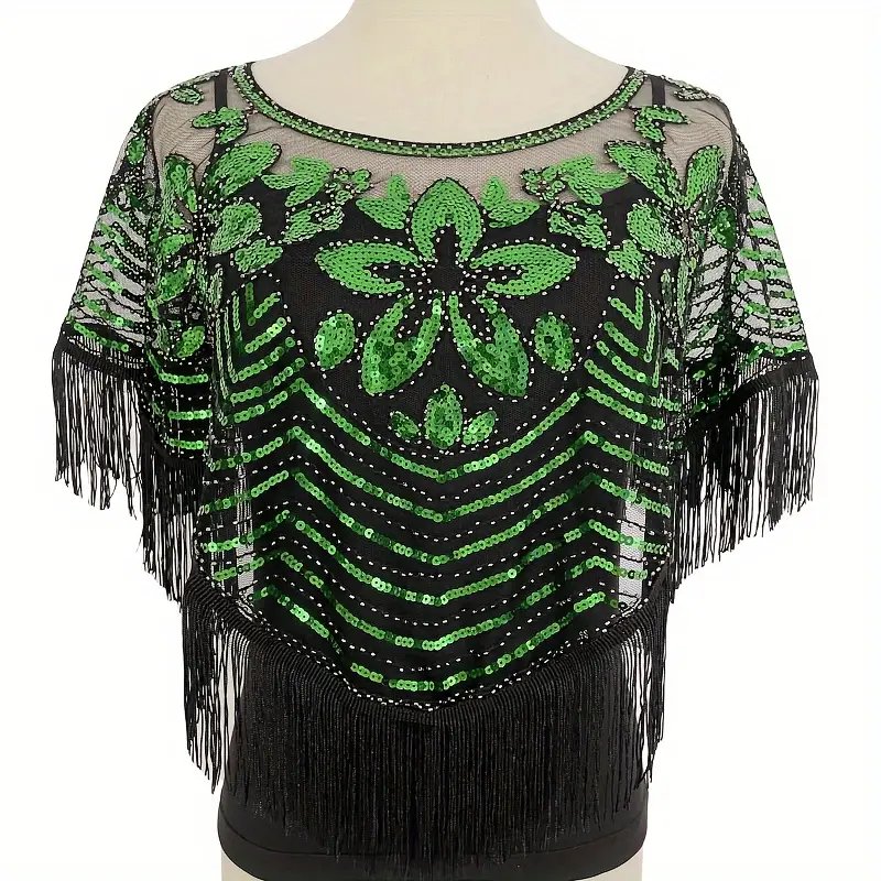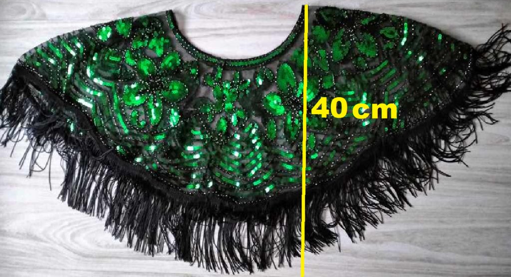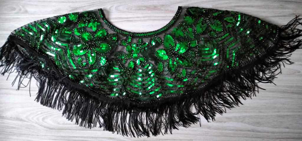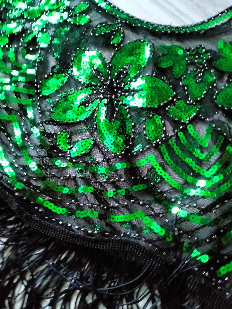 Mám na predaj toto veľmi pekné spoločenské pončo/pelerínku na šaty čiernej farby so zelenými trblietkami a strapcami