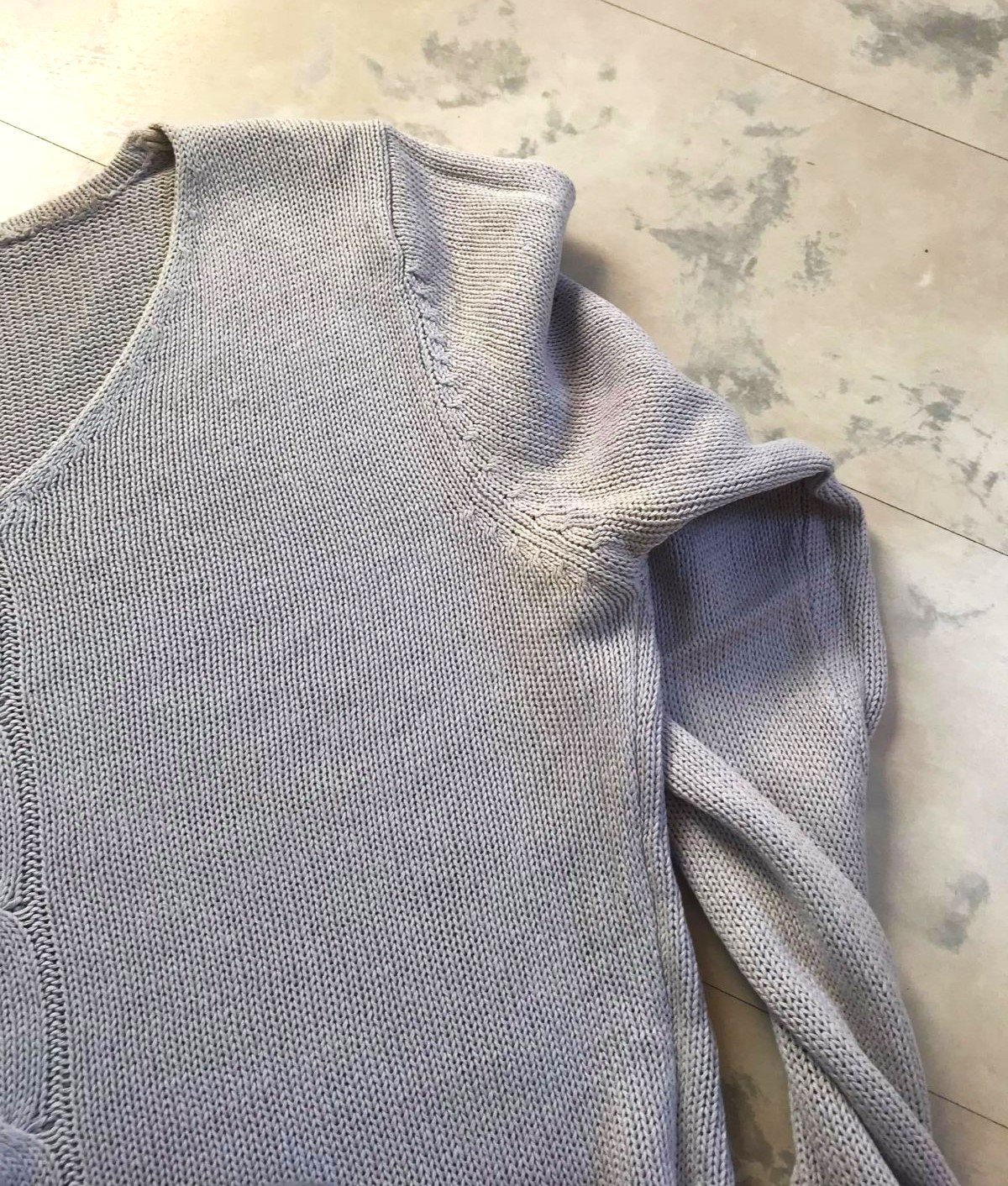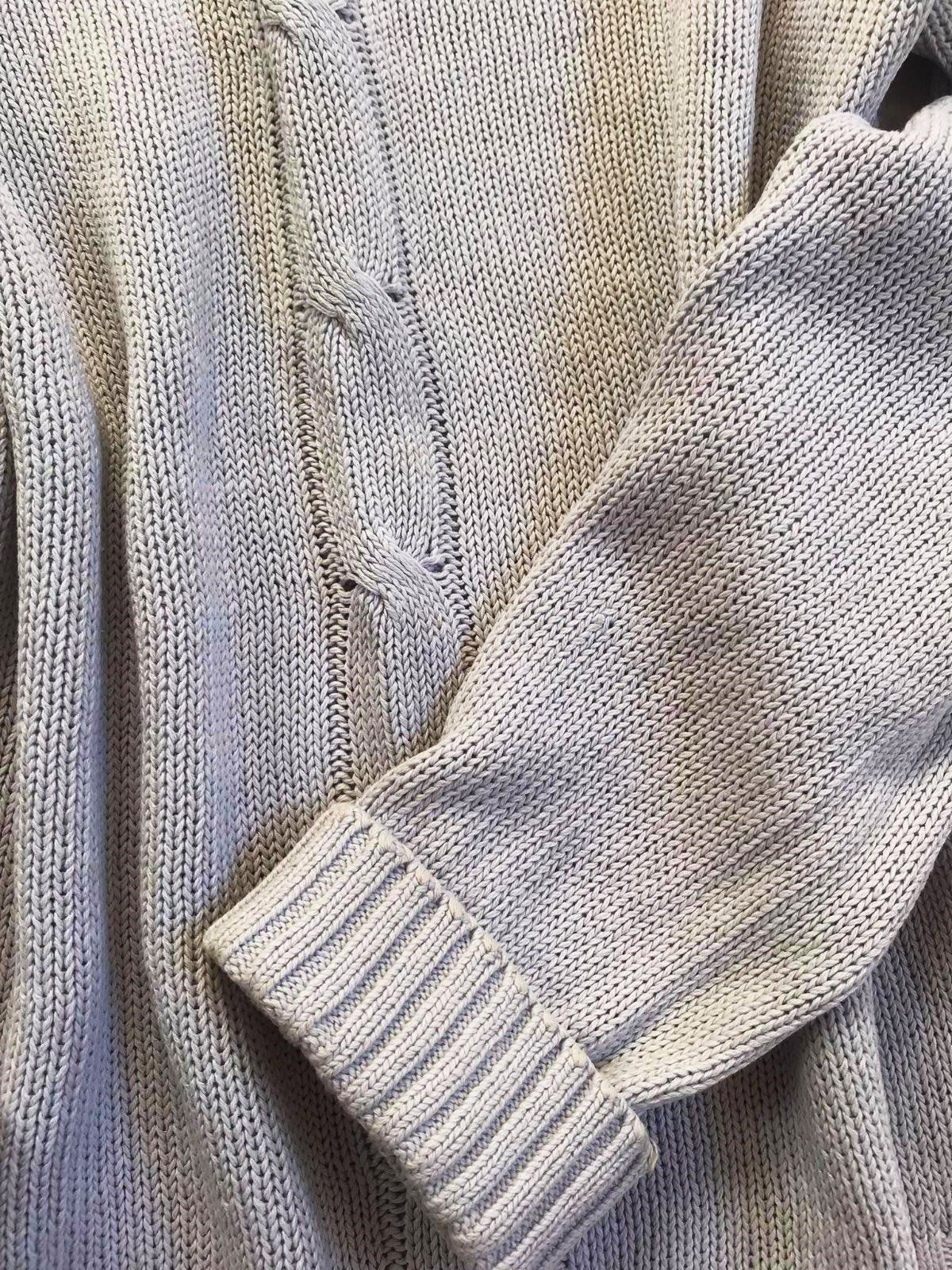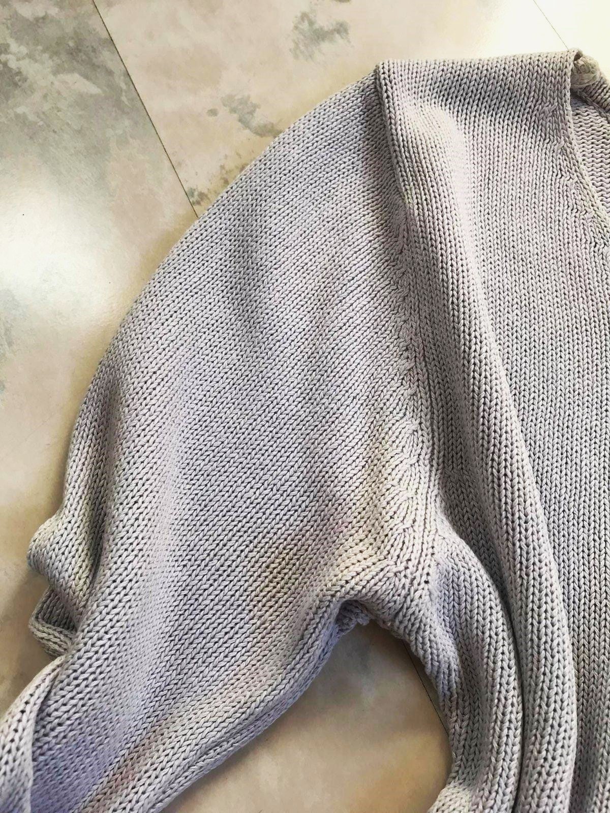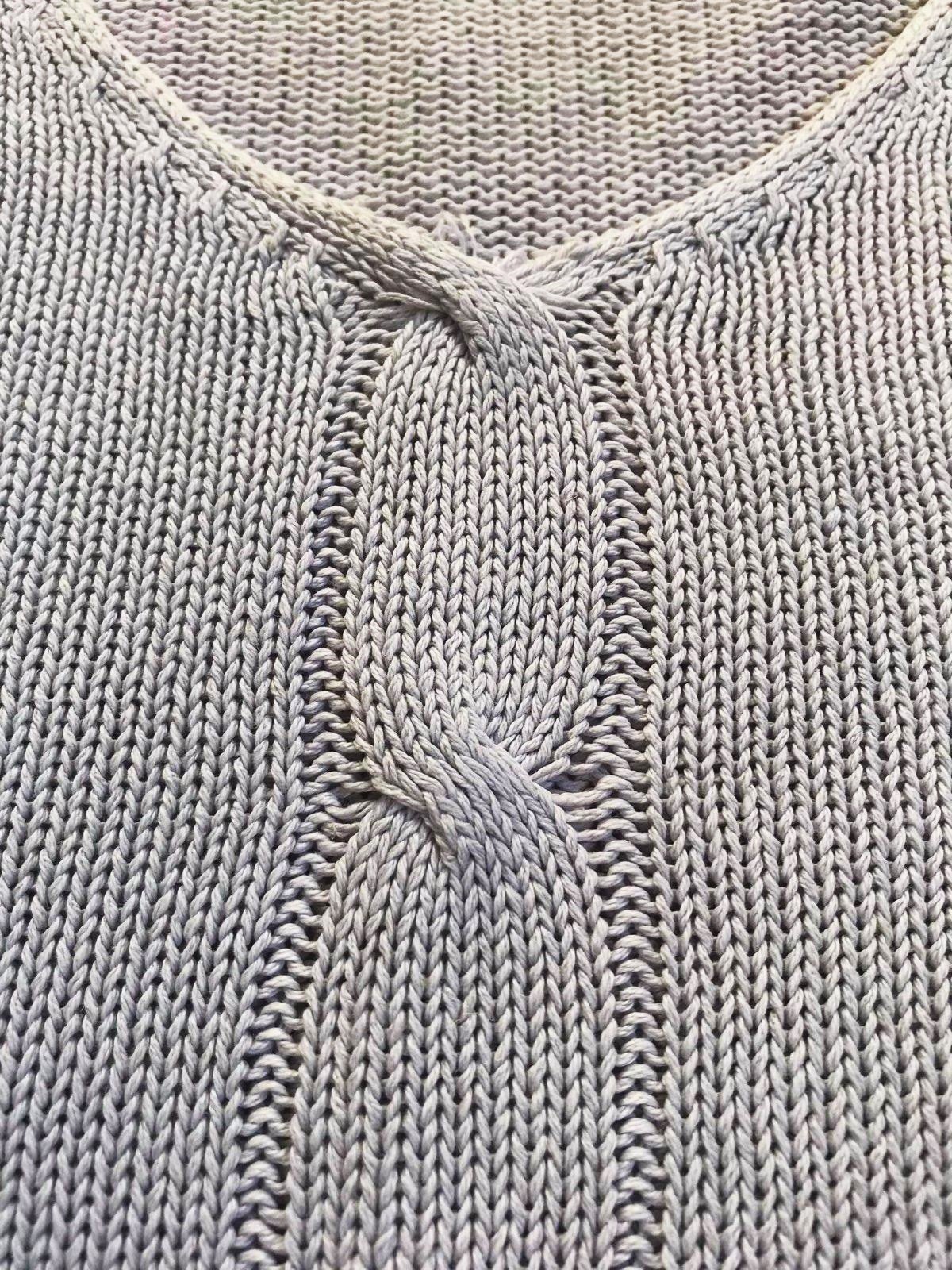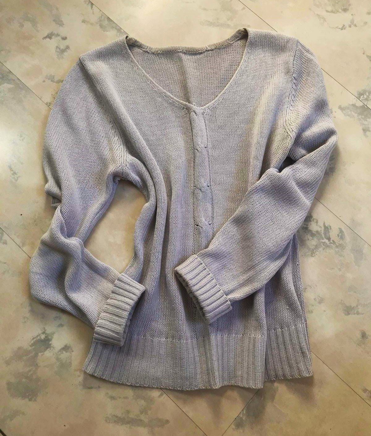 cvernový bavlnený pulóvrik s plytkým v-čkom,z cvernovej priadze,má drobnú vadu - vyfotila som obrubu/lem na chrbáte, bolo to tak kúpené - tá obruba je taká - akoby kostrbatá - ale iba zdnu, zvonku nie je nič vidno - ale upozorňujem na to, aj keď pri nosení to nevadí a neuberá mu to na vzhľade