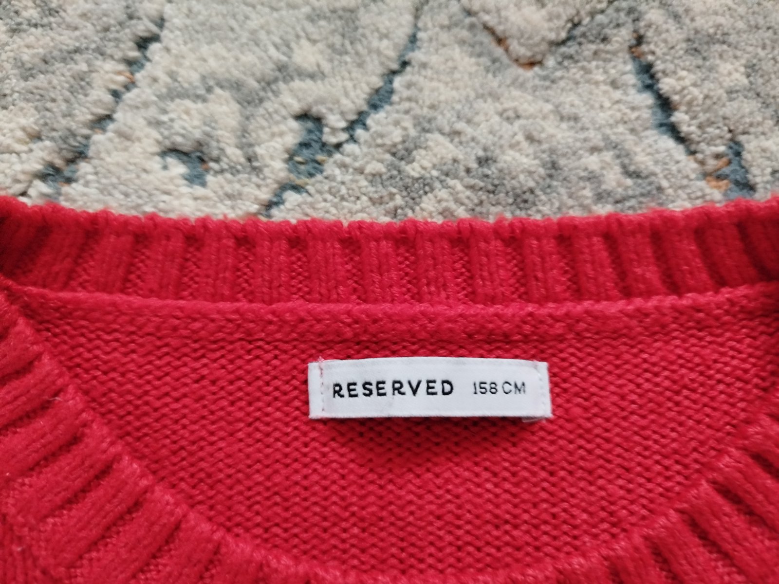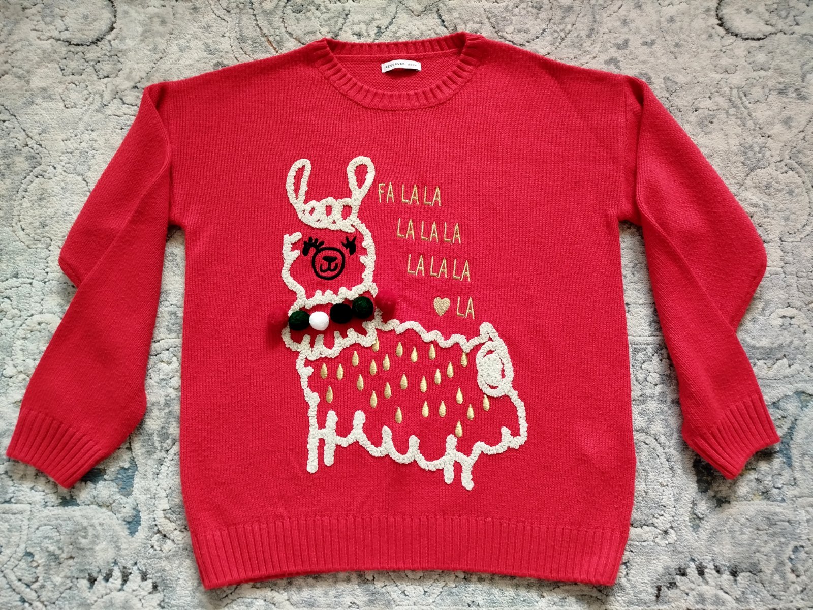 Vianočný sveter Reserved s lamou, veľkosť 158 ale ponosíte aj ako 164. Pekný nosený stav, dĺžka 56cm, prsia 47cm, rukáv od krku 66cm. Farba je tmavšie červená ako na foto. Cena + pošta.