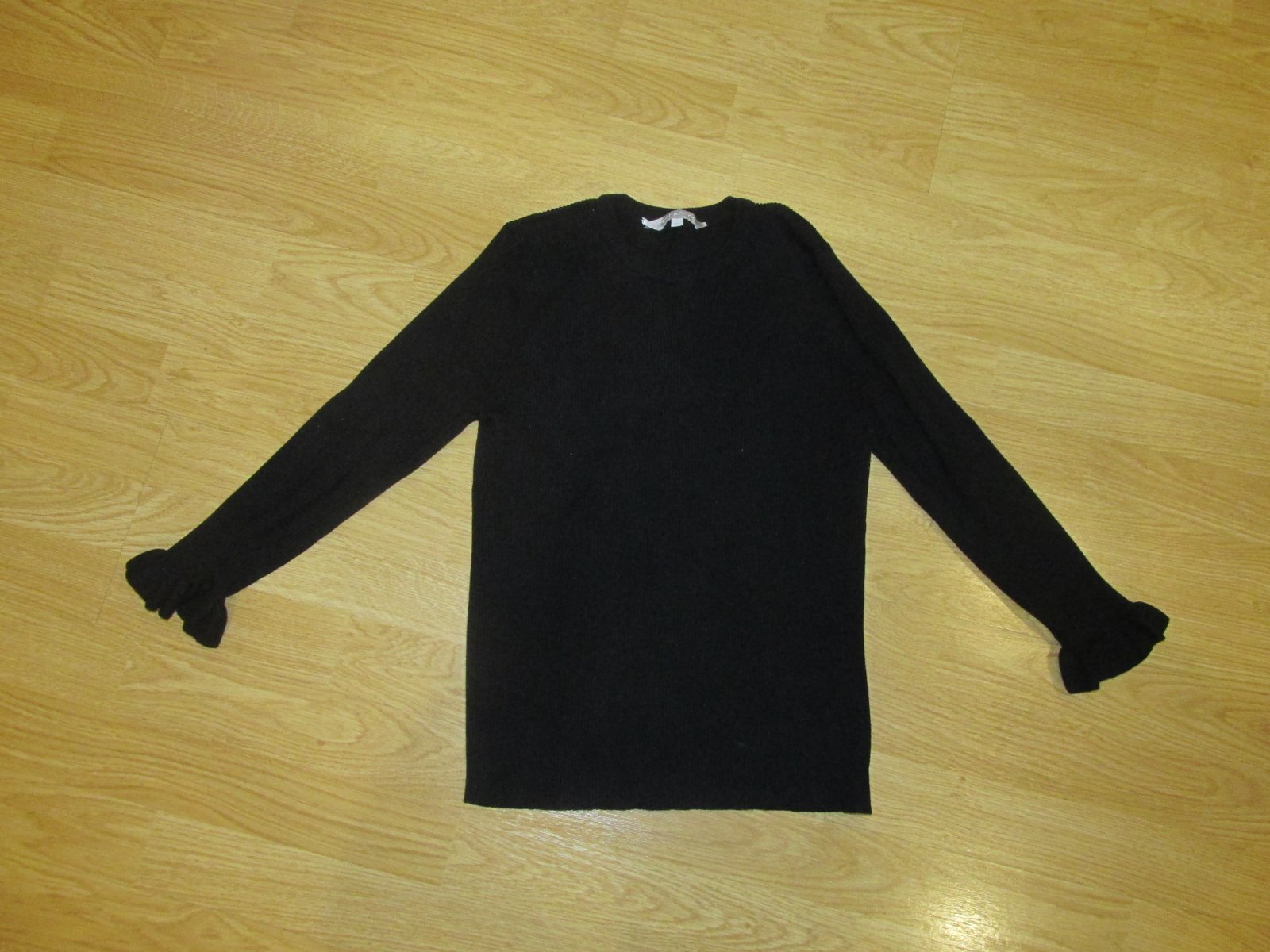 Pekný čierny svetrík má zaujímavé ukončenie rukávov. Je elastický, rebrovanej štruktúry, nie je hladký. 100% stav.