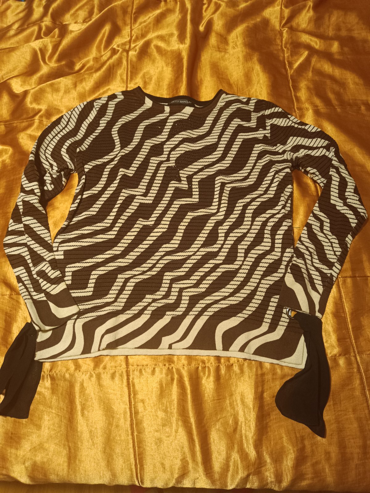 Predám pulóver značky Betty Barclay, veľkosť L, celková dĺžka 59 cm, rukáv 58 cm, popretkávaný lesklou niťou, po bokoch ozdobné mašle