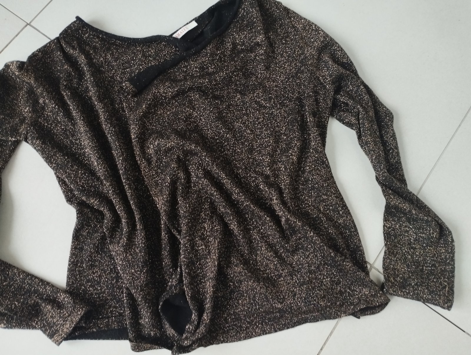 Bolerko krátke (pod prsia), 3/4 rukáv, priehľadné kvôli vzoru, obsahuje trblietavú niť, s podielom angory a jahňacej vlny,