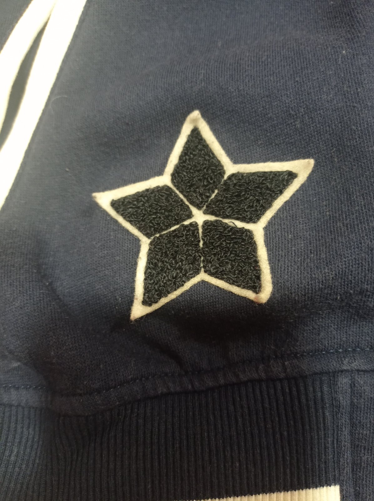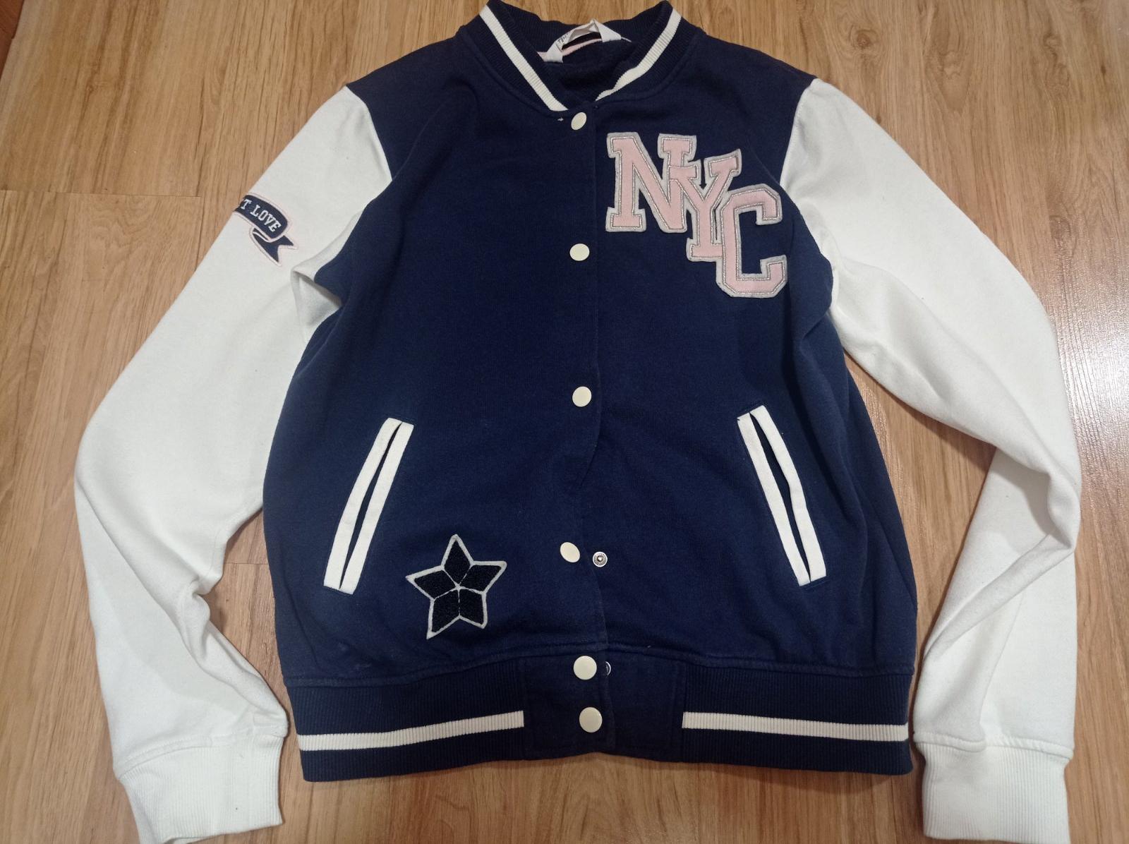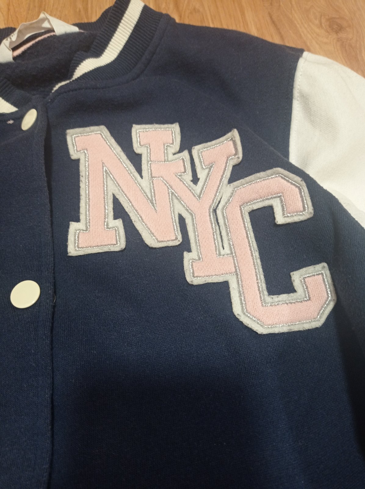 Mikina velmi dobry noseny stav. Pismenka su striebornou nitou obsite, trbliece sa to, 3d kvietok, nadpis na rukave. Farba je stale pekna, rukavy kremovej farby.