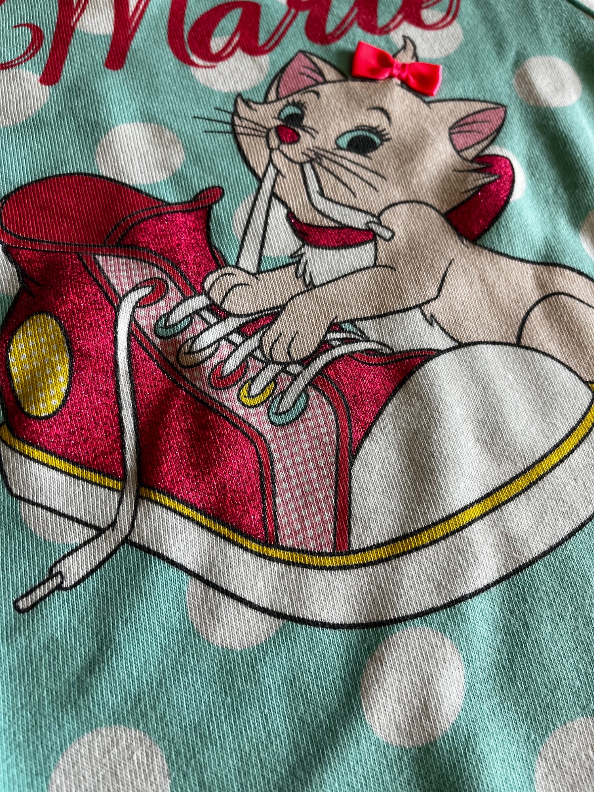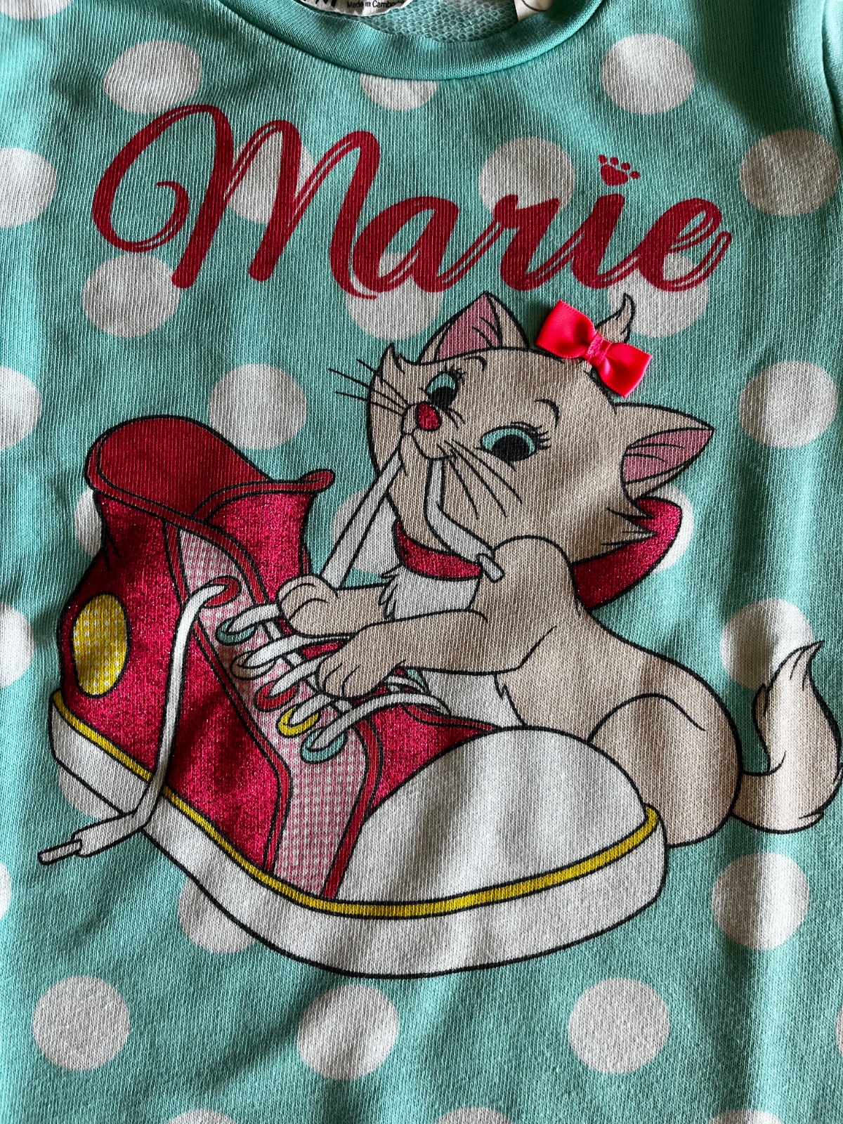 Vpredu veľká aplikácia mačičky Marie s 3D mašličkou výraznej neónovej farby, celoplošne väčšie biele bodky.