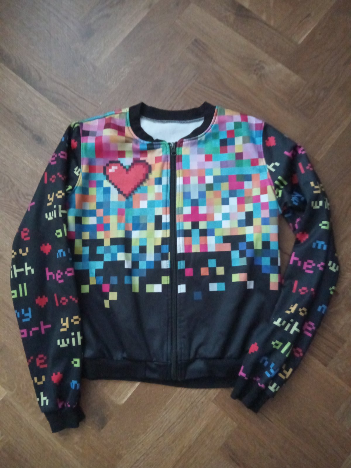 V nosenom stave bez poškodenia, šírka pod pazuchami je 50 cm, dĺžka 54 cm, dĺžka rukáva od ramena je 63 cm. Materiál nie je uvedený, ale bude to polyester.