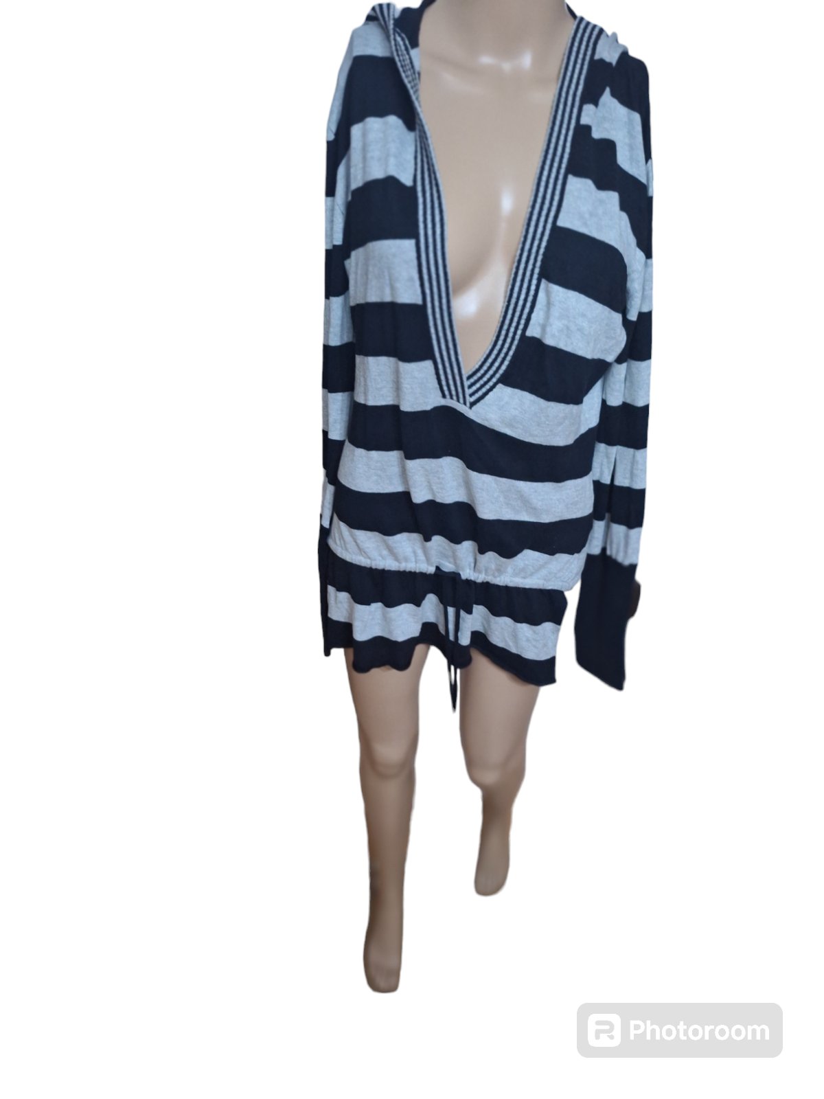 Dámsky pulóvrík s kapucňou značky Laura Scot. V páse je šnúrka. Je mierne elastický. Dolu po bokoch sú 14cm rázporky. Dĺžka je 70cm,obvod hrudníka je 98cm a obvod pása je 92cm. Dĺžka rukáva je od krku 85cm. kód 577