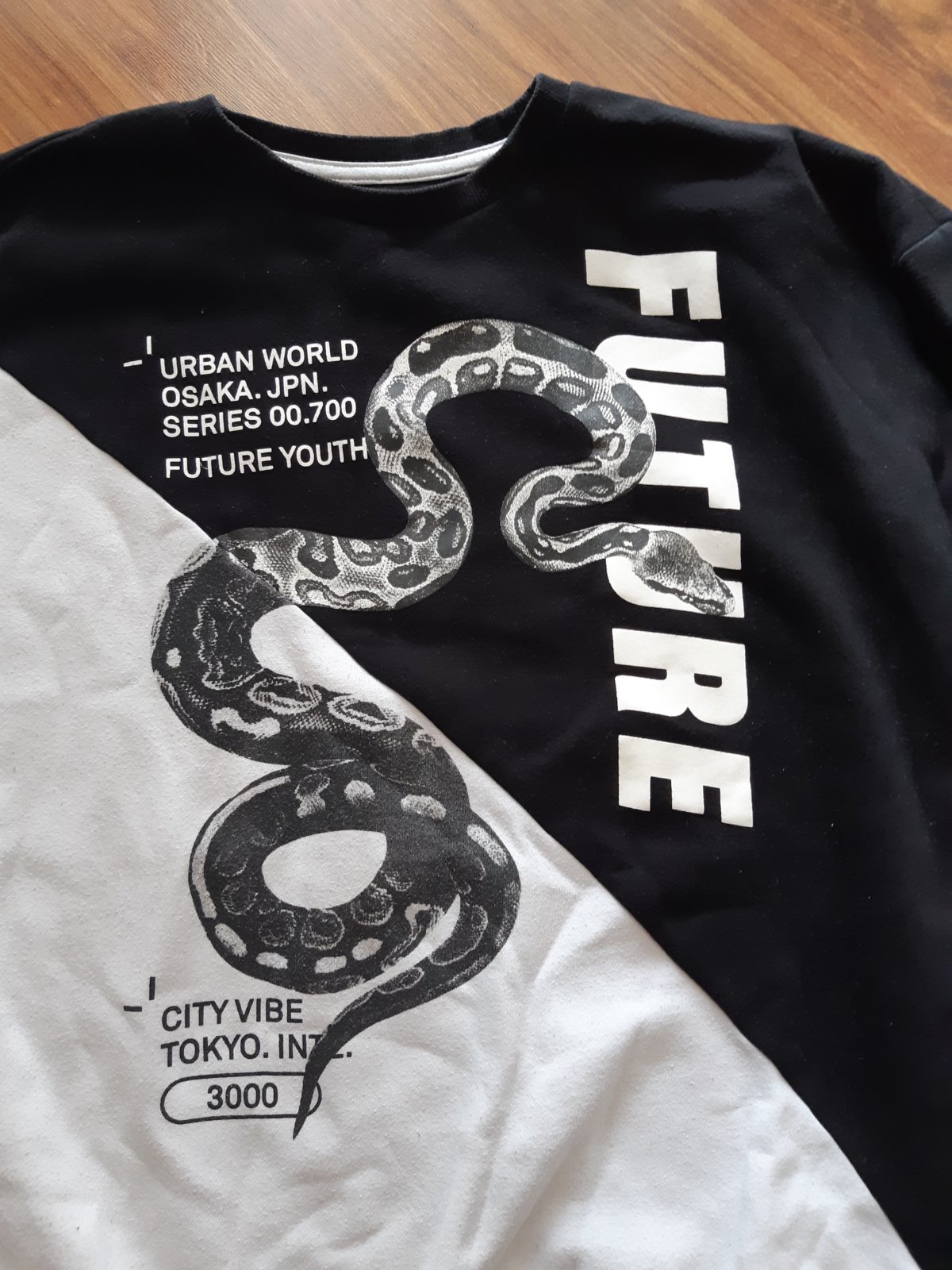 Nosená na striedačku. Nemá poškodenia, akurát jemné žmolky. Aplikácia nieje vobec poškodená. Mikina je takého volnejšieho strihu.