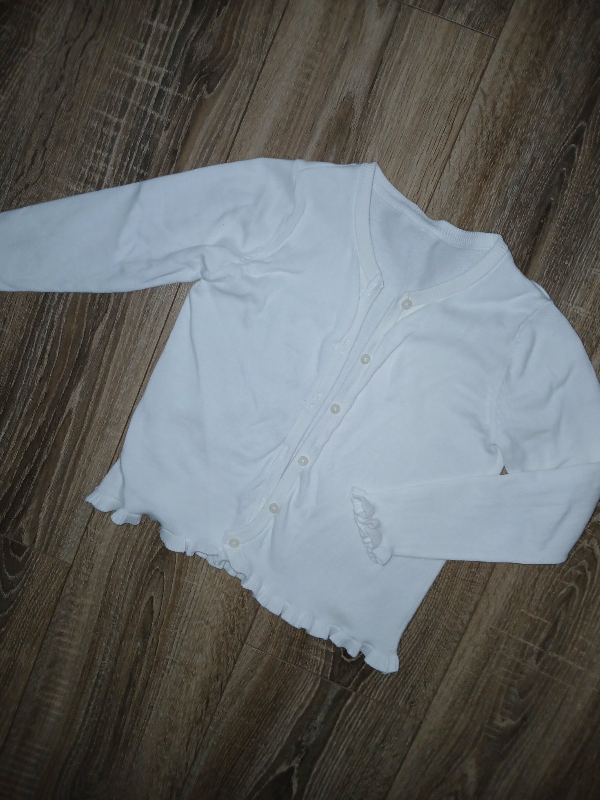 Svetrik noseny iba na prilezitosti. Bez poskodenia,bez flakov. Dlzka rukava od goliera 50cm,dlzka 43cm,sirka pod pazuskami cca 33cm. Ponosite dlhsie,velkost uvedena 5,6rokov. Bavlna.