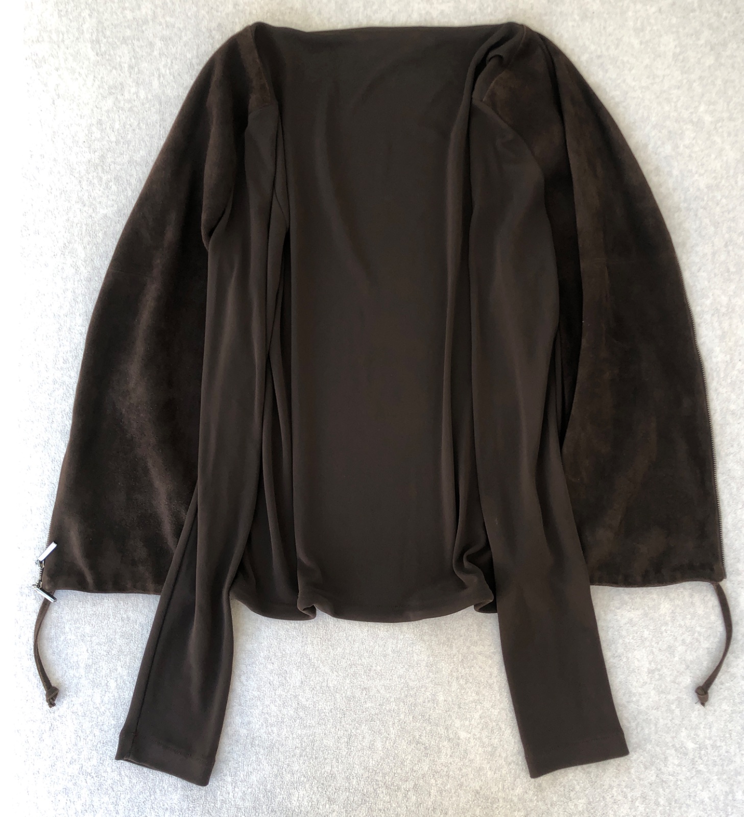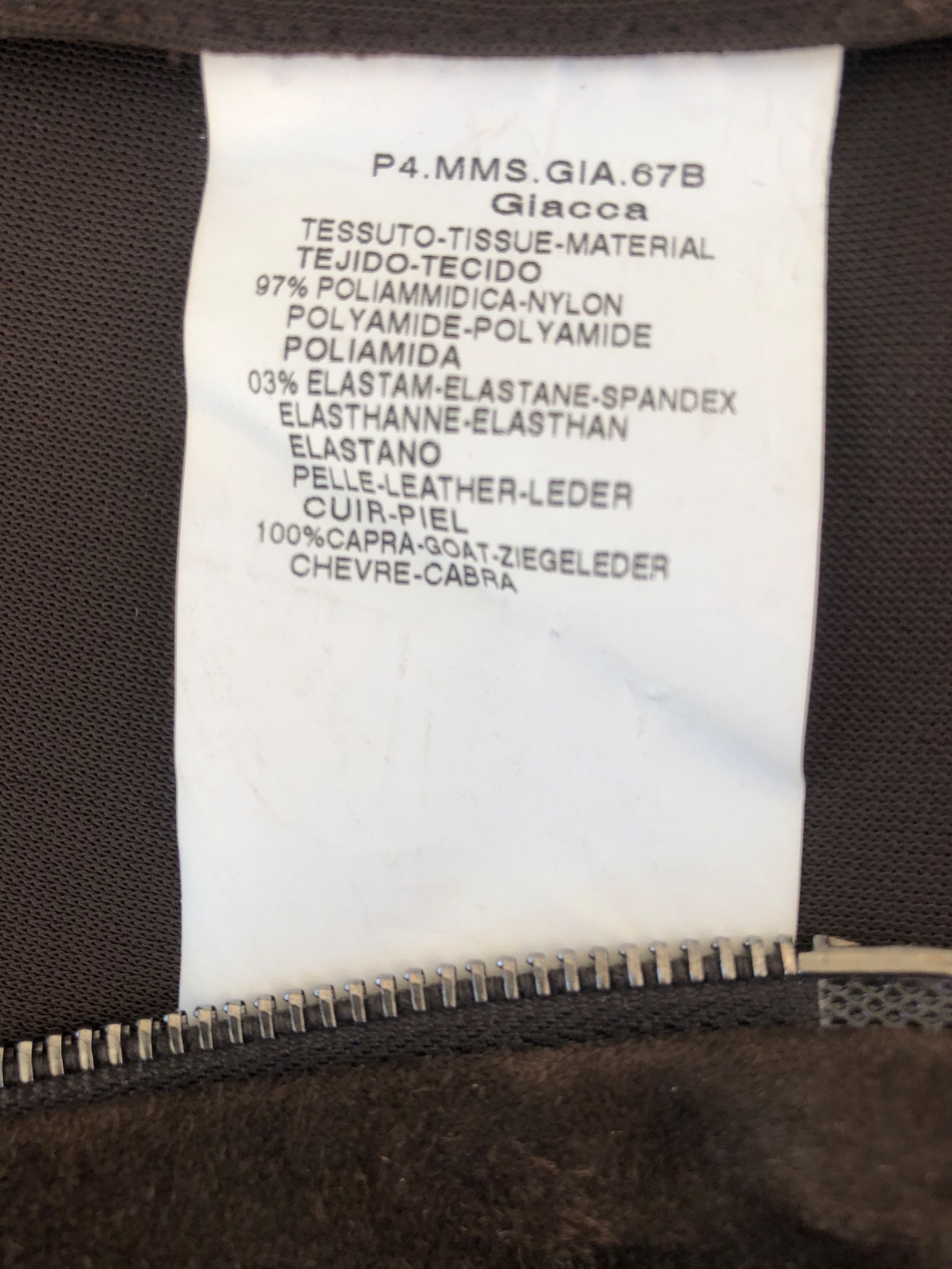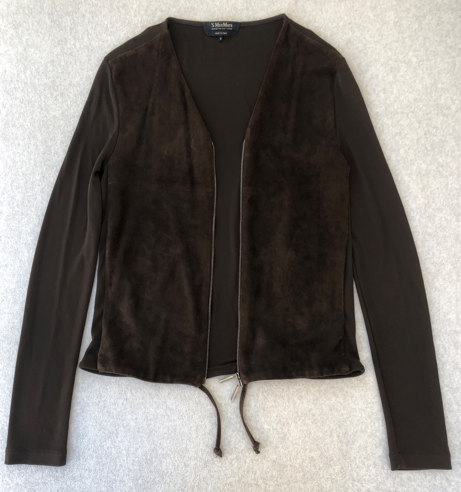 Bundička s prednými dielmi z brúsenej kože. Zapínanie na obojsmerný zips, v spodnom leme je uťahovacia kožená šnúrka. Zadný diel a rukávy sú z pružného úpletu. Vo veľmi peknom stave, bez poškodení.