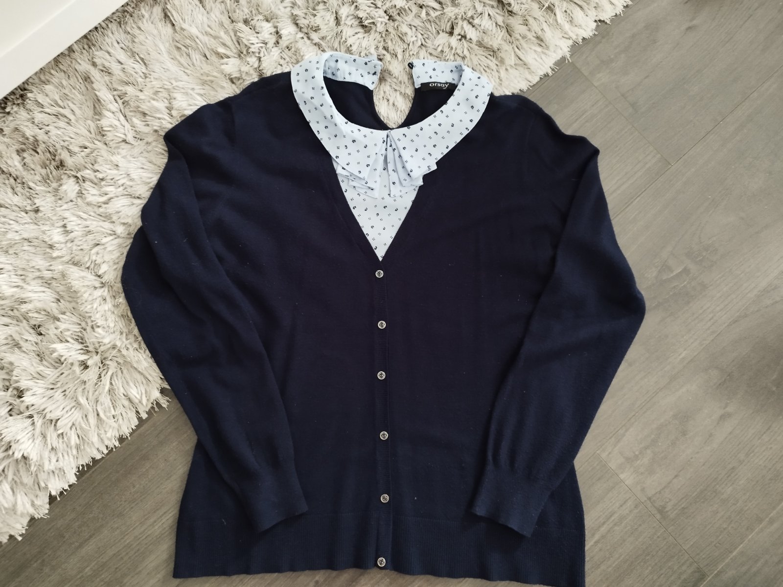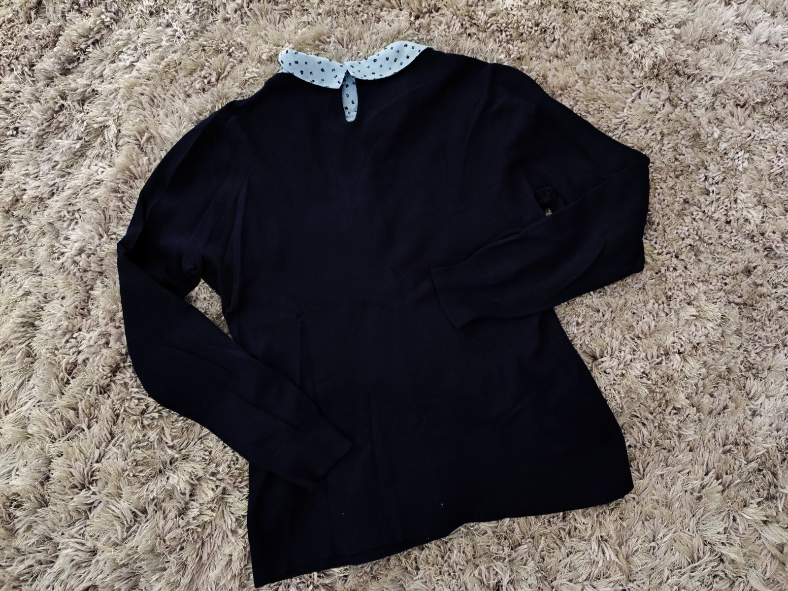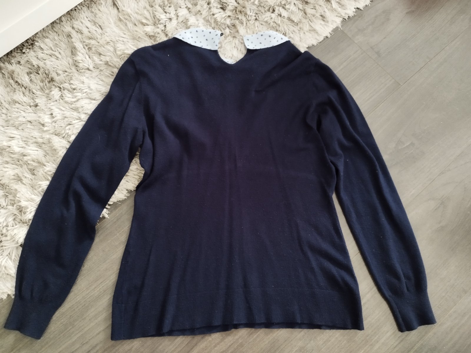 Pekný pulóvrik s bledomodrým golierikom. Nosený, výborný stav.