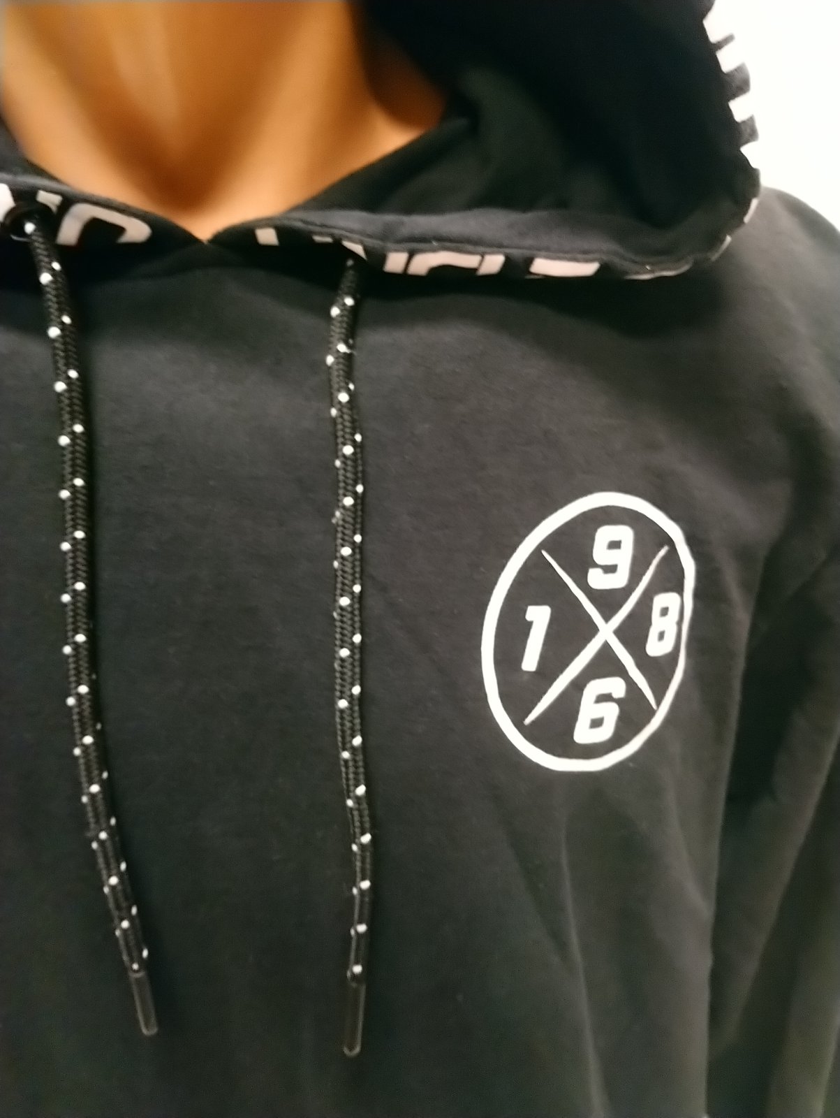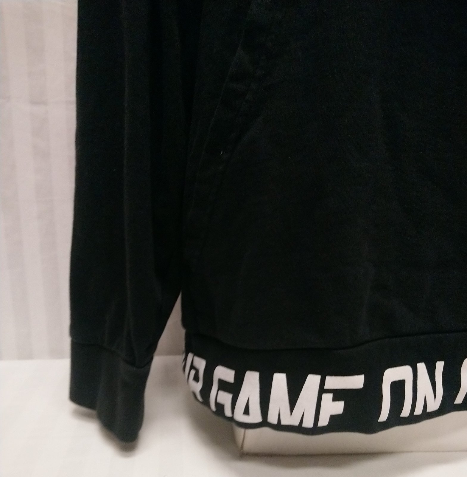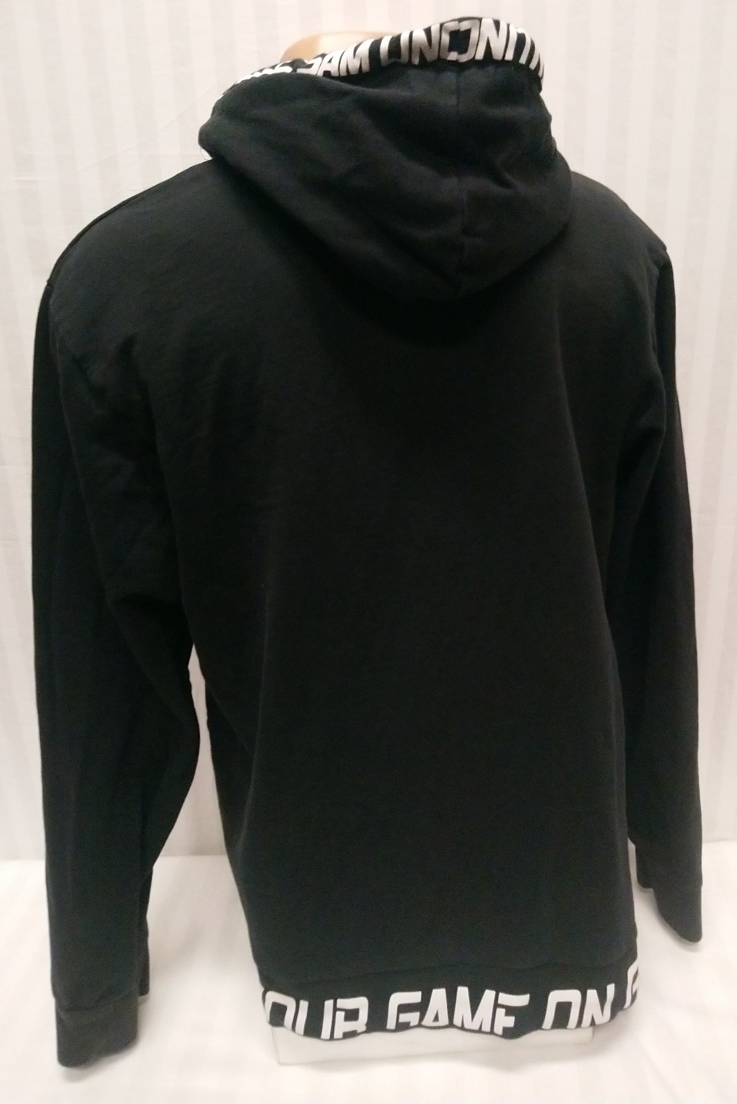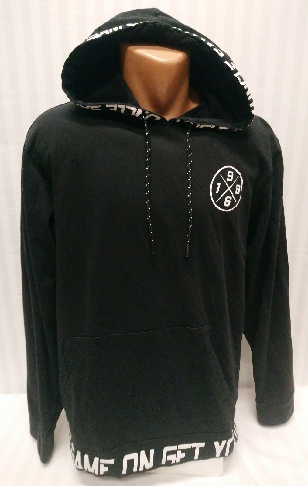 Pánska čierna mikina klokanka s nápismi,s kapucňou, klokanie vrecko, nie je veľmi hrubá,