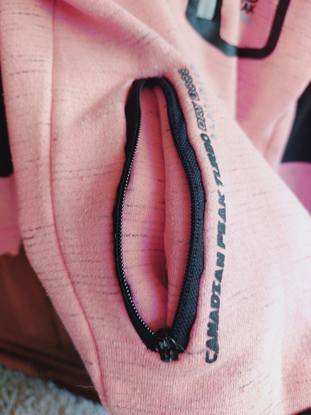 Mikina kupovaná v DE, značka Canadian Peak , na jednom vrecku chyba bežec a je natrhnuté -zašlite/vid foto/, na druhom vrecku chyba ten držiak čím sa ťahá zips /vid foto/