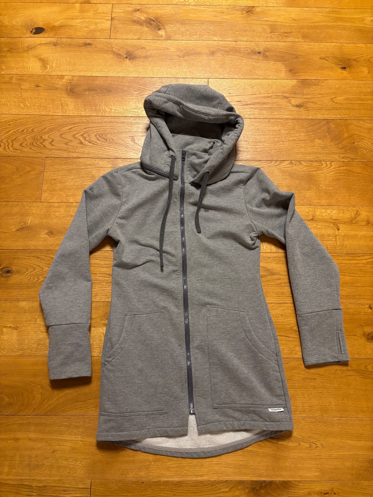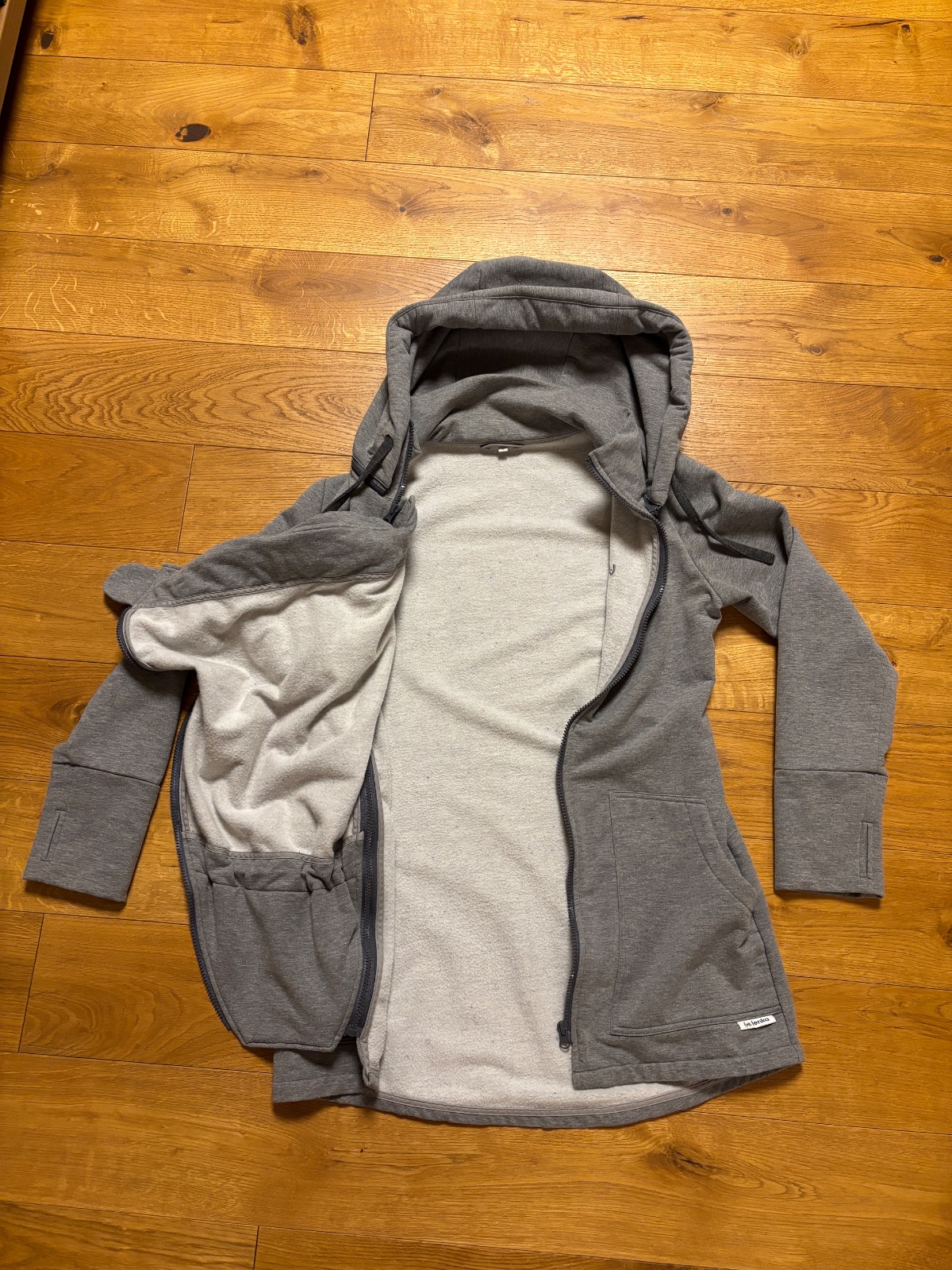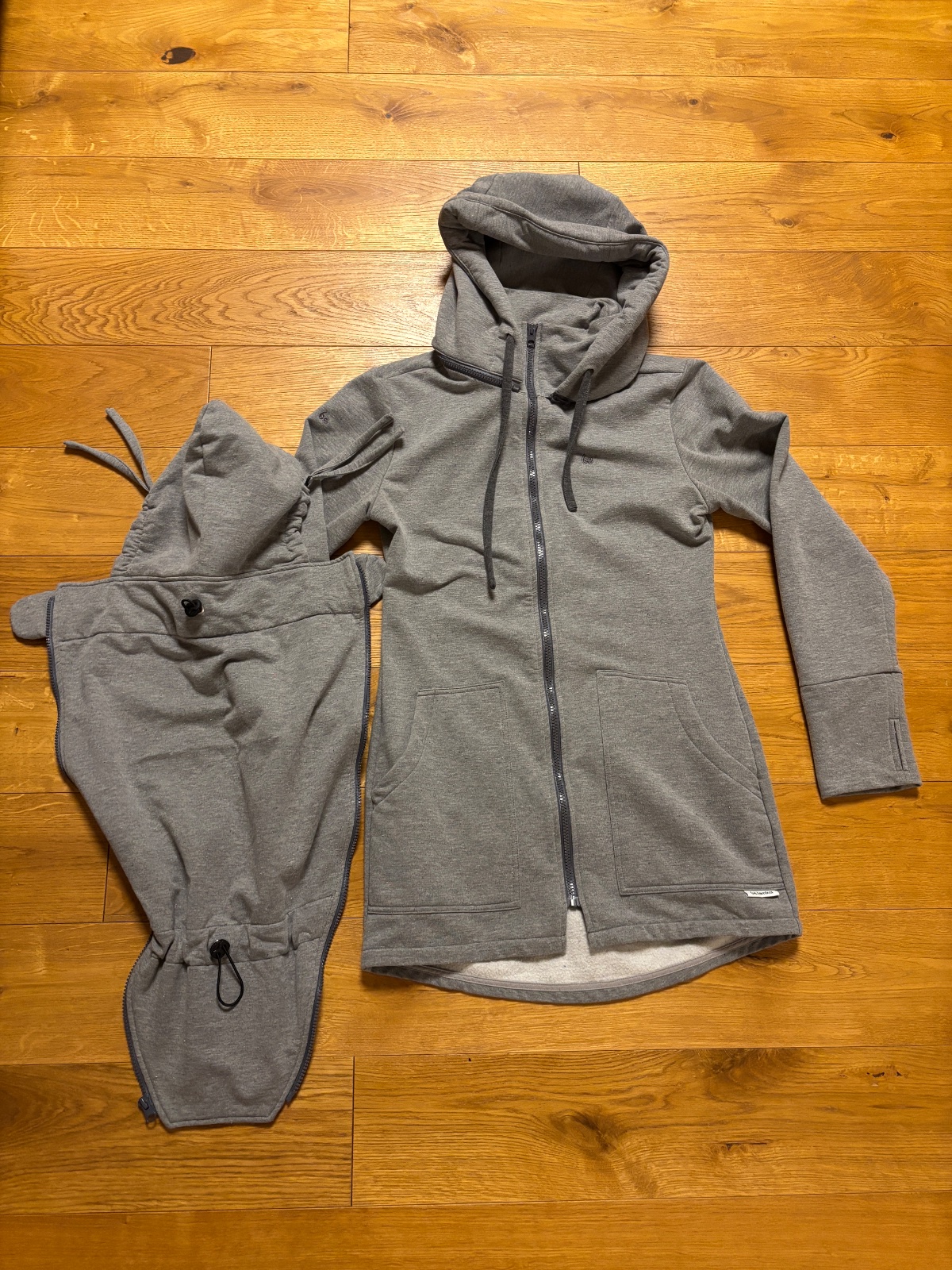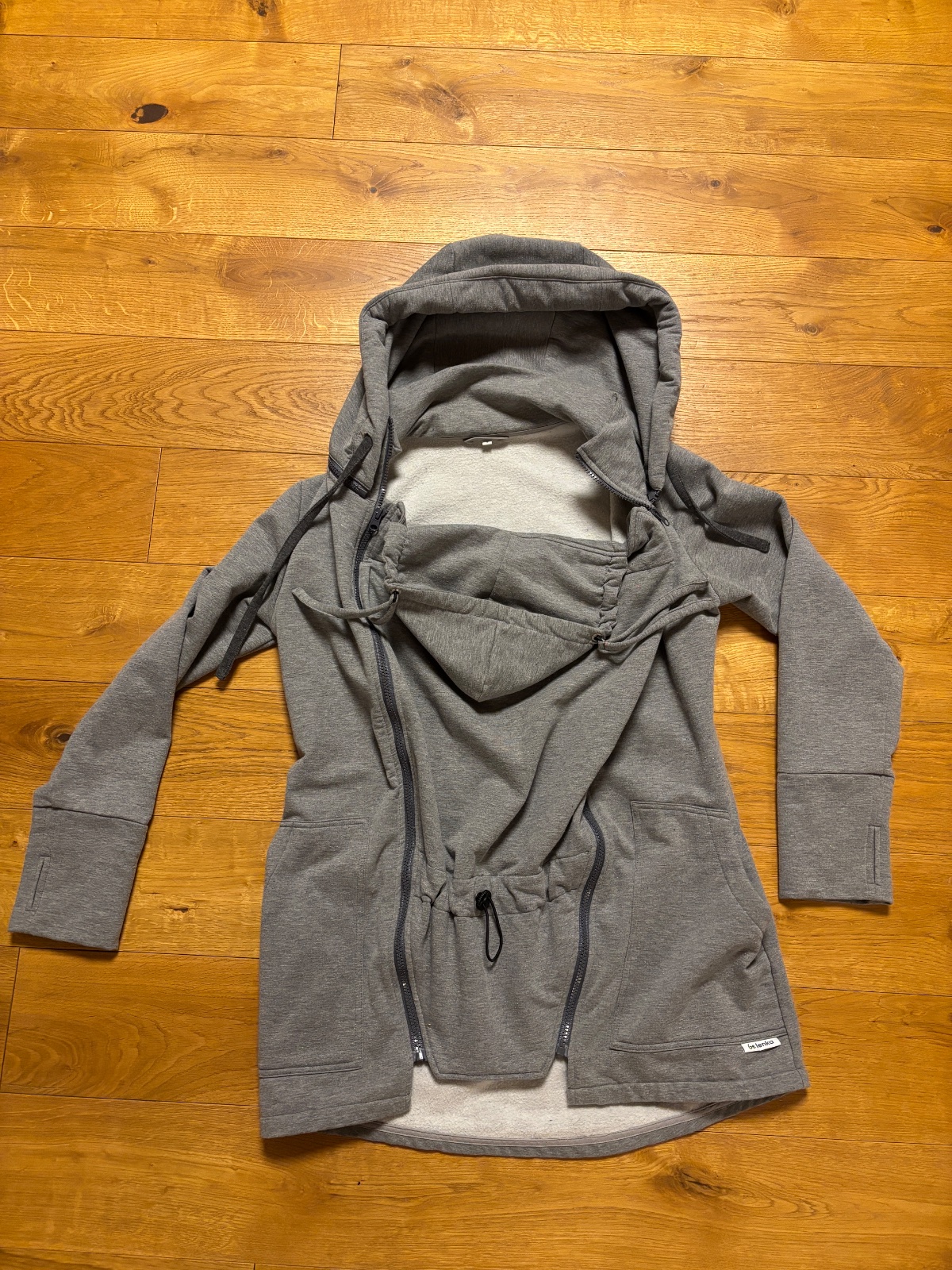 Nosicska mikina, zn. BeLenka, velkost S, s nakrcnikom, odnimatelna kapucna, da sa nosit aj samostatne bez vsadky pre babatko. Dlzka pod zadok.