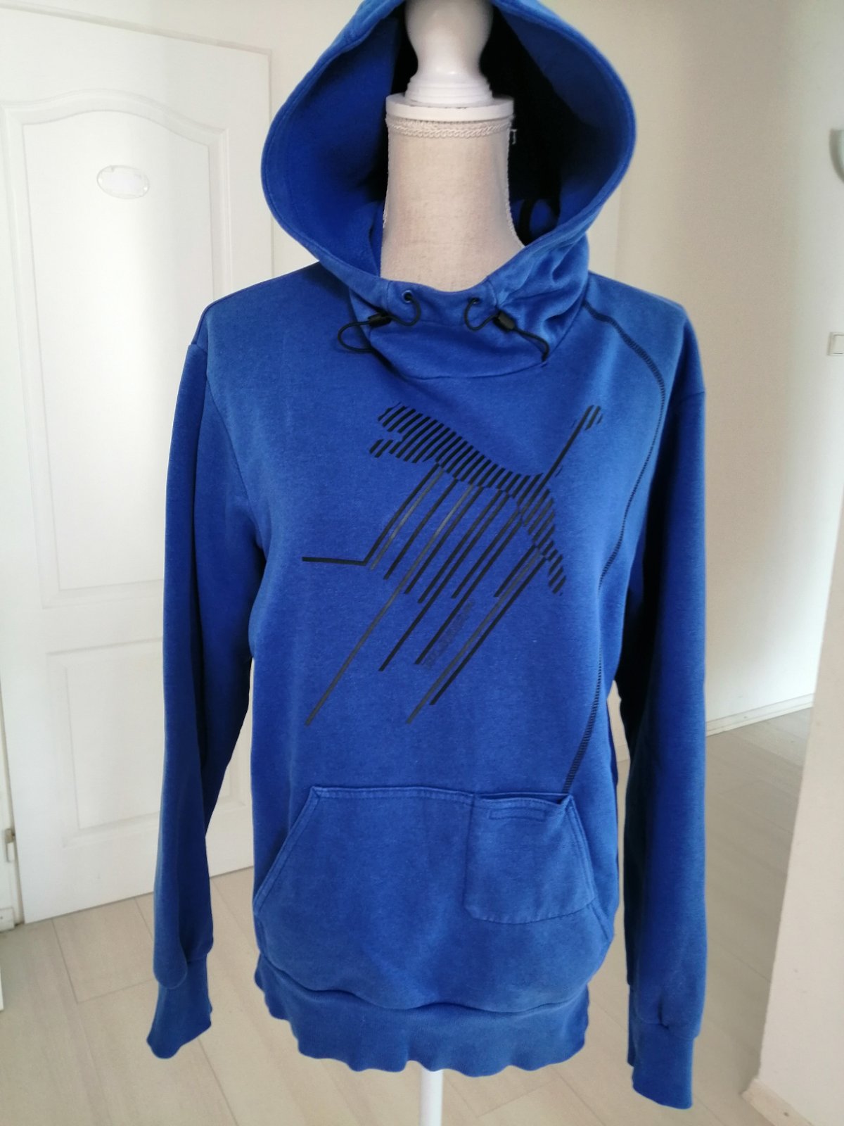 Modra znackova mikinka Puma, obvod hrudnika je 116 cm, rukavy od krku 80 cm a dĺžka je 69 cm.