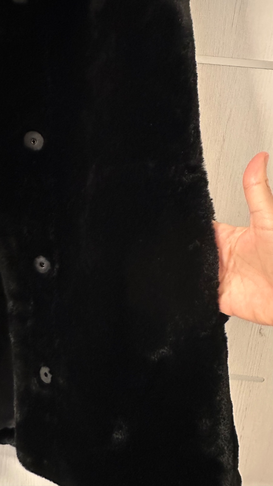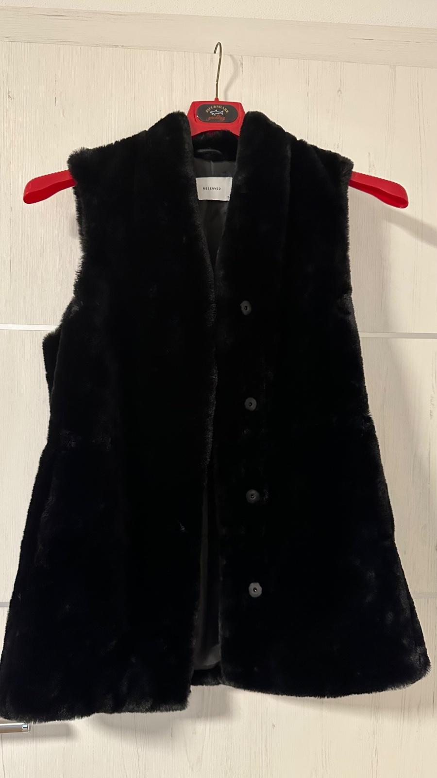 Vesta je nenosena, čierna, mäkká kozusinka, veľkosť S. Zapínanie na cvoky, vid.foto. Ma aj vrecka, tiež je vidieť na fotke.