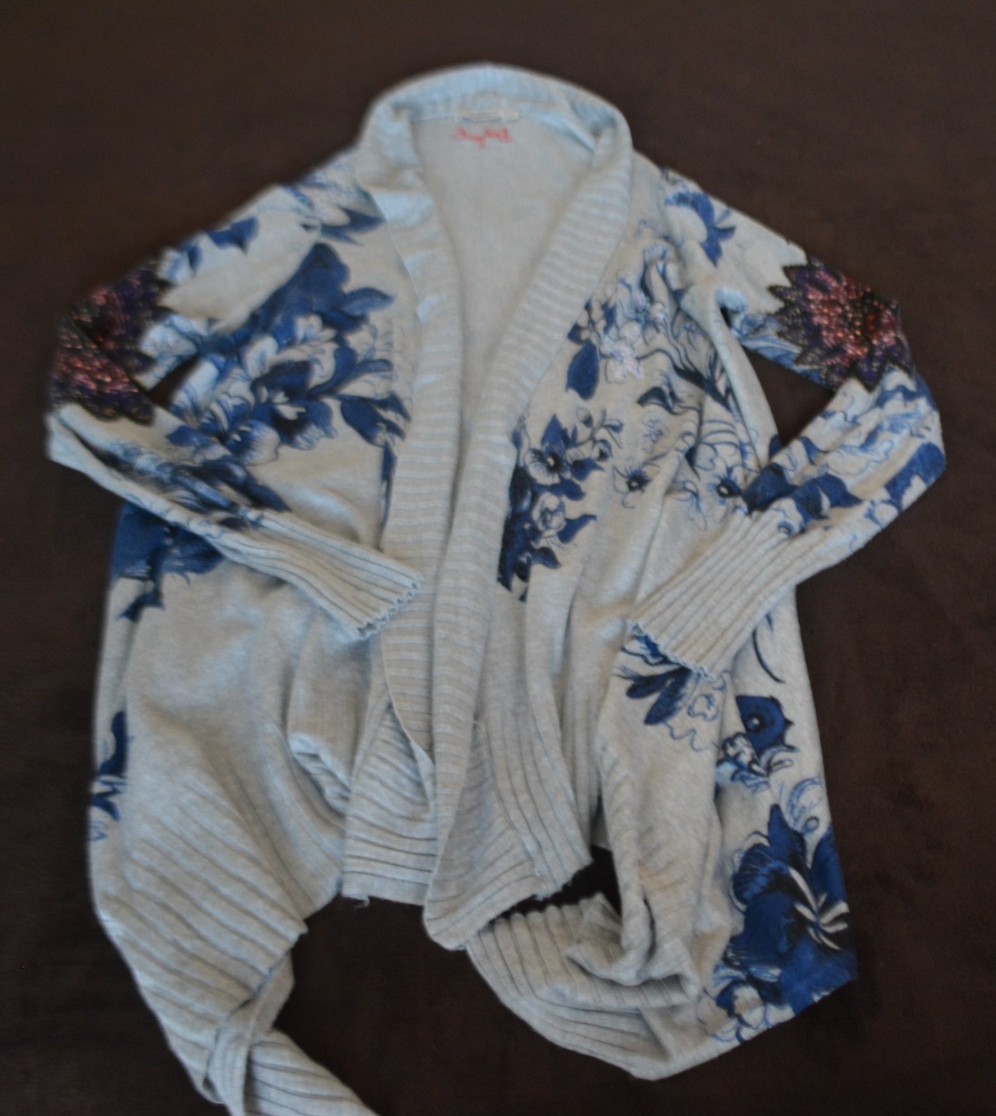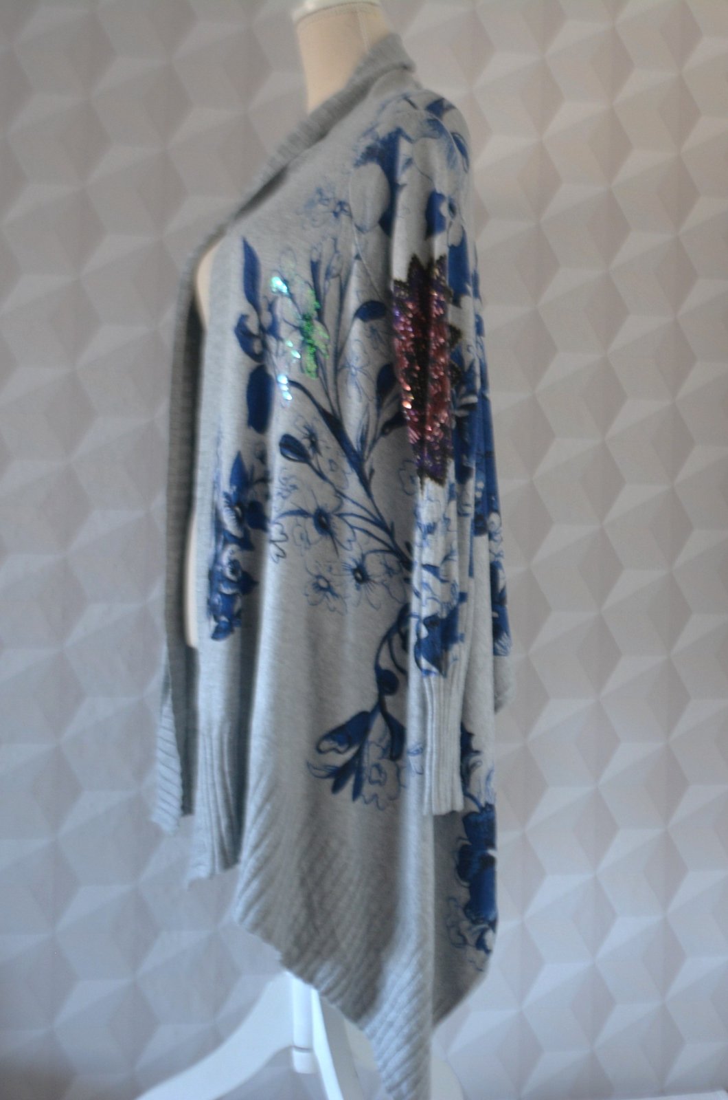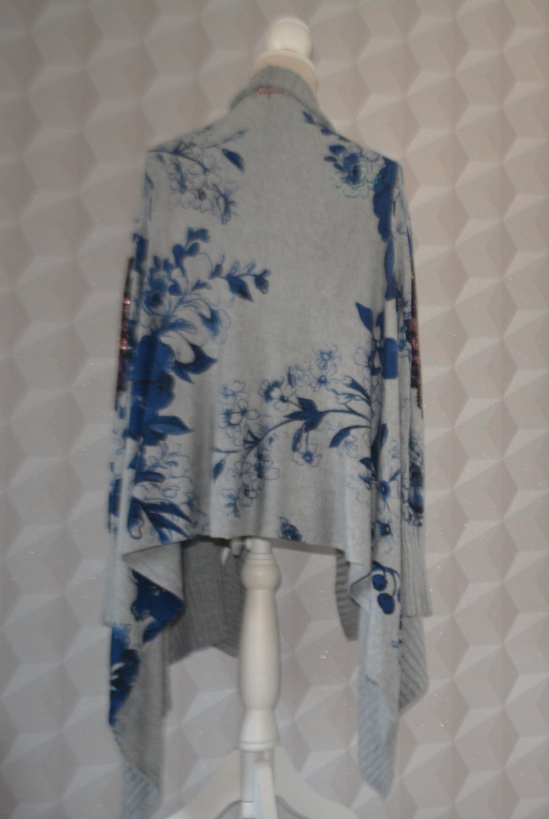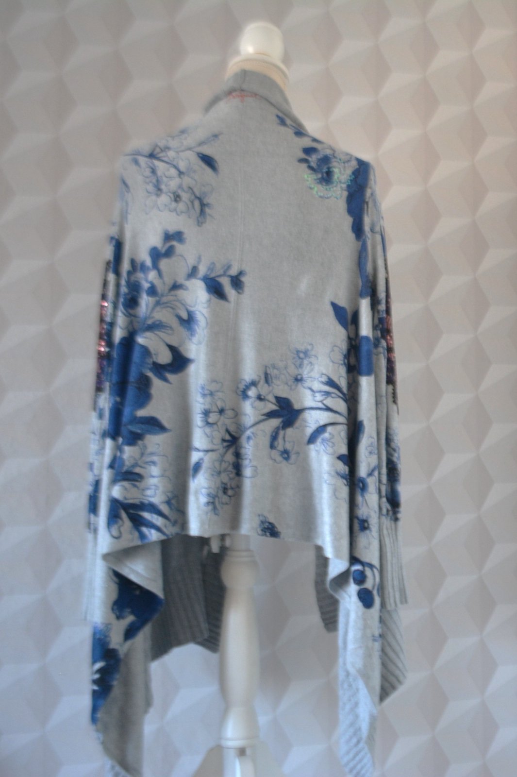 Dámsky asymetrický kardigán Desigual, veľ. M, rozmery: dĺžka vpredu 60cm, cípy 90cm, pod pazuchami 2x51cm, rukáv 64/50cm.