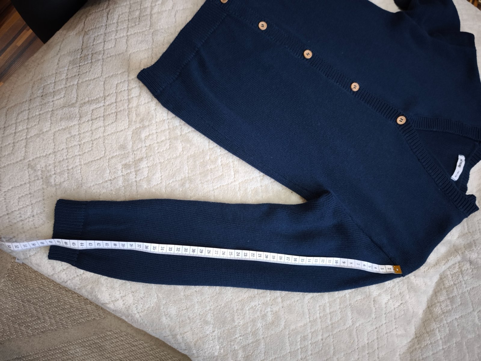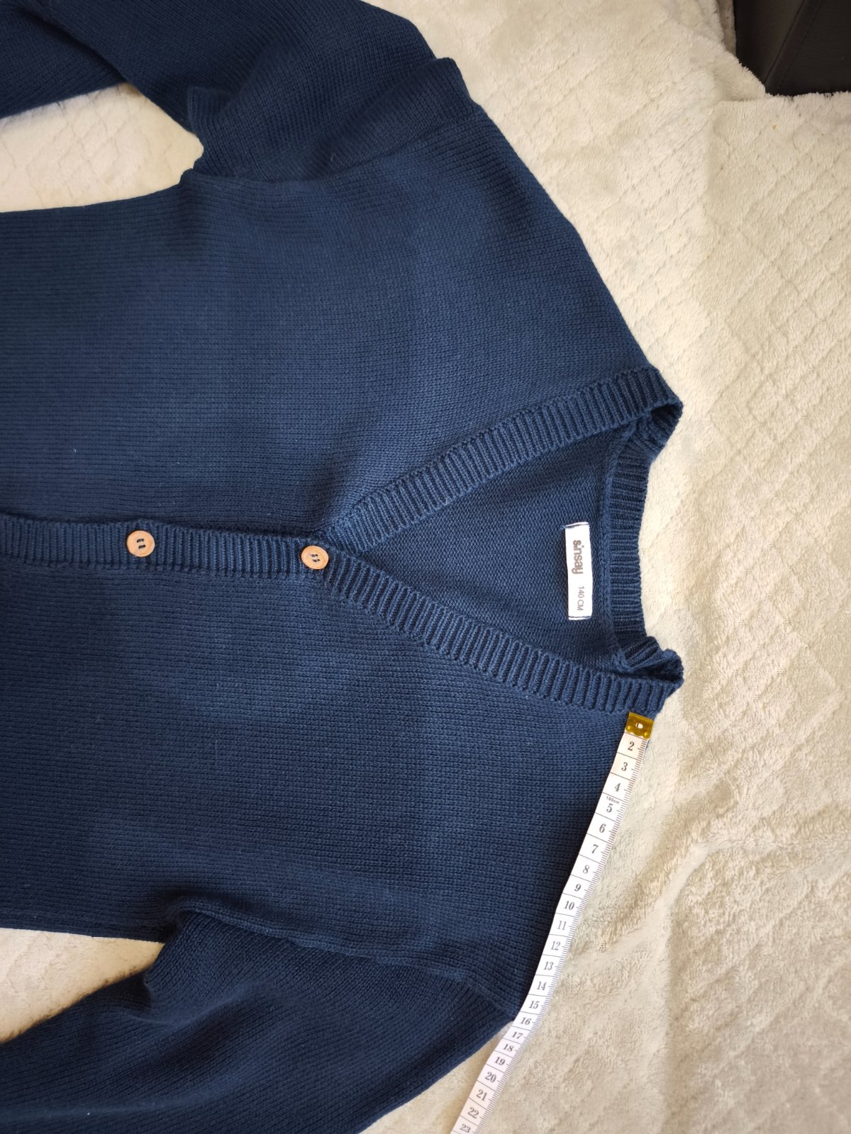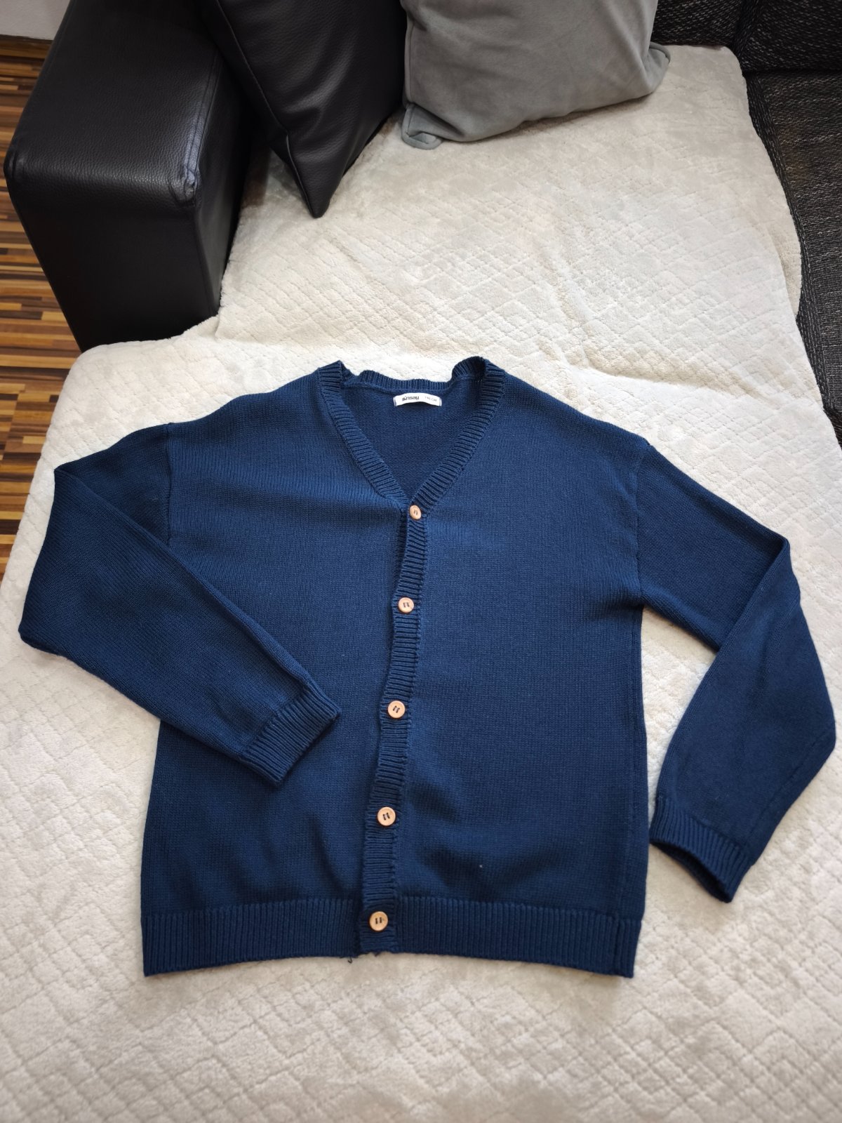 Sveter modrej farby, rozmery na foto. Veľkosť 140. Cena 6€ + pošta.