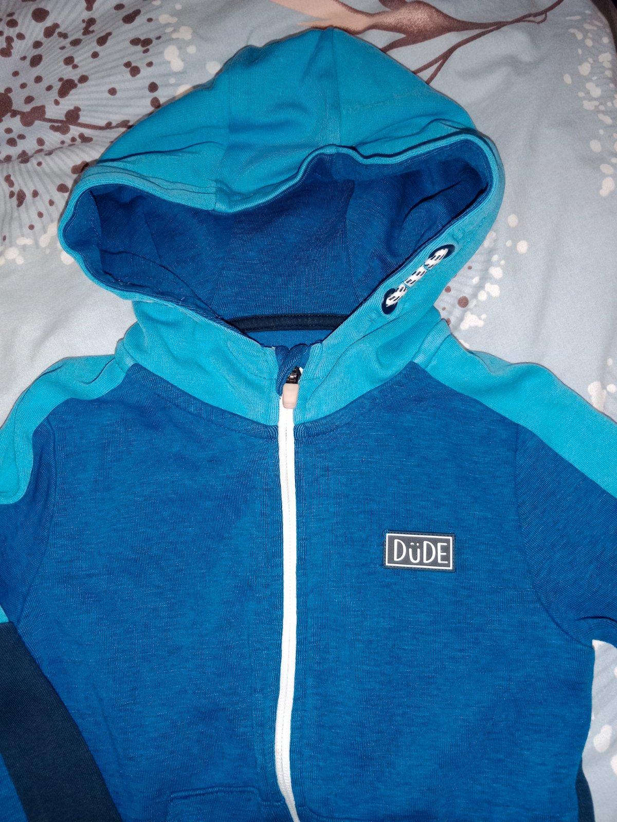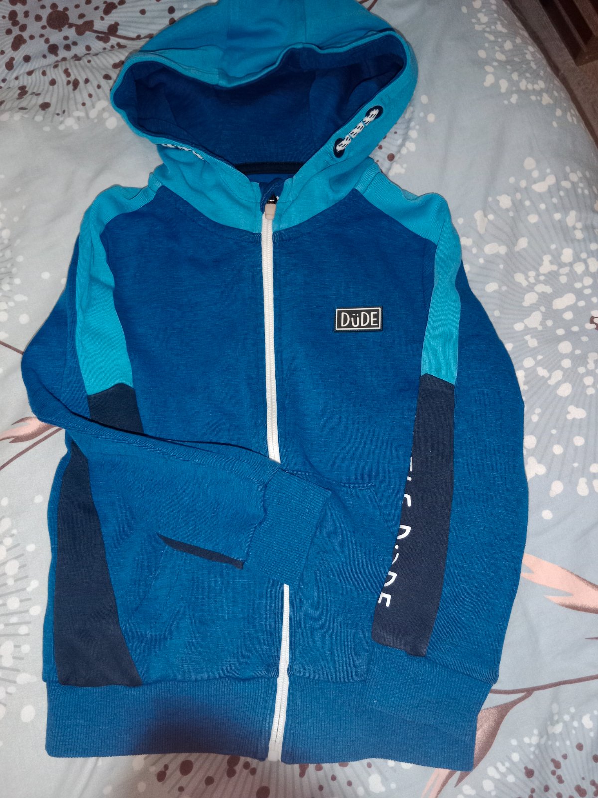 Mikina zn. F&F, s kapucňou, 1 vrecko (priechodné z oboch strán). Veľkosť udávaná 6-7 rokov, ale skôr si myslím, ze na 6 rokov. Pekná modrá farba. Používaná, ale do školy ešte poslúži.
