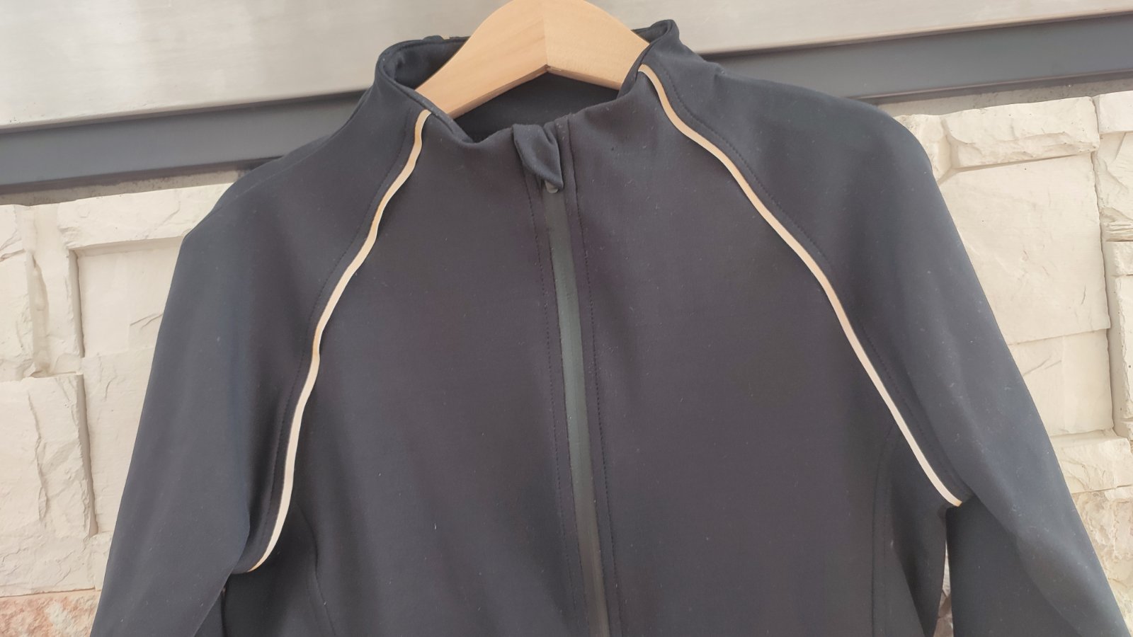 Ponúkam ciernu , pruznu sportovu mikinu , vodeodolná, zips s nepriepustnou membránou. Pekne obopne telo, mierne zakryje aj krk. Po bokoch vrecka, vzadu sieťovina , na odvádzanie potu, reflexné prvky.