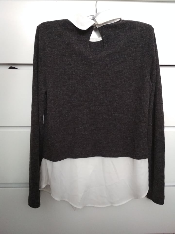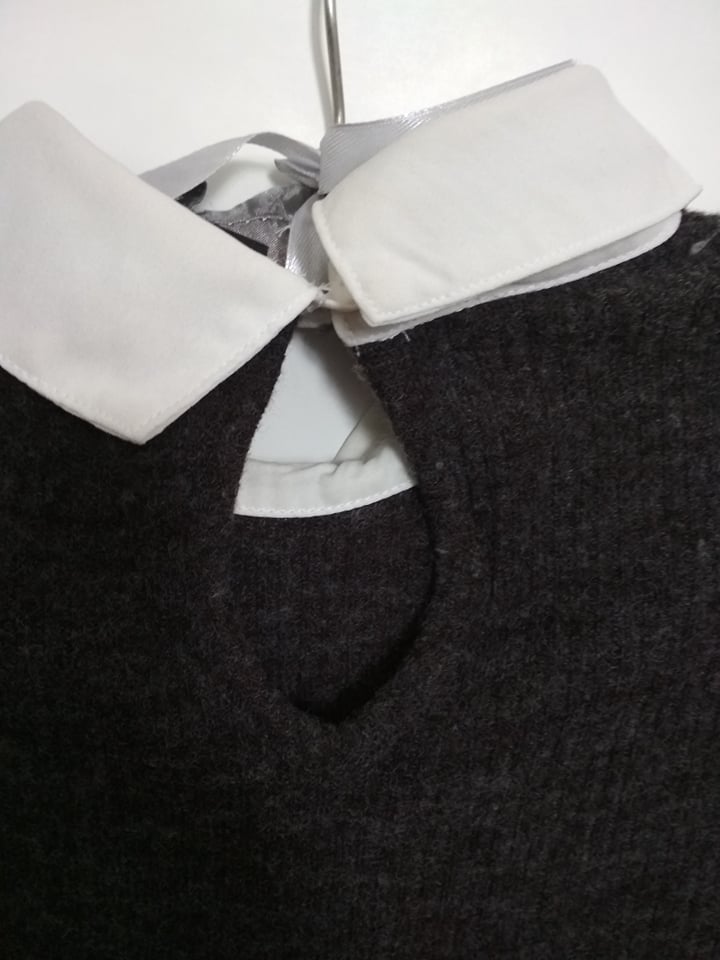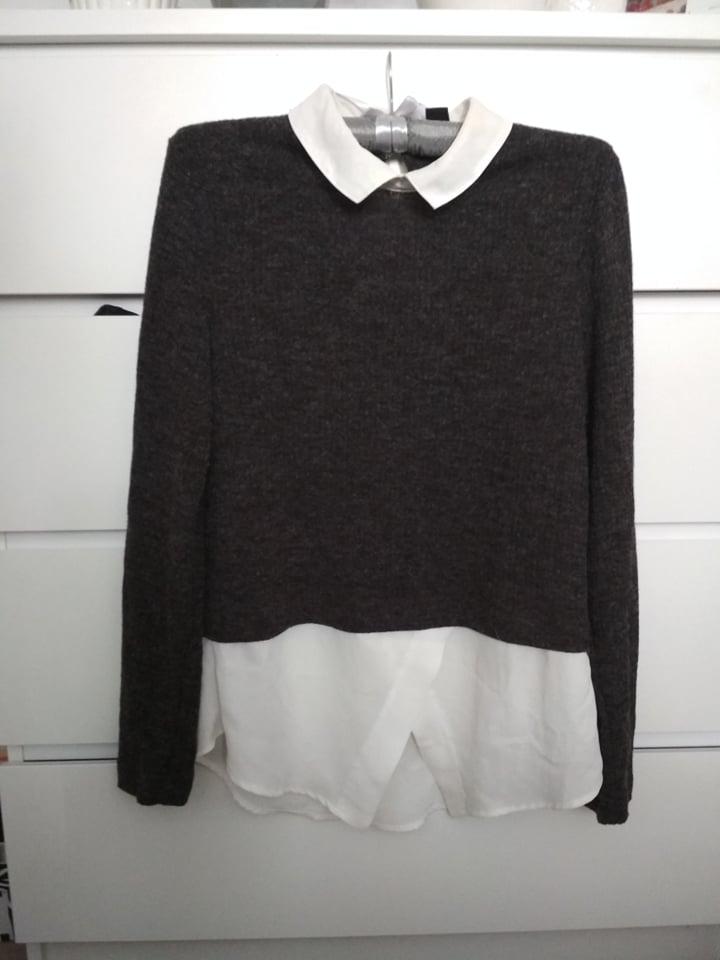 Šedý sveter s biely golierom
