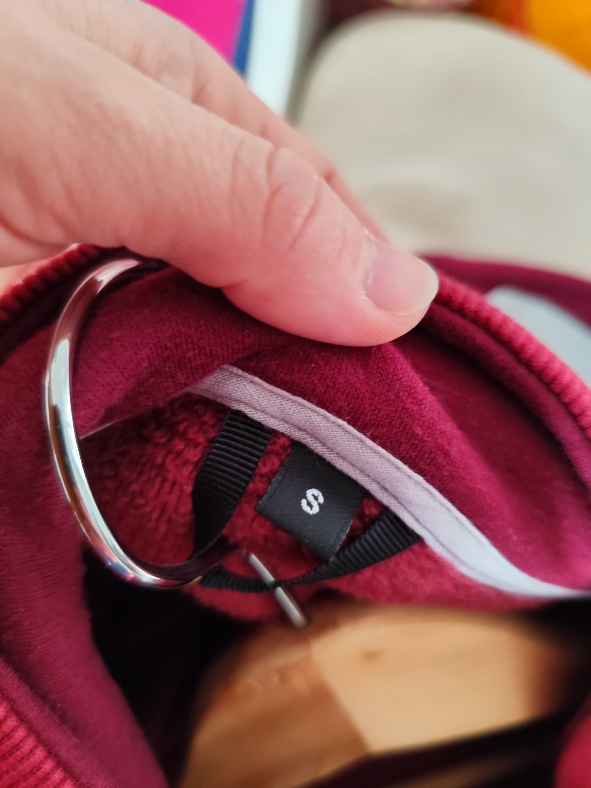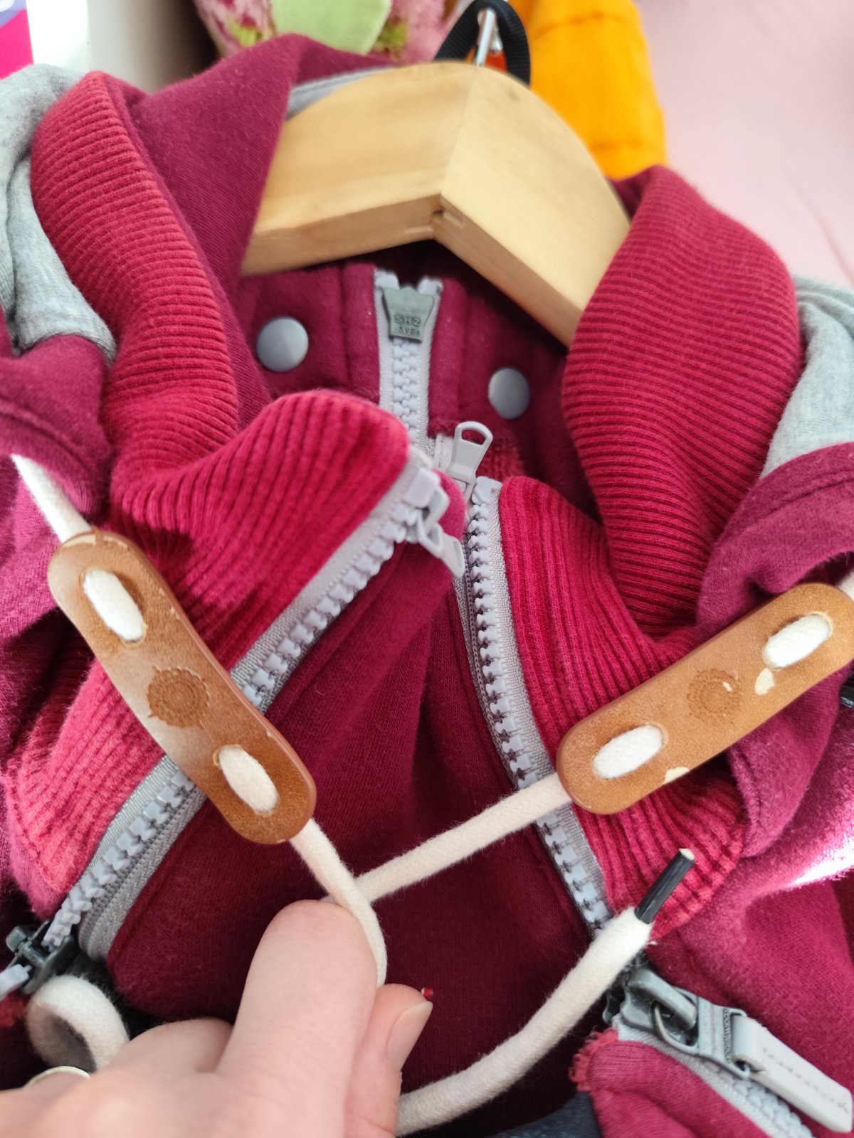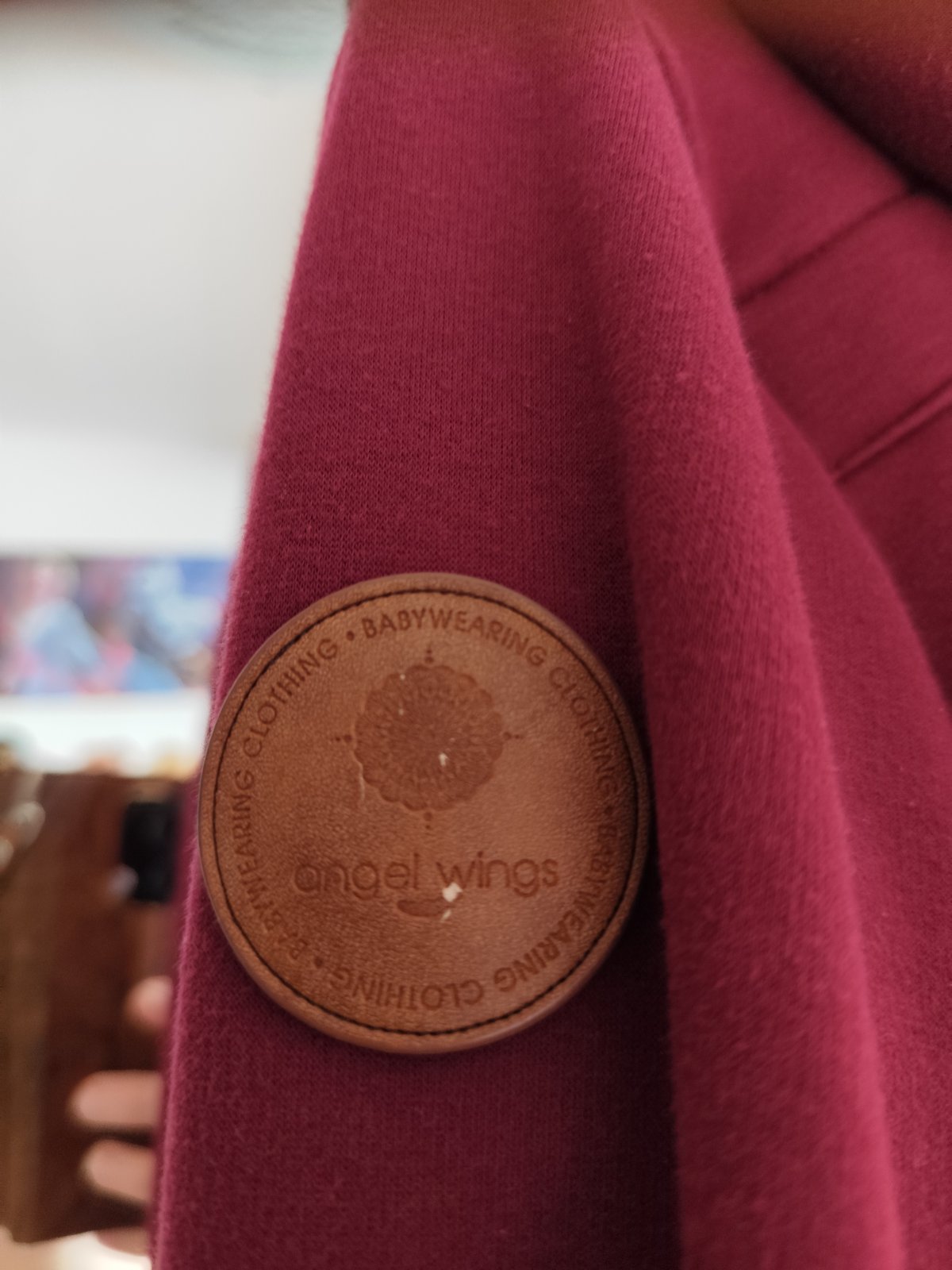 Mikina Angel Wings veľ. S. Ja nosím 38/40 a sedí mi dobre. Má mierne vyblednuté náplety, šuchnutú koženku na šnúrkach, nášivke, inak vo veľmi peknom stave. Vnútri má hrejivý chĺpok. Mikina je vhodná na predné aj zadné nosenie, má vsadku pre dieťa a krytie krku pre mamičku.