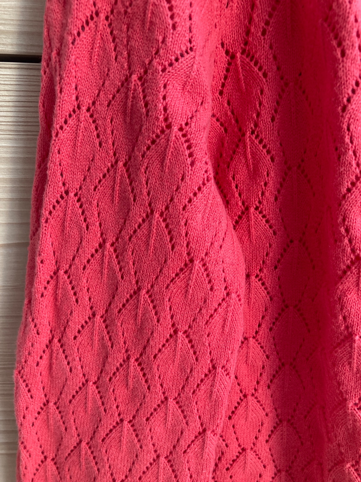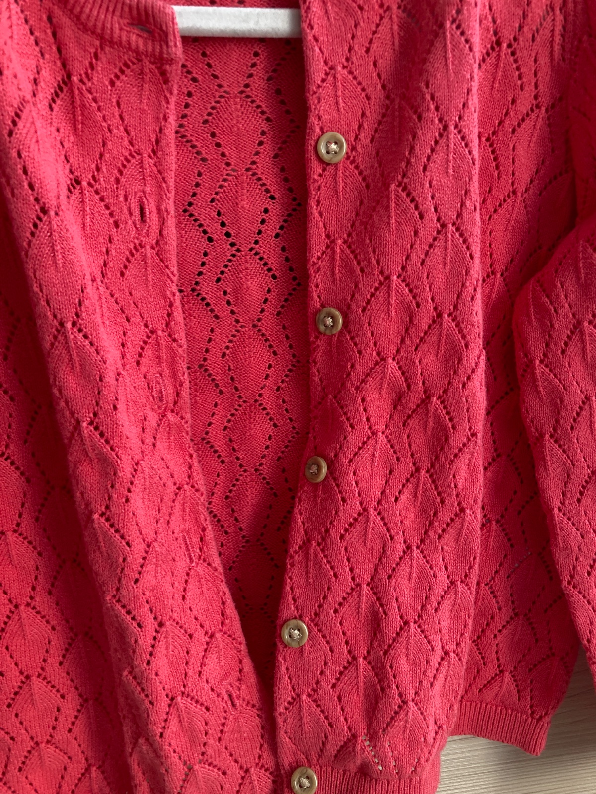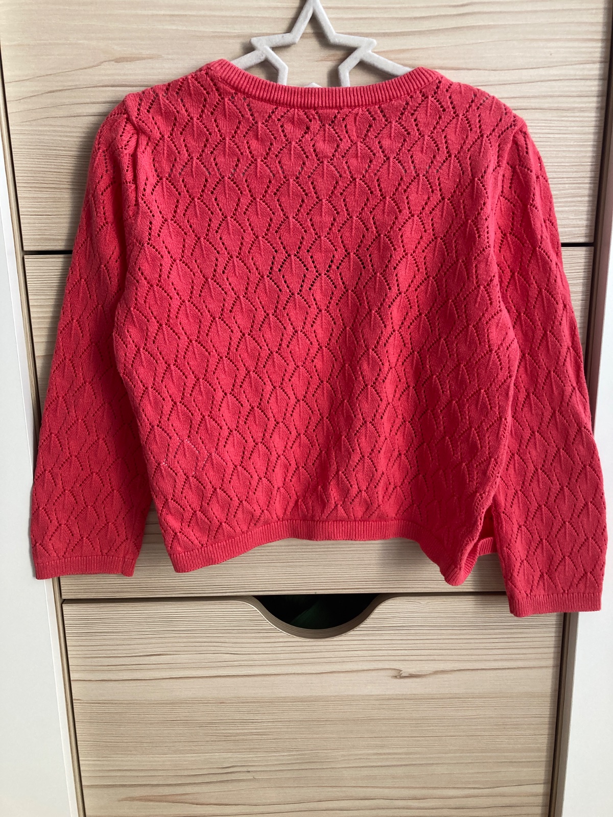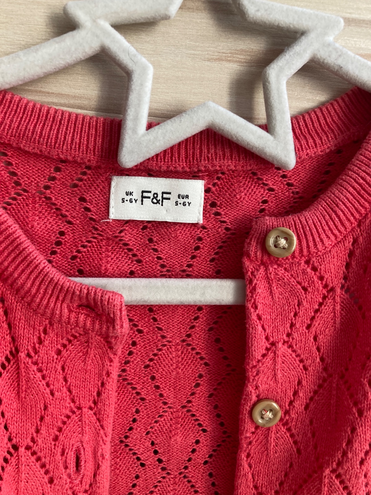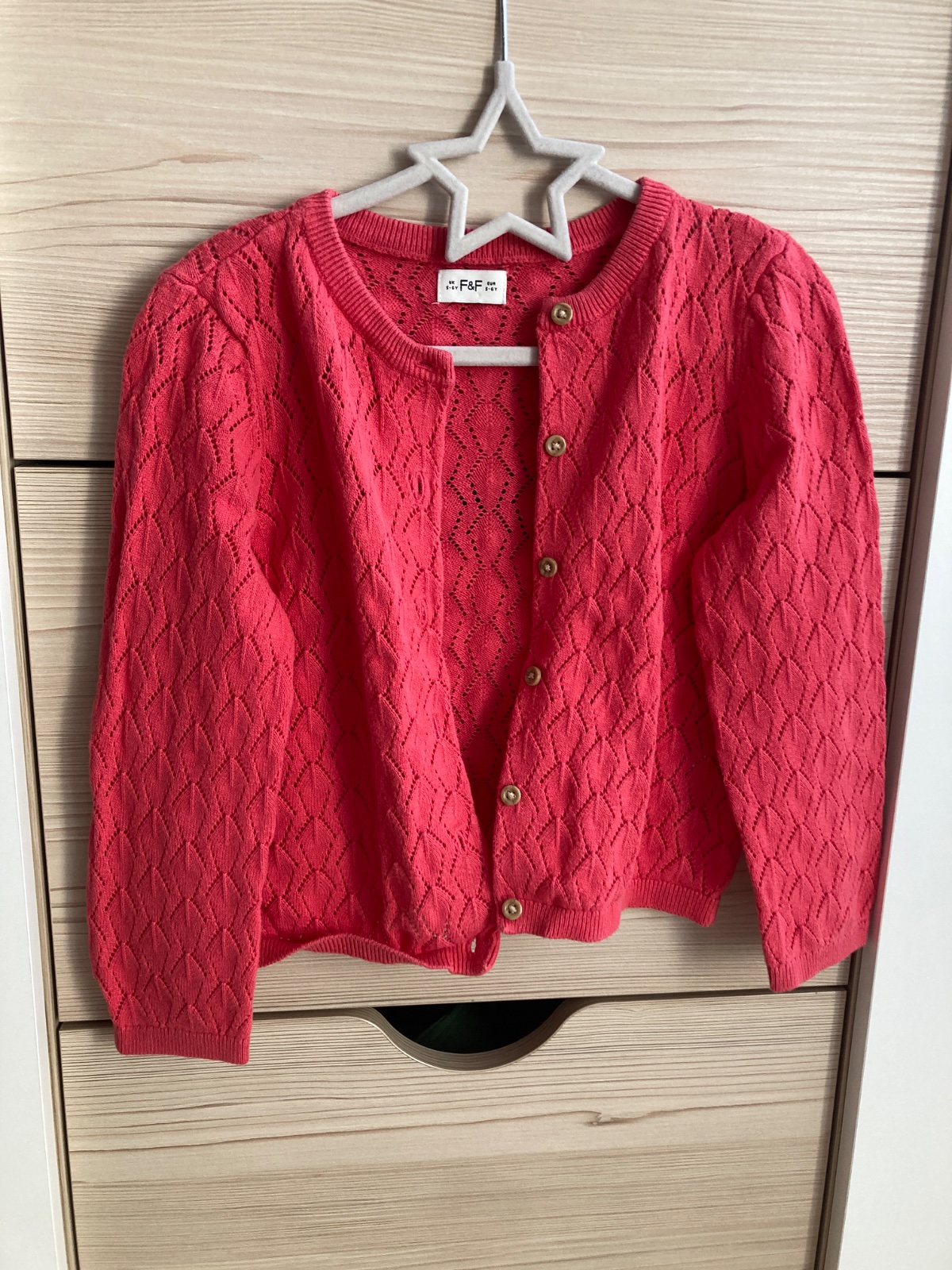 Ponukam na predaj dierkovany akoby hackovany kardigan FaF. Krásny kusok na leto. Ma skôr malinovu farbu. Nosený výnimočne. Ako novy. Visacka udava velkost 116, kľudne nositelny od 110. Kupovany novy, noseny 1 dieťaťom.