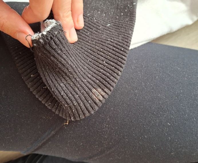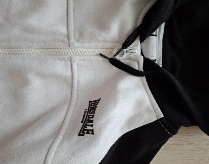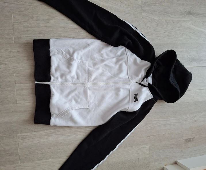 Nosená, čo vidno aj na pracom chĺpku, ktorý je po celej mikine. Má fliačik zvnútra (viď foto), ktorý pri nosení nie je vidno. Nemá žiadne trhliny ani iné poškodenia, takže sa dá ešte donosiť. Má kapucňu a zapínanie na zips. Kupovaná zo Sportsdirect, uvedená je veľkosť 8, sadne na S (ako mierne volnejšia)
