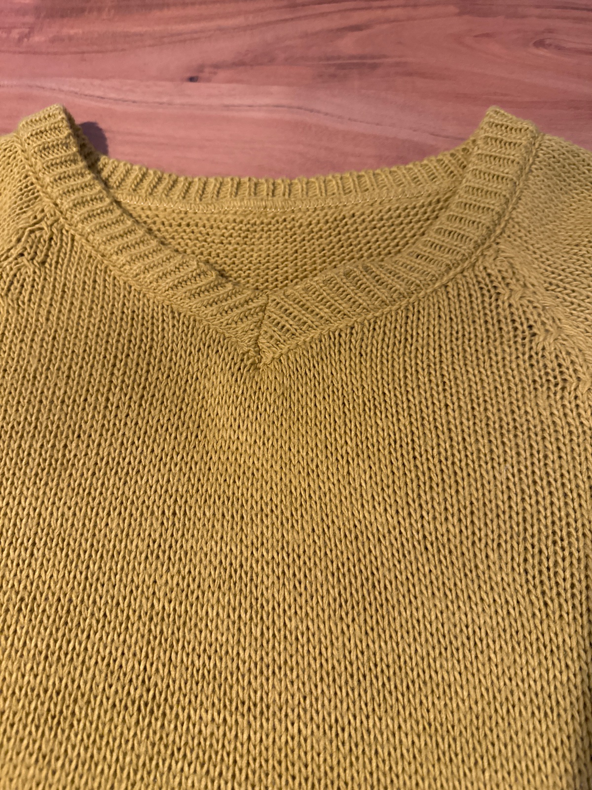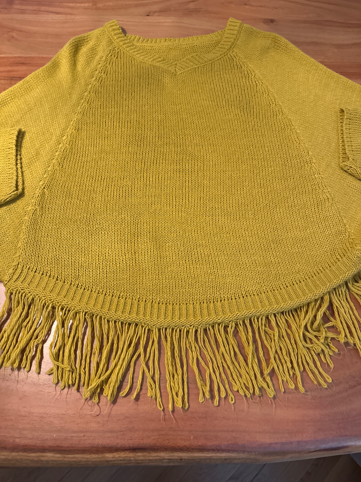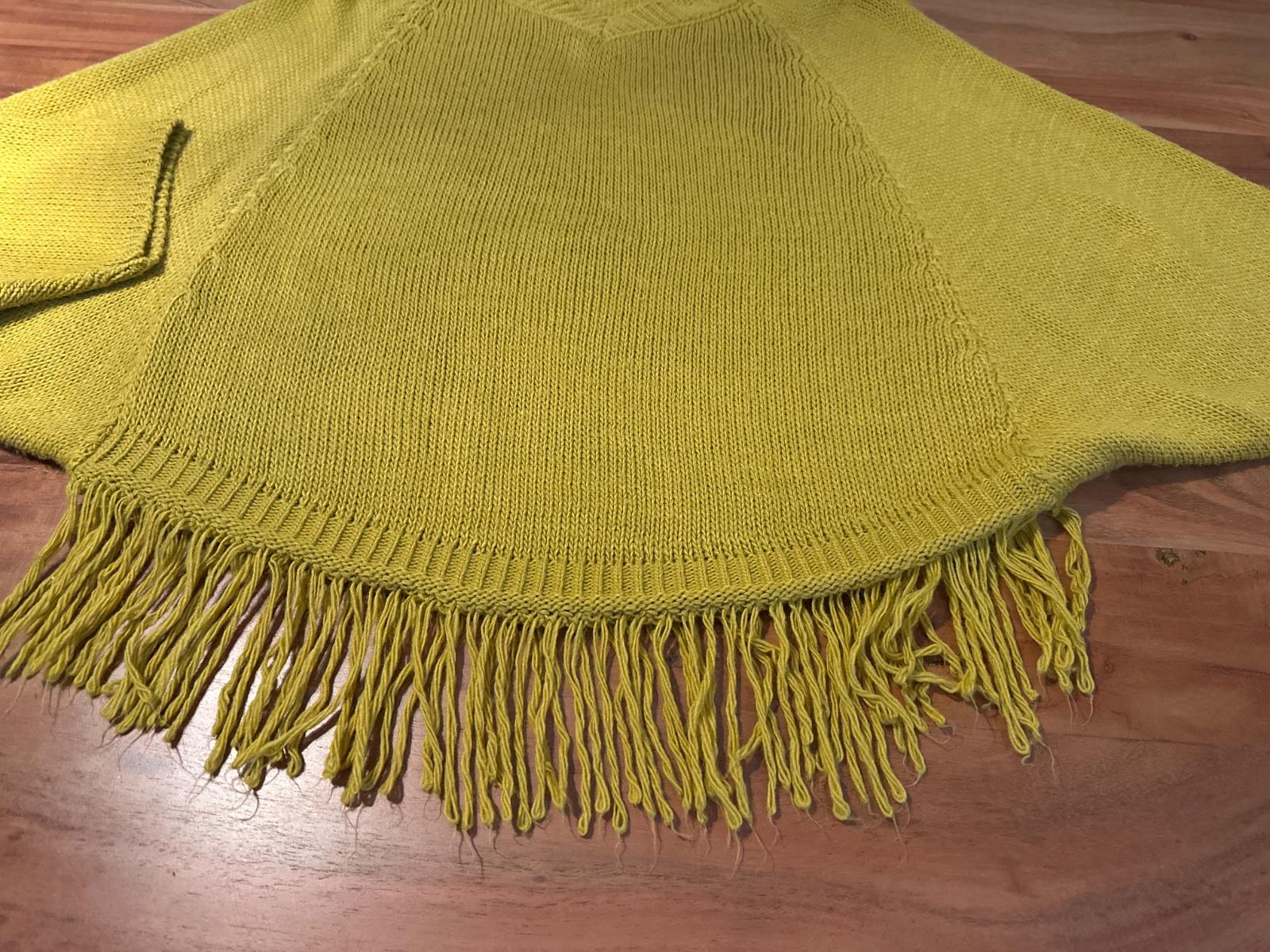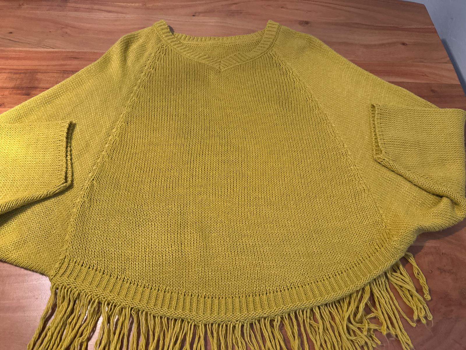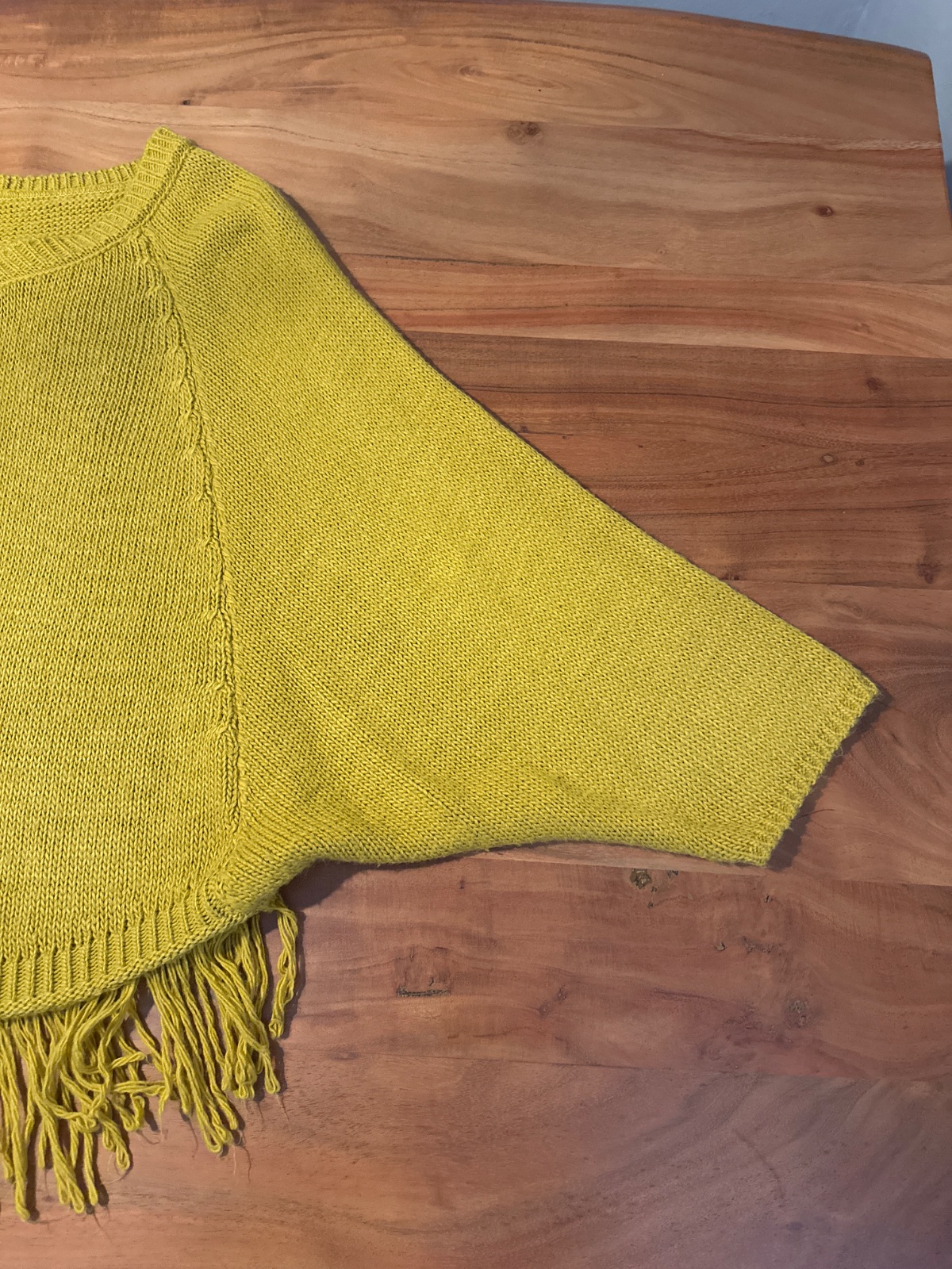 Zaujímavý pletený pulover so strapcami. Mäkký, ľahký. Odtieň slnečnicová žltá. Výstrih do V, raglánový 3/4 rukáv. Sedí aj na menšine M. Bez poškodení. Dĺžka 68 cm, rukáv od krku 63 cm, šírka hrudník cca 2 x 53 cm.