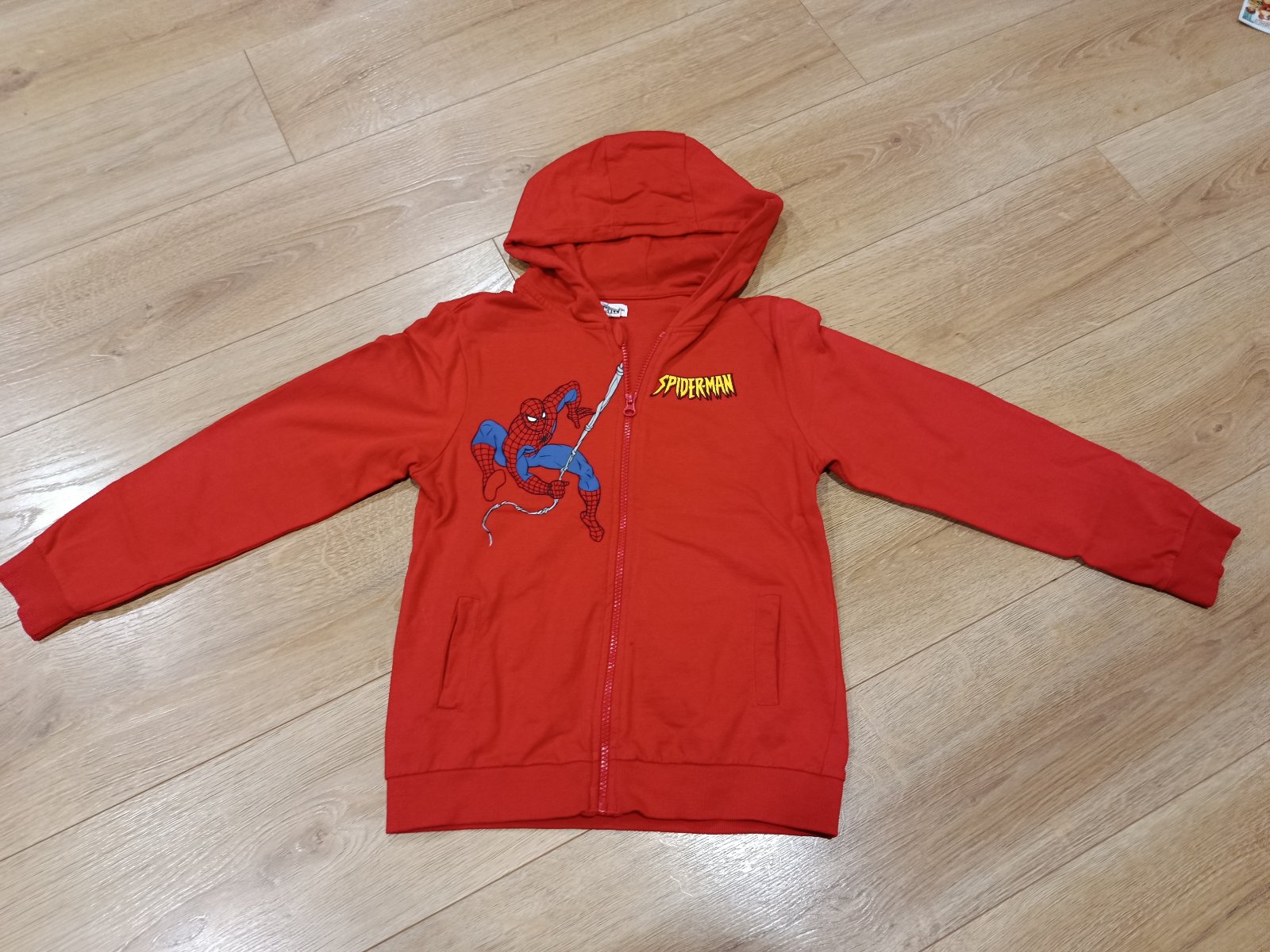Pekná červená mikina Spiderman, veľ. 140, šírka 40 cm cez prsia v nenatiahnutom stave, 50 cm dĺžka, zips, kapuca, vpredu vrecká, v super stave, cena symbolická.