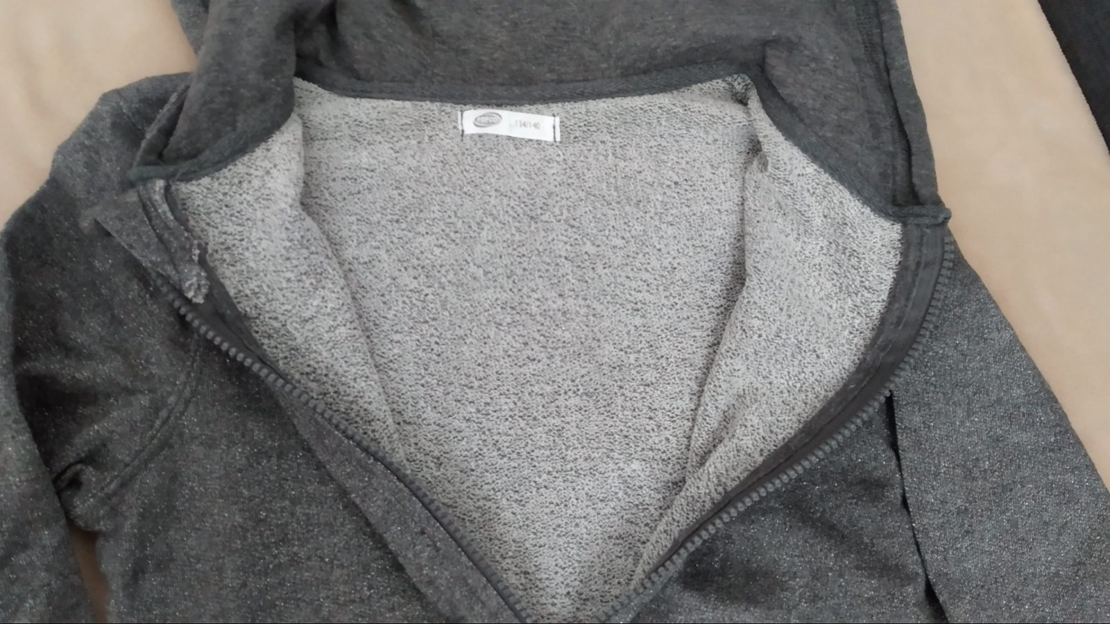 Svetlosivá mikinka so striebornými nitkami (efekt akoby bola trblietkavá ale nedá sa to nafotiť).