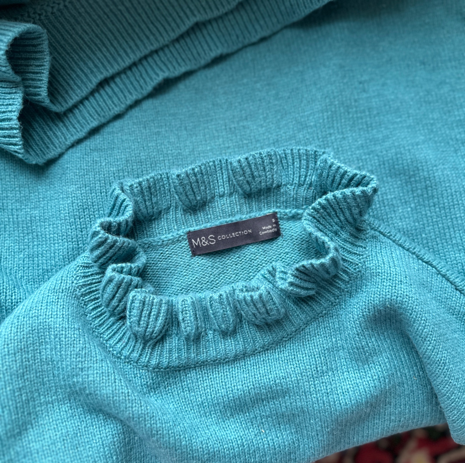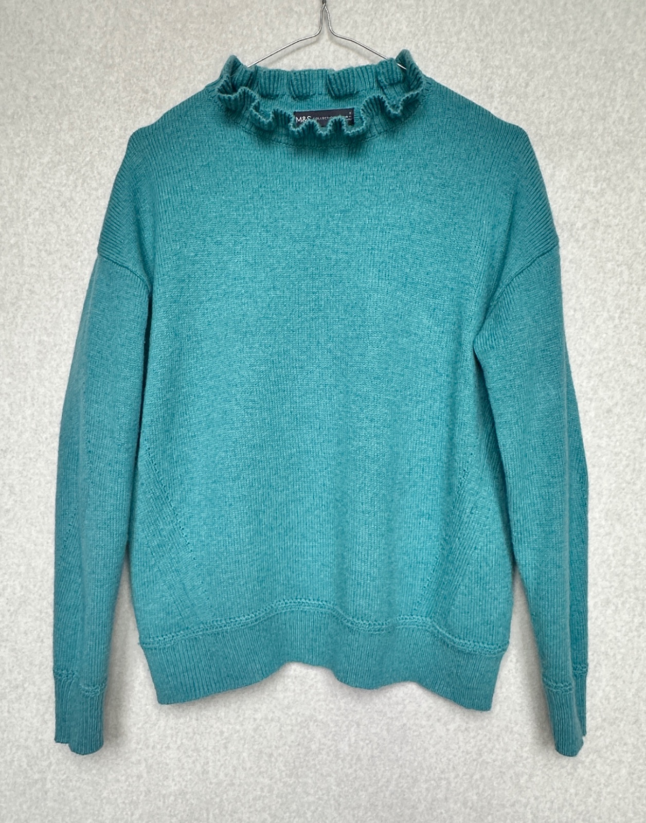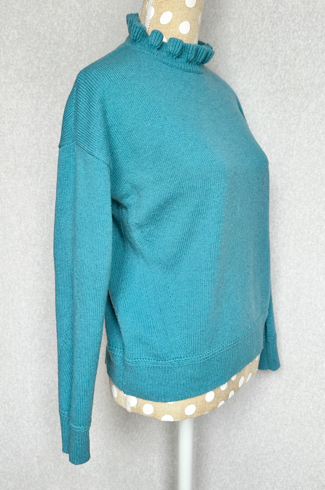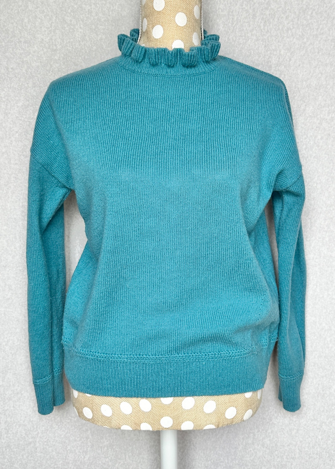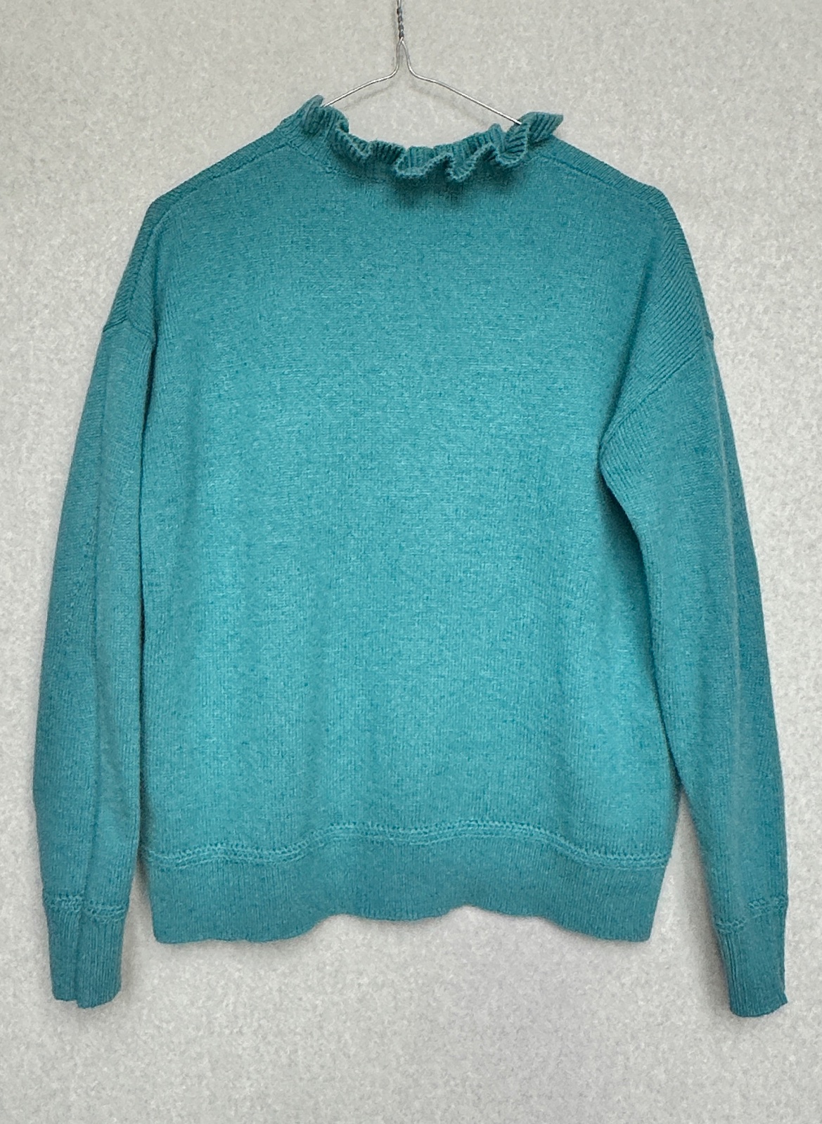 Príjemný pulóver s jemným volánikom okolo krku - dodáva mu viac ženskosti. Bez žmolkov, dier, či fľakov, nepichá.