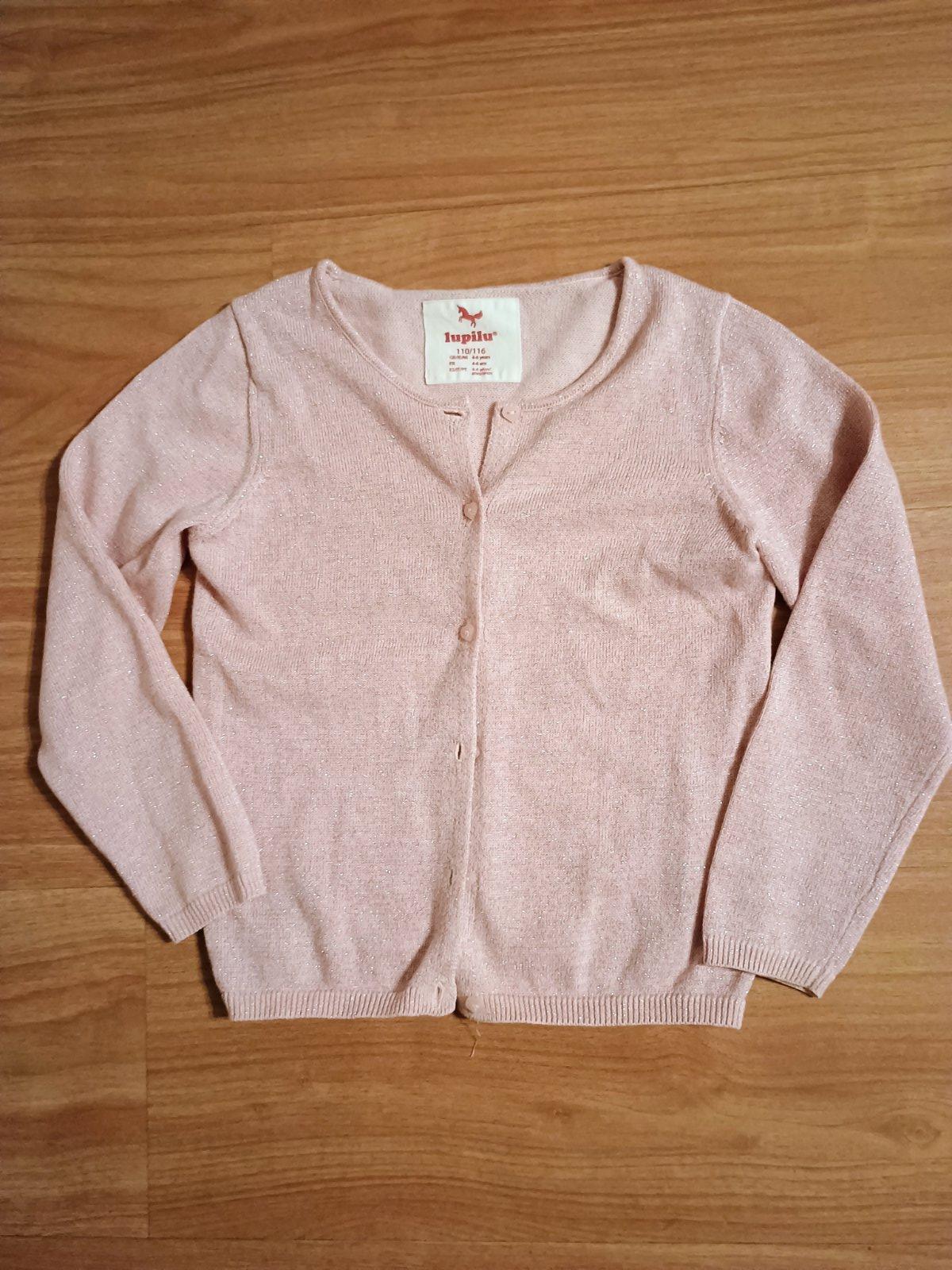Krásny ružový lesklý svetrík so srdiečkovými gombíkmi, dĺžka rukáva od krku 48 cm, šírka 2x34 cm