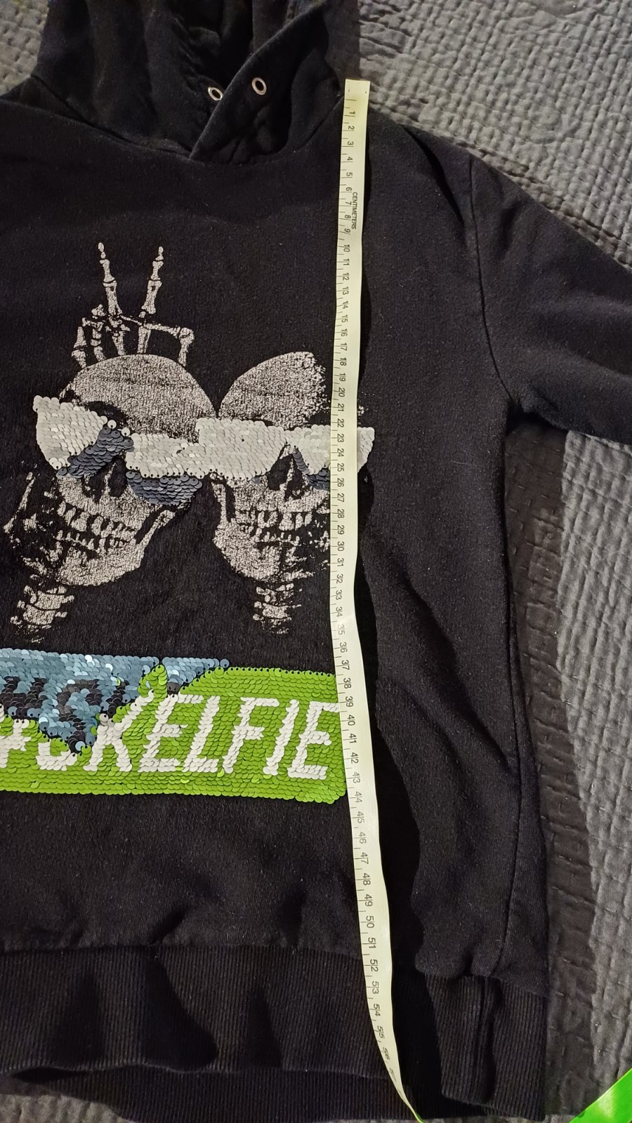 1. s kostrou a kapucňou, dĺžka je 56,5 cm a rukáv od krku je 62,5 cm.