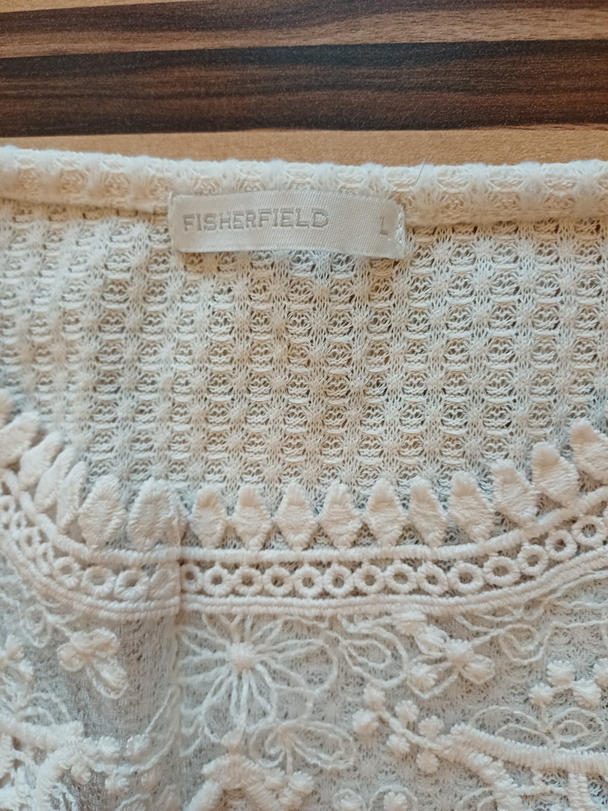 Pulóver zn. Fisherfield, veľ. L. Farba prírodná biela, vo výstrihu čipka. Rovnaký mám aj v čiernej farbe. Rozmery: dĺžka od ramena po spodný okraj 55 cm, dĺžka rukáva 44 cm.