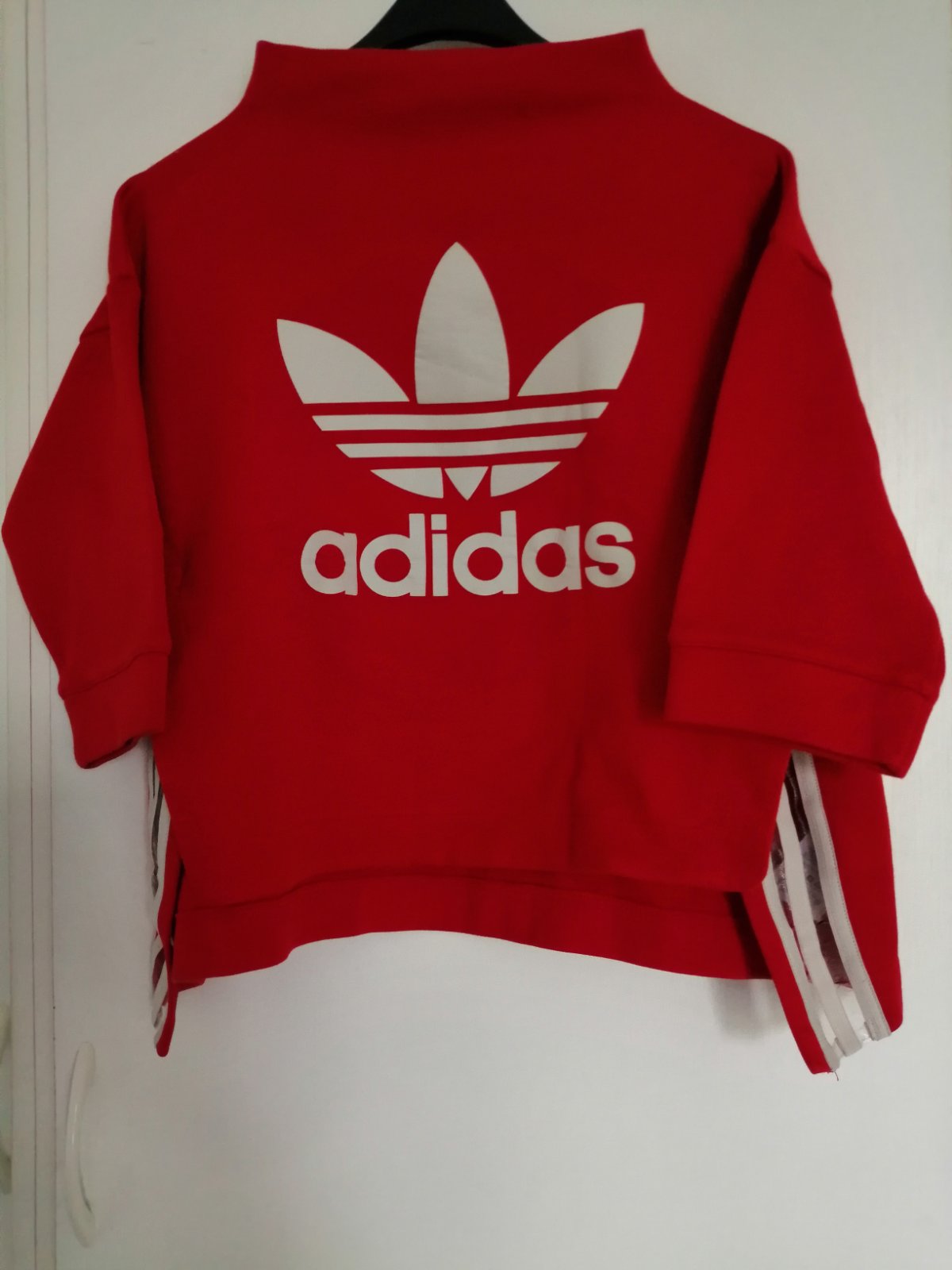Znackova mikinka Adidas vel. S, nenosena, obvod hrudnika je 102 cm, rukavy su 3/4, dĺžka je 41 cm a dĺžka mikiny je 44-50 cm, vzadu je dlhsia, je atypicky vypracovana, v skutočnosti velmi pekná, foto farby skresluje, je jasno červená