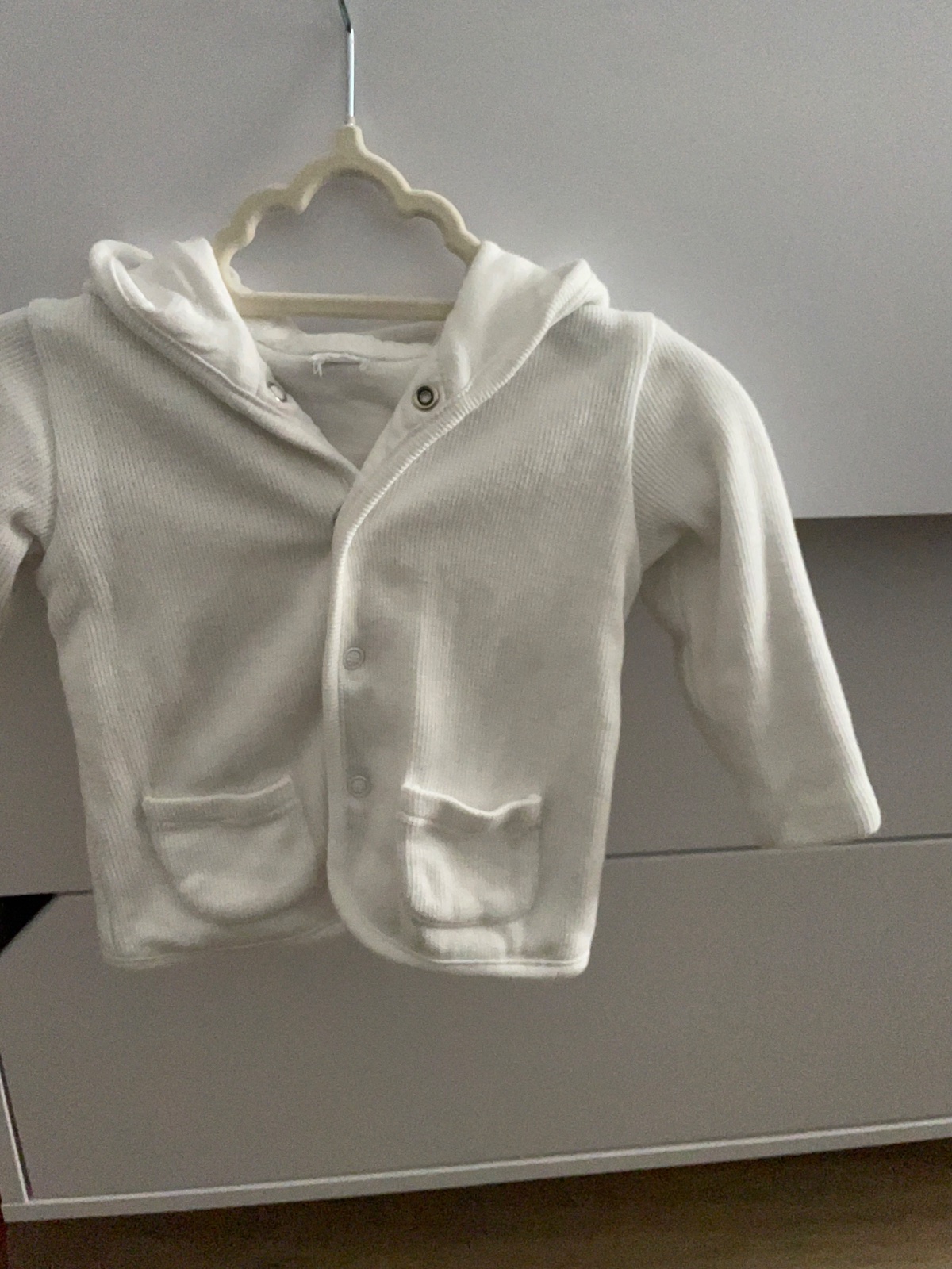 snehovo biela mikina na zips s kapucňou z jemného fleesu, vrecká+náprsné vrecko na zips, pekná, v dobrom nosenom stave, materiál 100 % polyester, Merajte: šírka pod pazuchami = 60 cm, šírka v páse ...