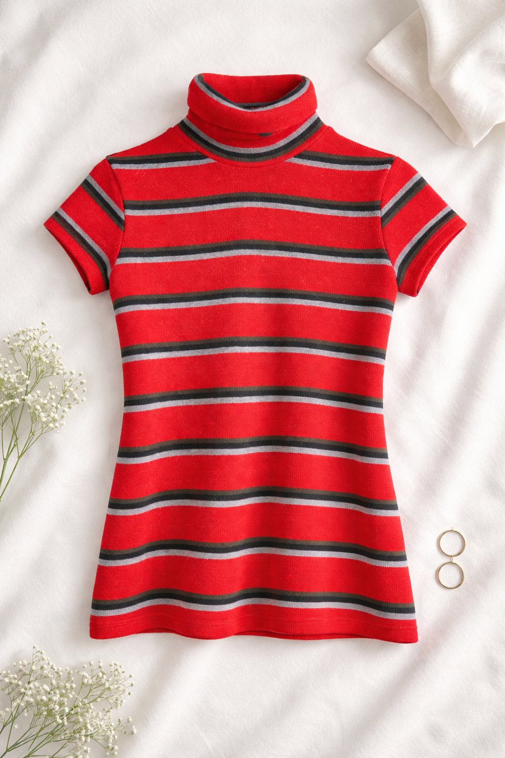 Elegantný dámsky sveter v sýtej červenej farbe s jemnými vodorovnými pruhmi v odtieňoch sivej a čiernej. Má krátky rukáv a rolák, vďaka čomu pôsobí štýlovo a nadčasovo. Sveter je ideálny na prechodné obdobie – dá sa nosiť samostatne alebo vrstviť pod sako či kabát. Vhodný do práce, na bežné nosenie aj na neformálne stretnutia.
