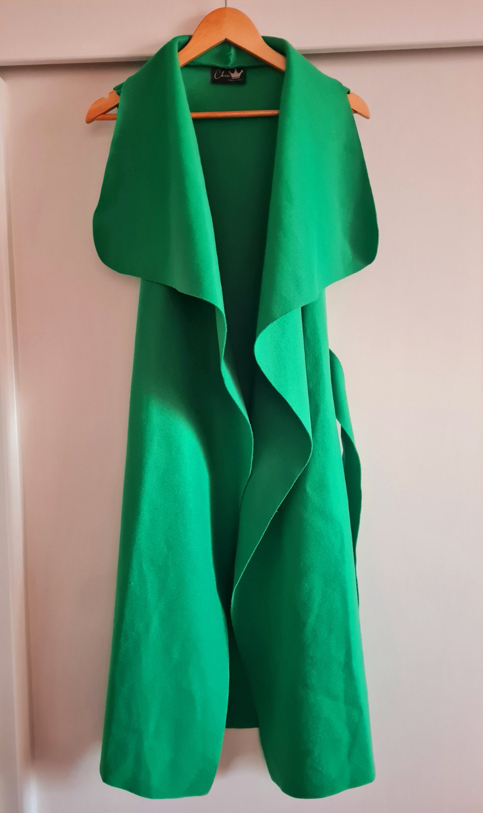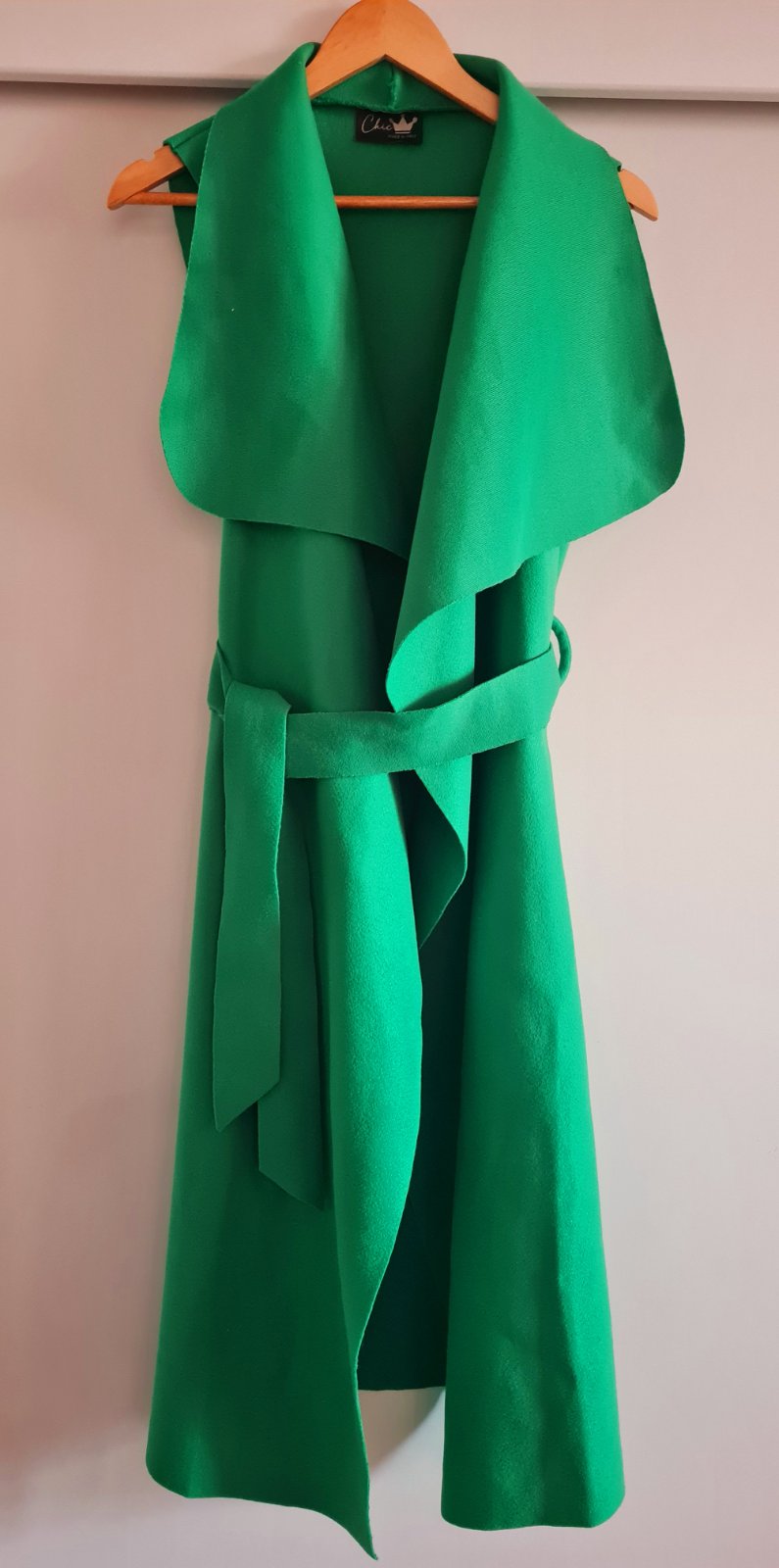 Dva krat oblecena vesta bez zapinania, zaväzovanie je na opasok, velkost univerzalna, ja mam vel.38, farba syto zelena